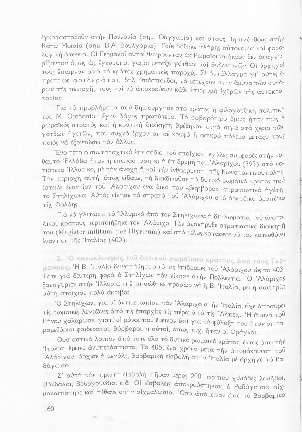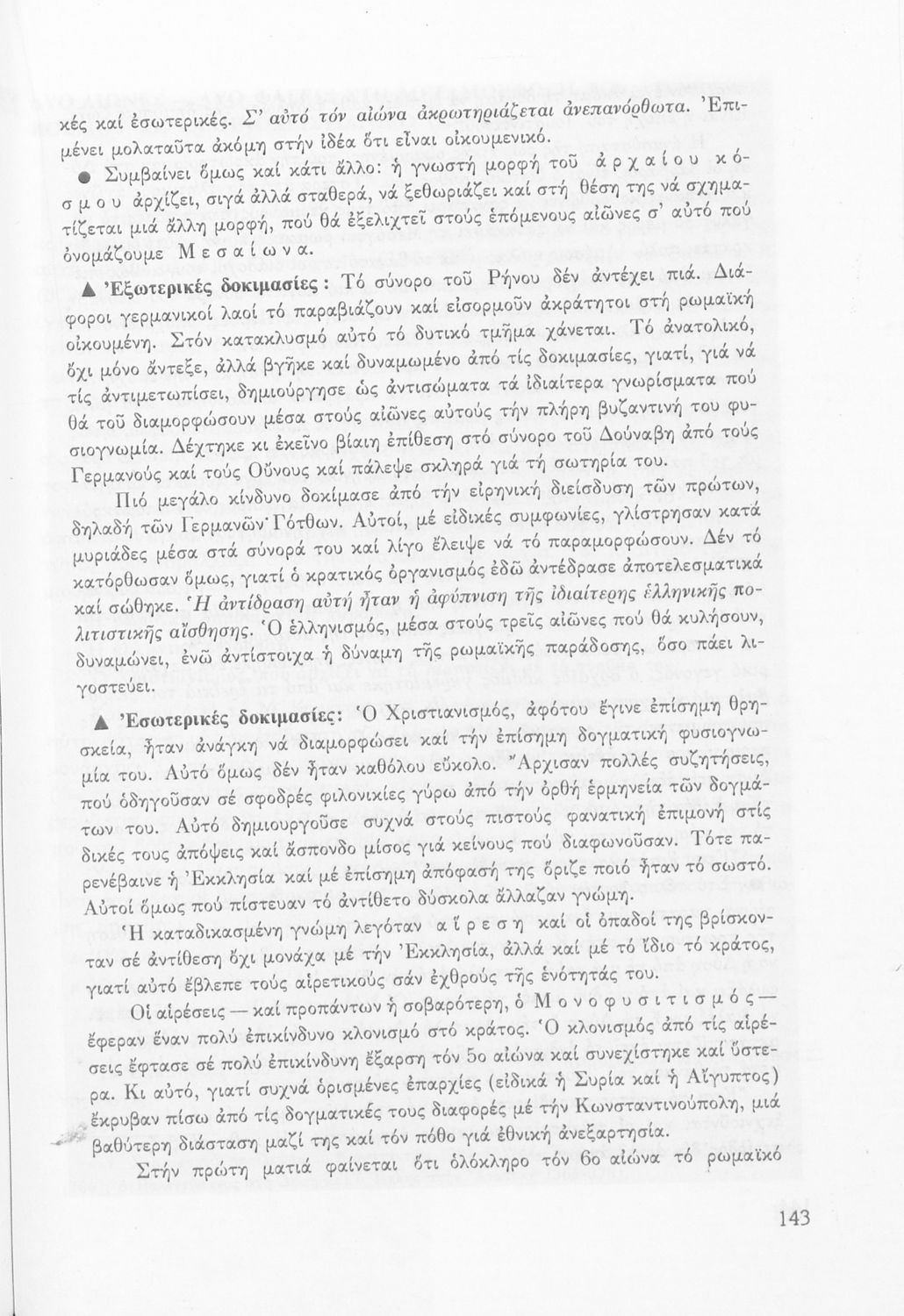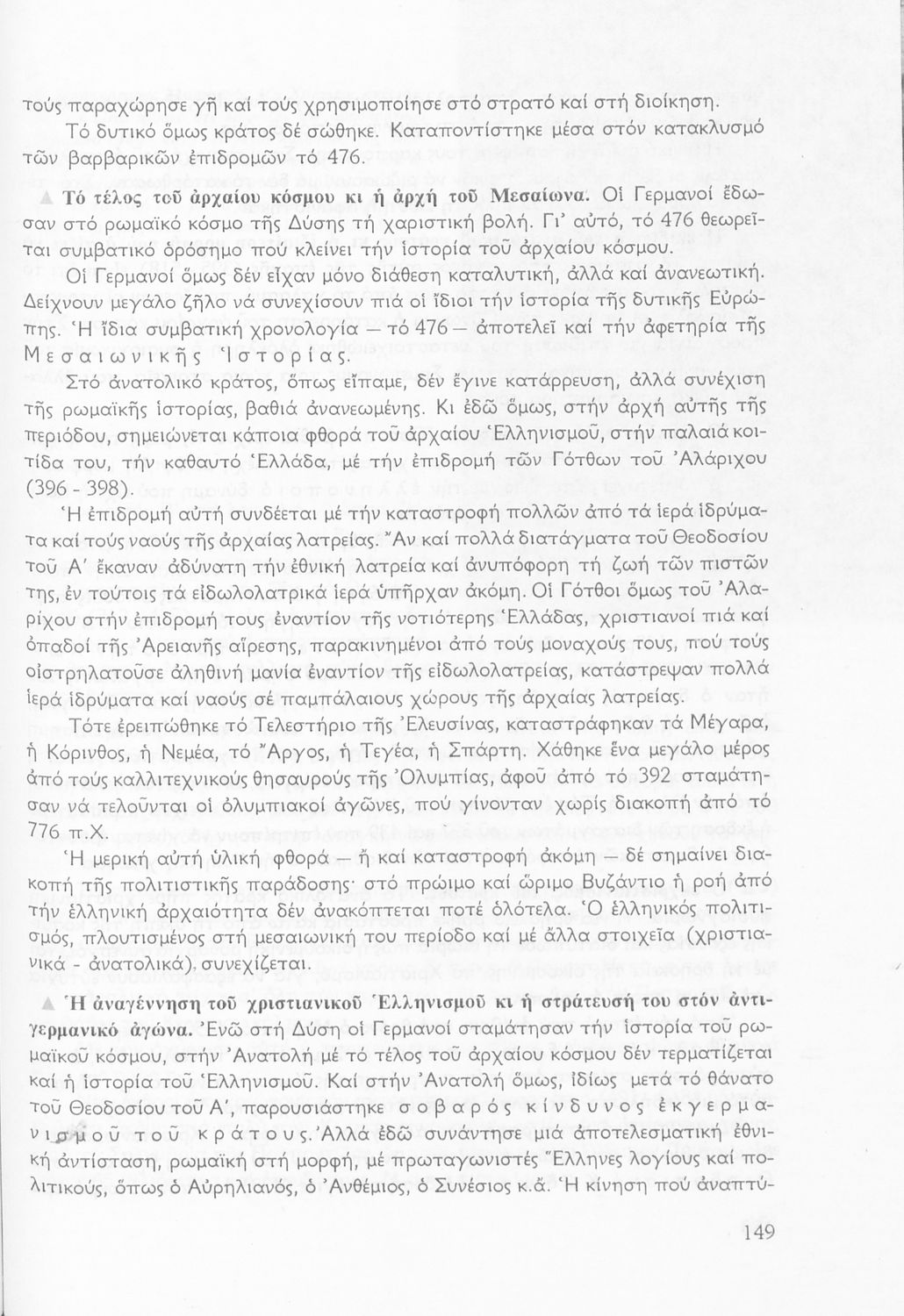 Σχολικό εγχειρίδιο Ιστορίας Β΄ Γυμνασίου που καλύπτει την περίοδο από την κατάληψη της Ελλάδας από τους Ρωμαίους ως την πτώση της Βυζαντινής Αυτοκρατορίας. Γίνεται ιδιαίτερη μνεία στο χριστιανικό και ελληνικό στοιχείο του Βυζαντίου. Προτείνει μια υλιστική ανάγνωση της Ιστορίας την οποία διαβάζει από την οπτική των κοινωνικών συγκρούσεων.