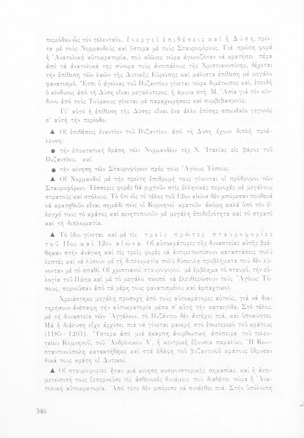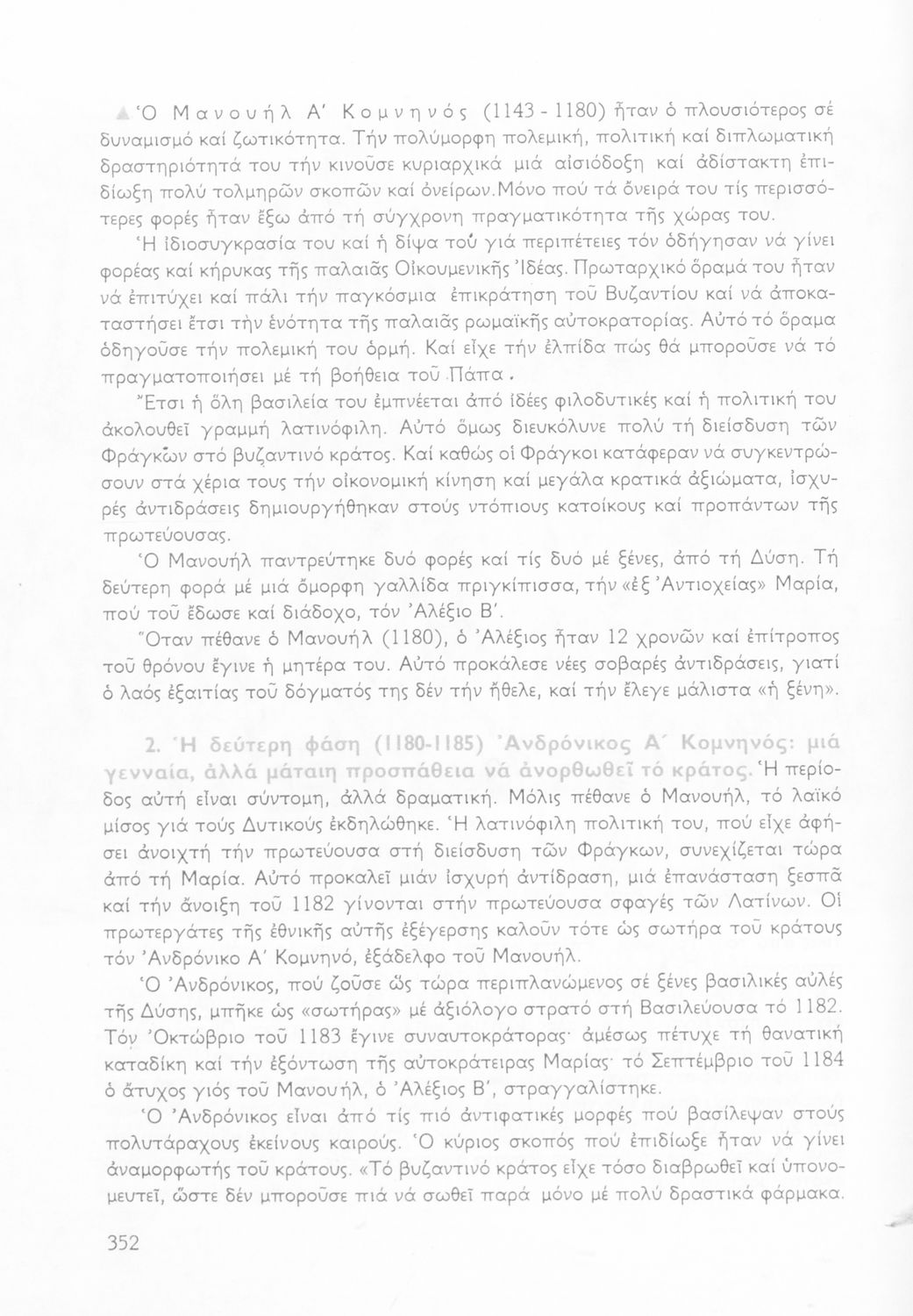 Σχολικό εγχειρίδιο Ιστορίας Β΄ Γυμνασίου που καλύπτει την περίοδο από την κατάληψη της Ελλάδας από τους Ρωμαίους ως την πτώση της Βυζαντινής Αυτοκρατορίας. Γίνεται ιδιαίτερη μνεία στο χριστιανικό και ελληνικό στοιχείο του Βυζαντίου. Προτείνει μια υλιστική ανάγνωση της Ιστορίας την οποία διαβάζει από την οπτική των κοινωνικών συγκρούσεων.