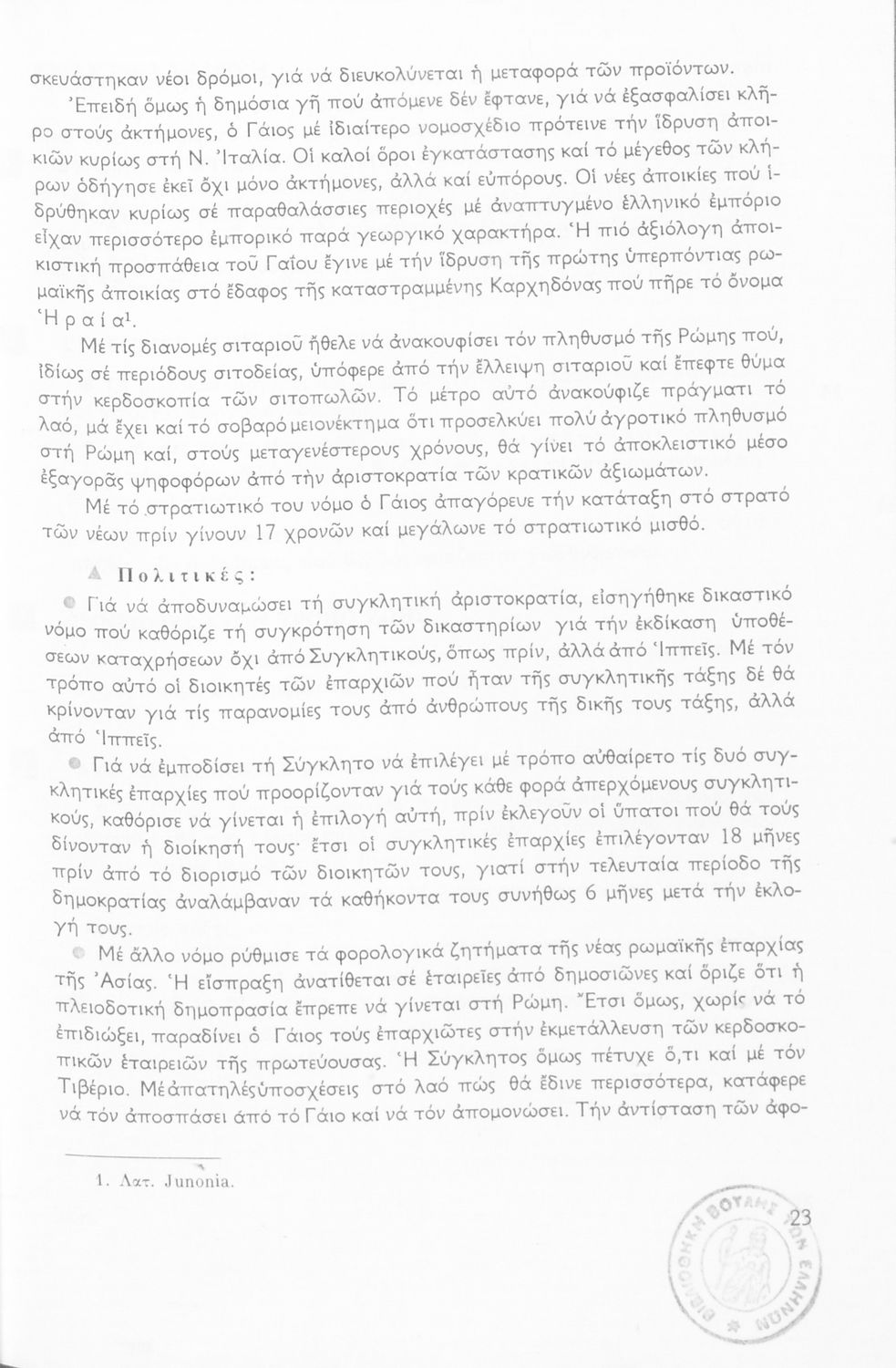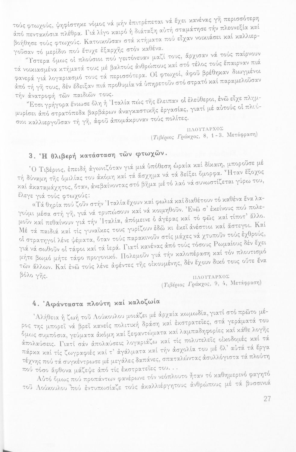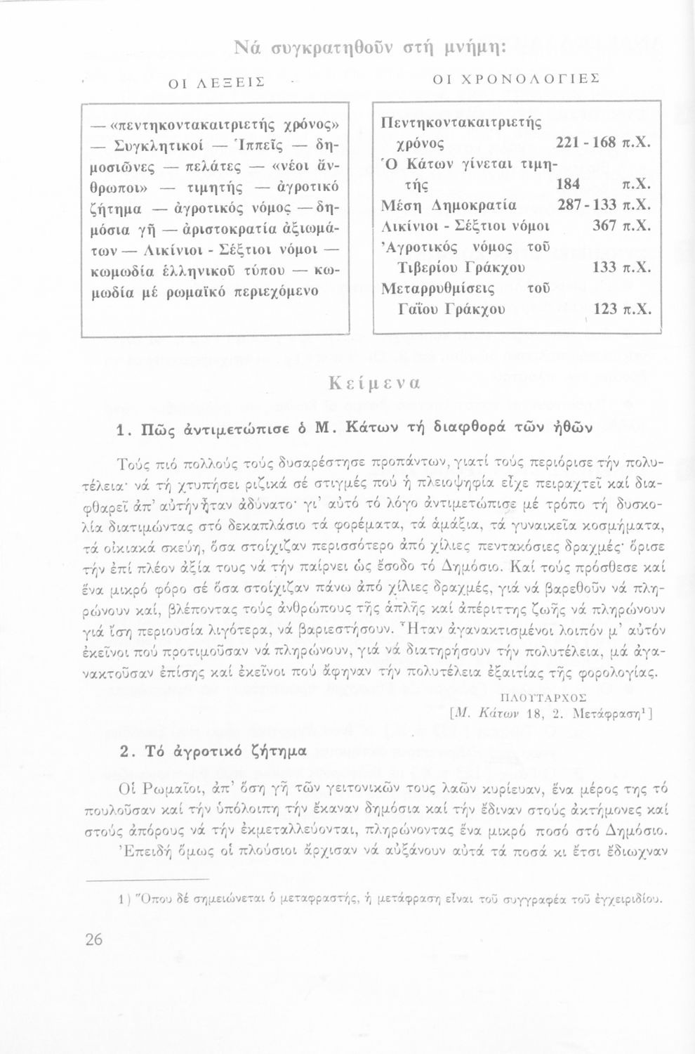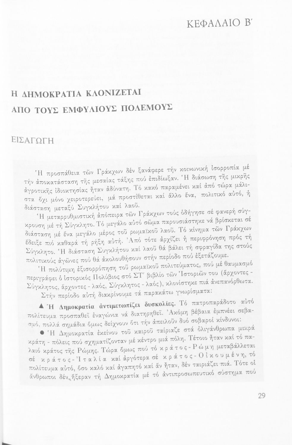Σχολικό εγχειρίδιο Ιστορίας Β΄ Γυμνασίου που καλύπτει την περίοδο από την κατάληψη της Ελλάδας από τους Ρωμαίους ως την πτώση της Βυζαντινής Αυτοκρατορίας. Γίνεται ιδιαίτερη μνεία στο χριστιανικό και ελληνικό στοιχείο του Βυζαντίου. Προτείνει μια υλιστική ανάγνωση της Ιστορίας την οποία διαβάζει από την οπτική των κοινωνικών συγκρούσεων.