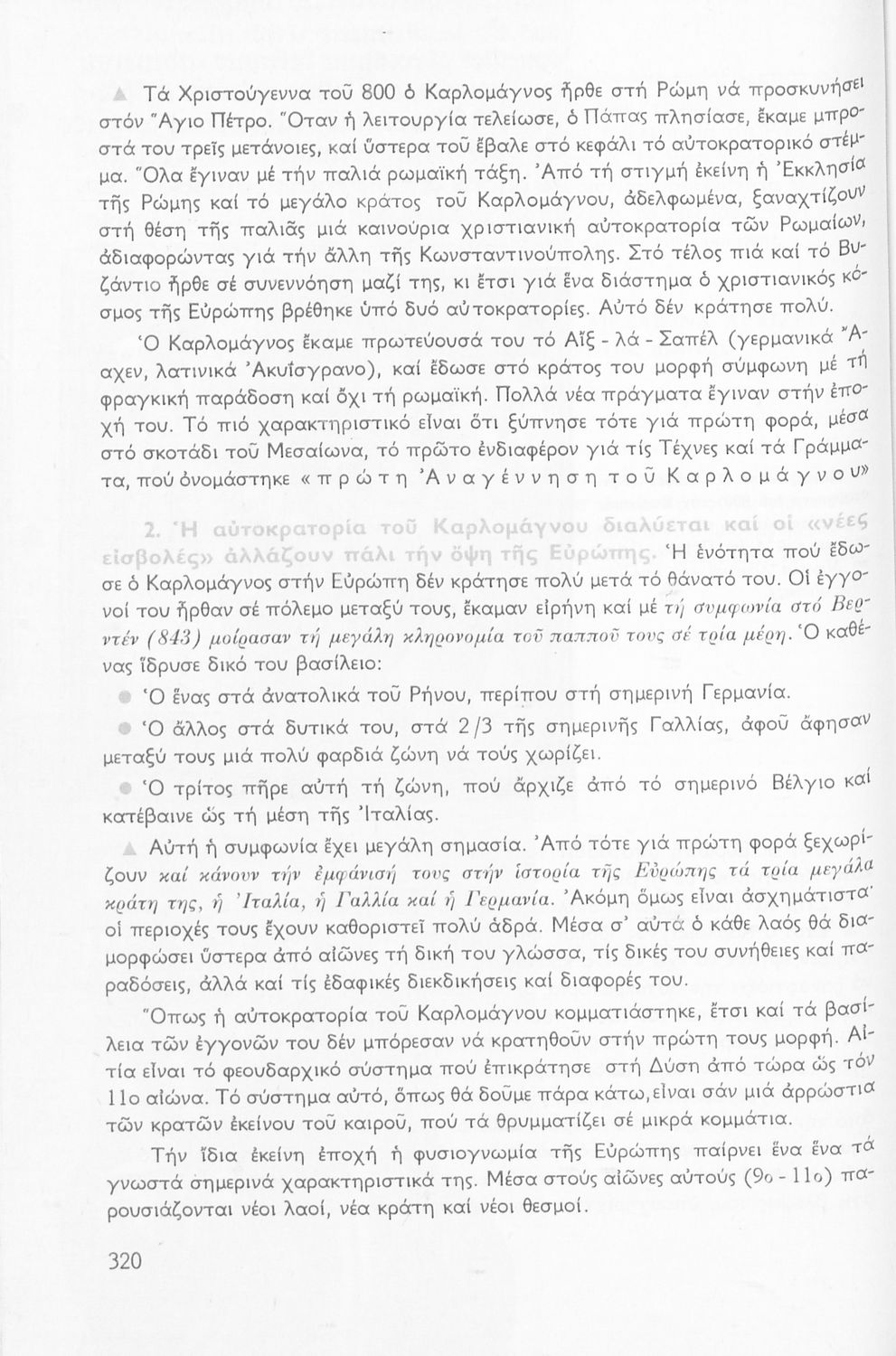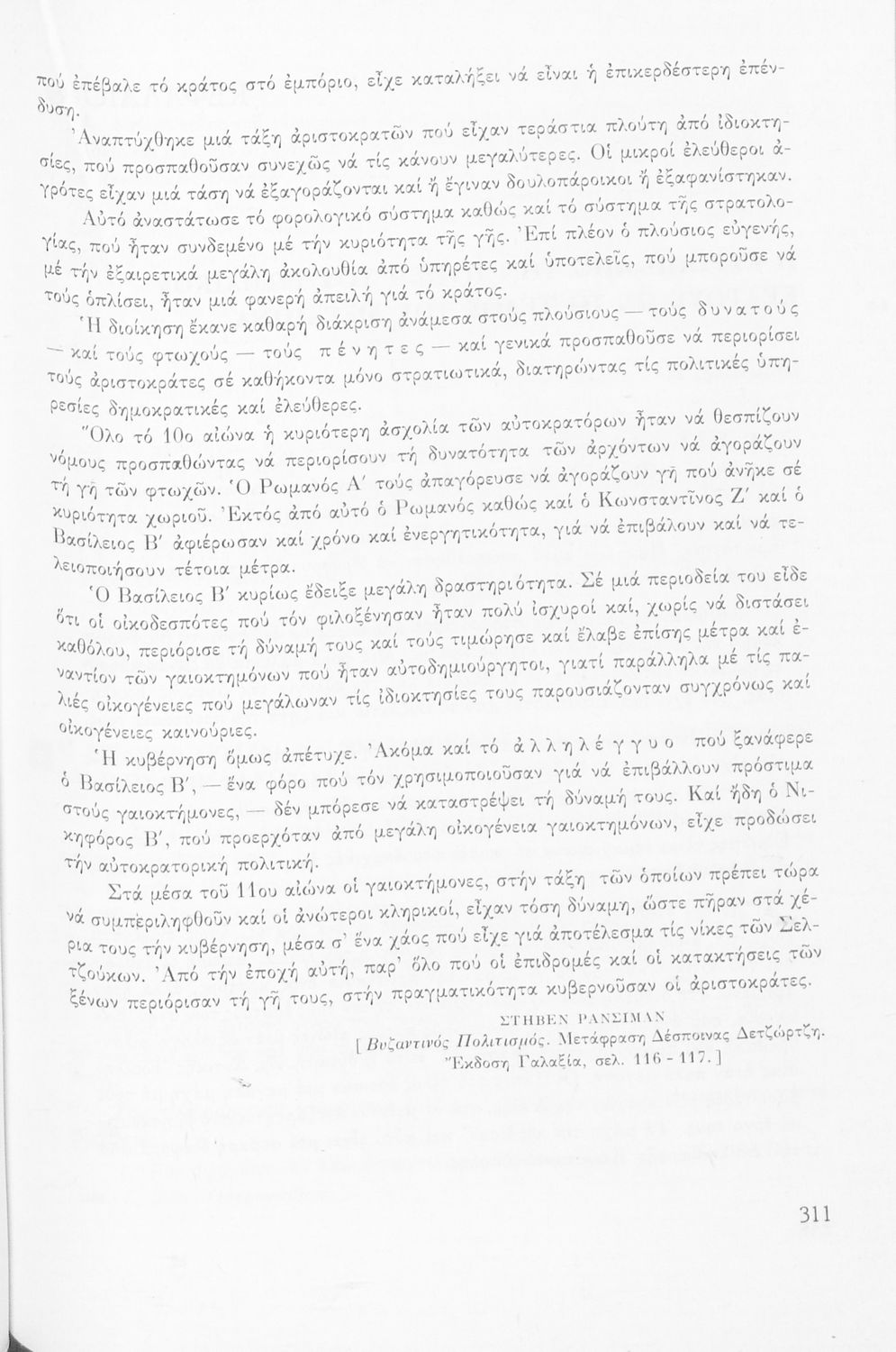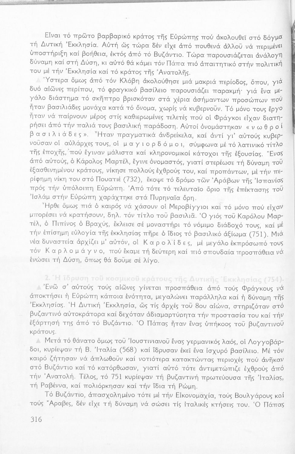 Σχολικό εγχειρίδιο Ιστορίας Β΄ Γυμνασίου που καλύπτει την περίοδο από την κατάληψη της Ελλάδας από τους Ρωμαίους ως την πτώση της Βυζαντινής Αυτοκρατορίας. Γίνεται ιδιαίτερη μνεία στο χριστιανικό και ελληνικό στοιχείο του Βυζαντίου. Προτείνει μια υλιστική ανάγνωση της Ιστορίας την οποία διαβάζει από την οπτική των κοινωνικών συγκρούσεων.