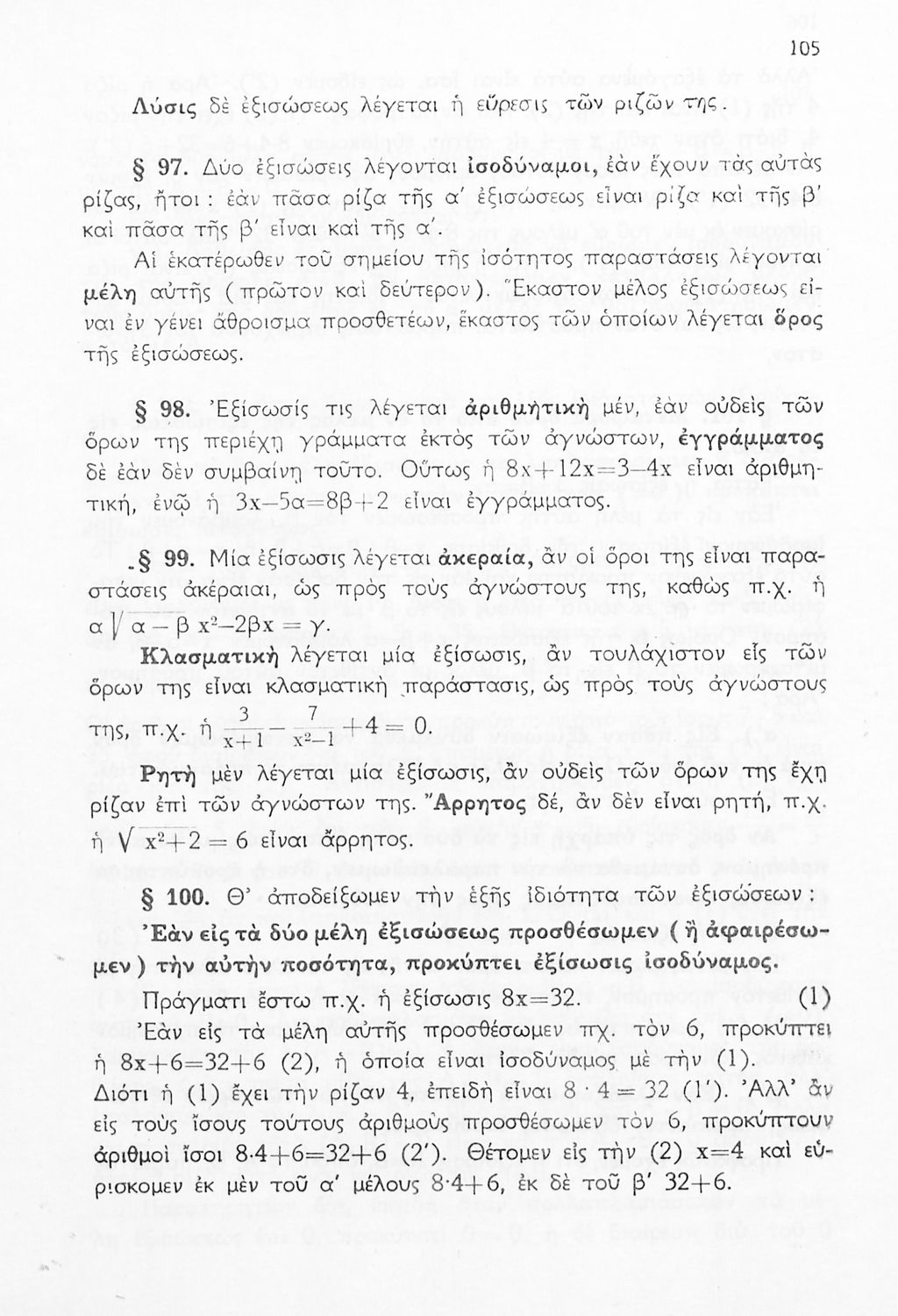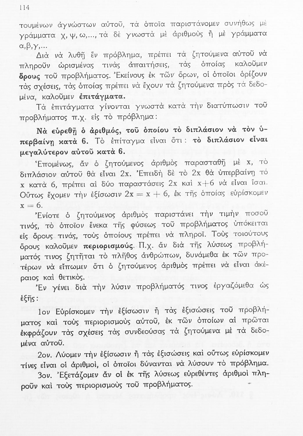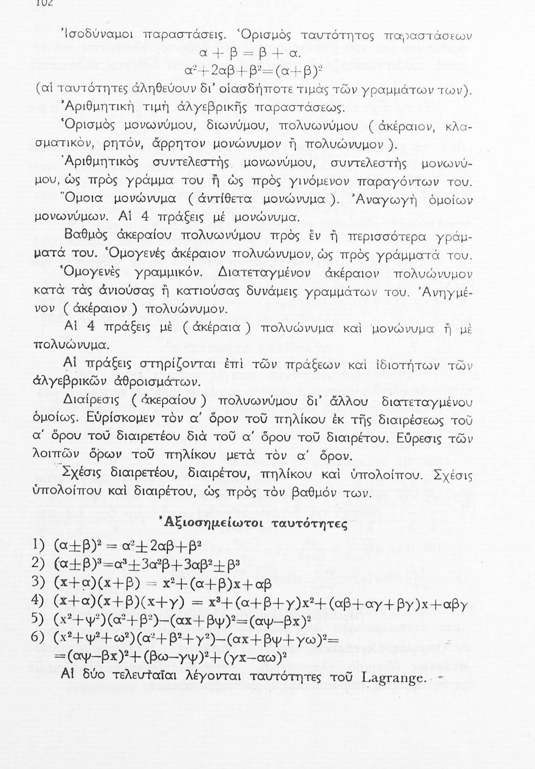 Παρουσίαση περιεχομένου: Σχολικό εγχειρίδιο Μαθηματικών Δ', Ε' και ΣΤ΄ τάξεων του Γυμνασίου που παρουσιάζει τις βασικές έννοιες της Άλγεβρας, εστιάζει τις ιδιότητες των αριθμών και περιέχει ασκήσεις εξισώσεων, λογαρίθμων και παραγώγων.