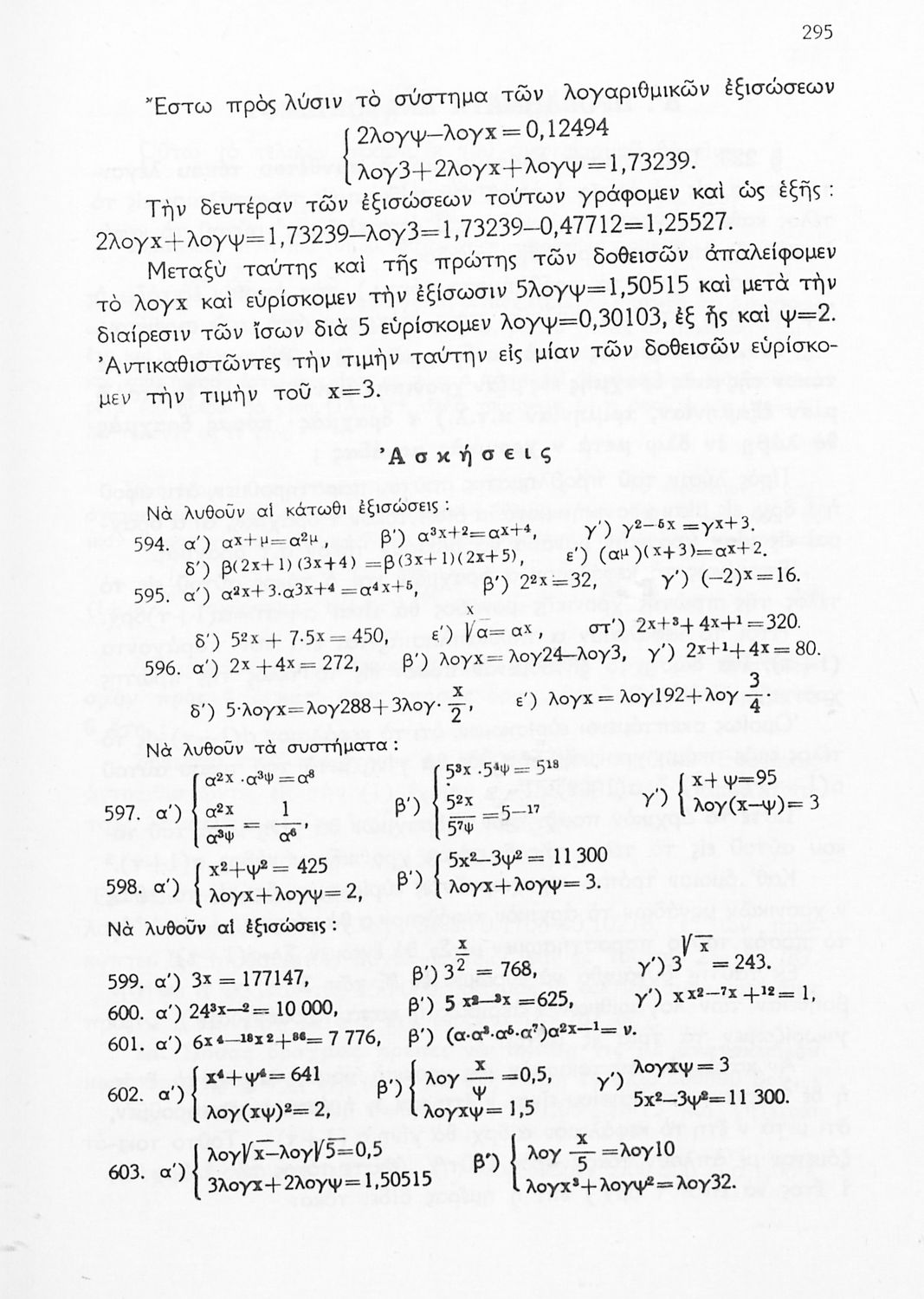 Παρουσίαση περιεχομένου: Σχολικό εγχειρίδιο Μαθηματικών Δ', Ε' και ΣΤ΄ τάξεων του Γυμνασίου που παρουσιάζει τις βασικές έννοιες της Άλγεβρας, εστιάζει τις ιδιότητες των αριθμών και περιέχει ασκήσεις εξισώσεων, λογαρίθμων και παραγώγων.