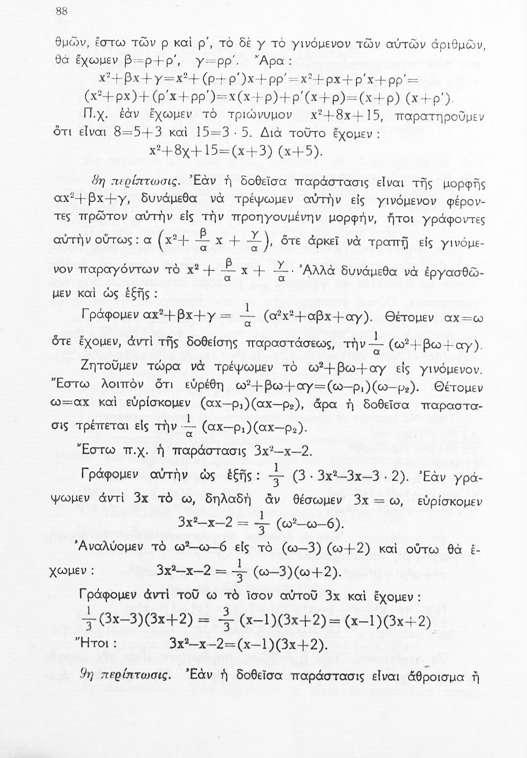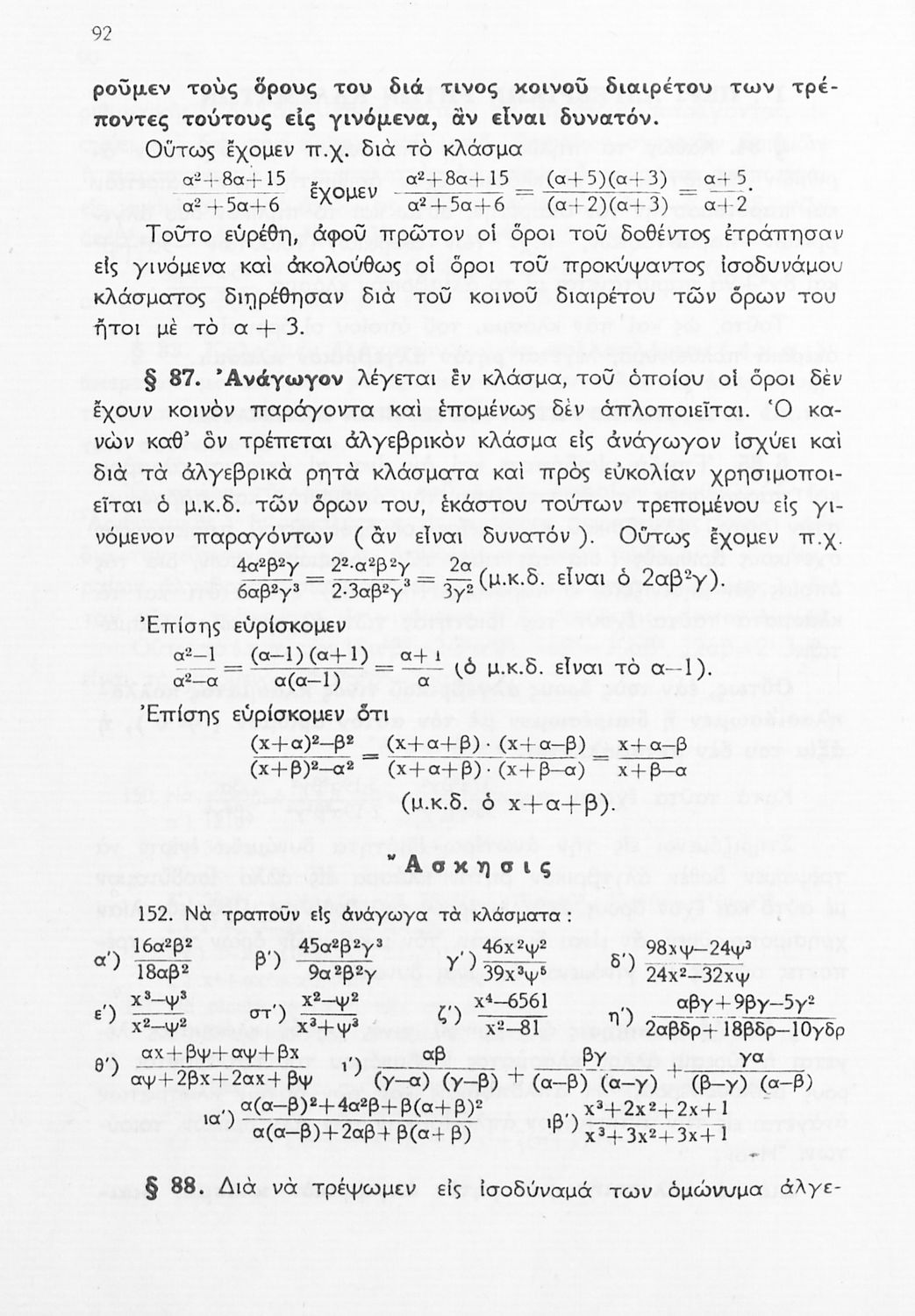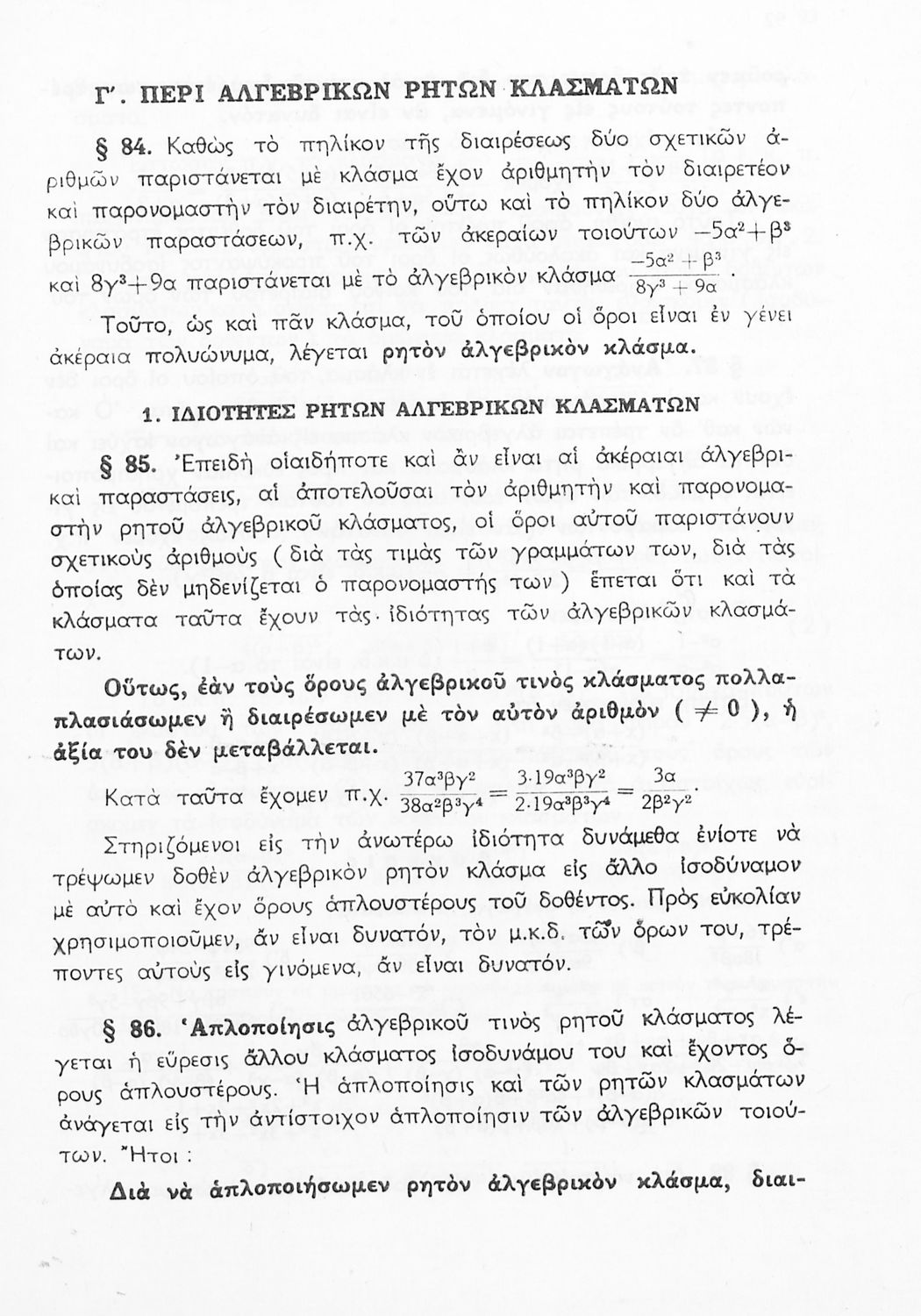 Παρουσίαση περιεχομένου: Σχολικό εγχειρίδιο Μαθηματικών Δ', Ε' και ΣΤ΄ τάξεων του Γυμνασίου που παρουσιάζει τις βασικές έννοιες της Άλγεβρας, εστιάζει τις ιδιότητες των αριθμών και περιέχει ασκήσεις εξισώσεων, λογαρίθμων και παραγώγων.