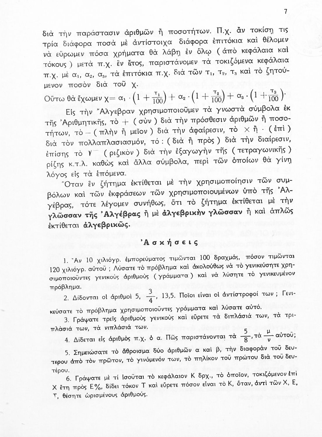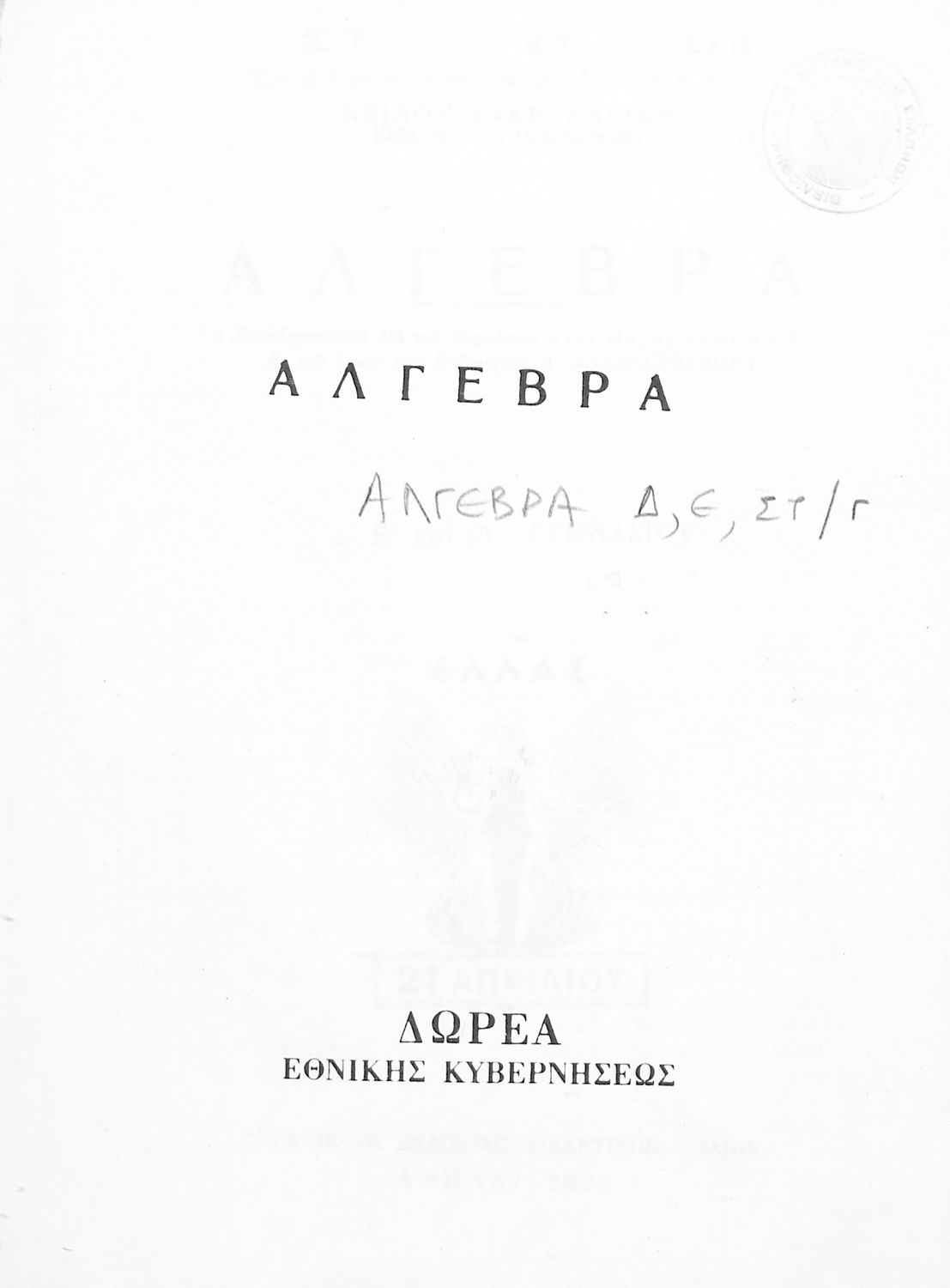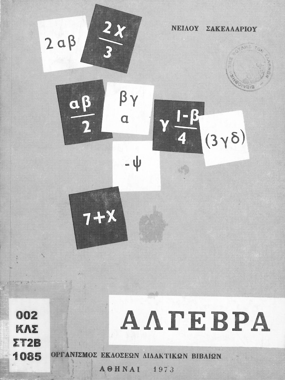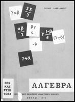 Βαθμίδα εκπαίδευσης: Δευτεροβάθμια Τάξη: Δ' Γυμνασίου / Ε' Γυμνασίου / ΣΤ' Γυμνασίου Μάθημα: Μαθηματικά Γλώσσα: Απλή καθαρεύουσα Παρουσίαση περιεχομένου: Σχολικό εγχειρίδιο Μαθηματικών Δ', Ε' και ΣΤ΄ τάξεων του Γυμνασίου που παρουσιάζει τις βασικές έννοιες της Άλγεβρας, εστιάζει τις ιδιότητες των αριθμών και περιέχει ασκήσεις εξισώσεων, λογαρίθμων και παραγώγων. |