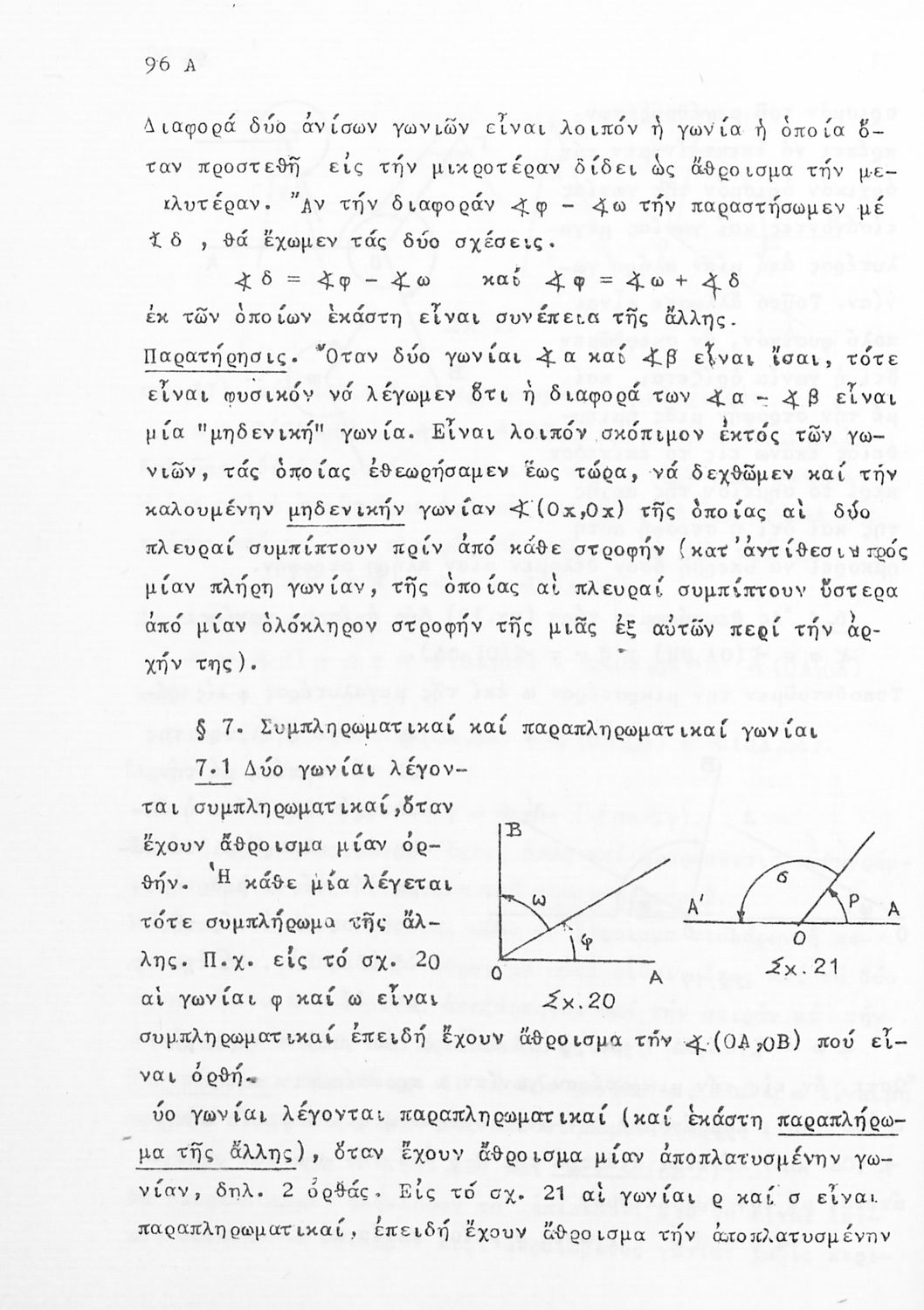 Σχολικό εγχειρίδιο Μαθηματικών Α' Γυμνασίου που περιλαμβάνει γεωμετρία με έμφαση στον υπολογισμό γωνιών και εμβαδού και άλγεβρας με έμφαση στους ακέραιους αριθμούς και τα κλάσματα. Φέρει το σύμβολο της δικτατορίας.