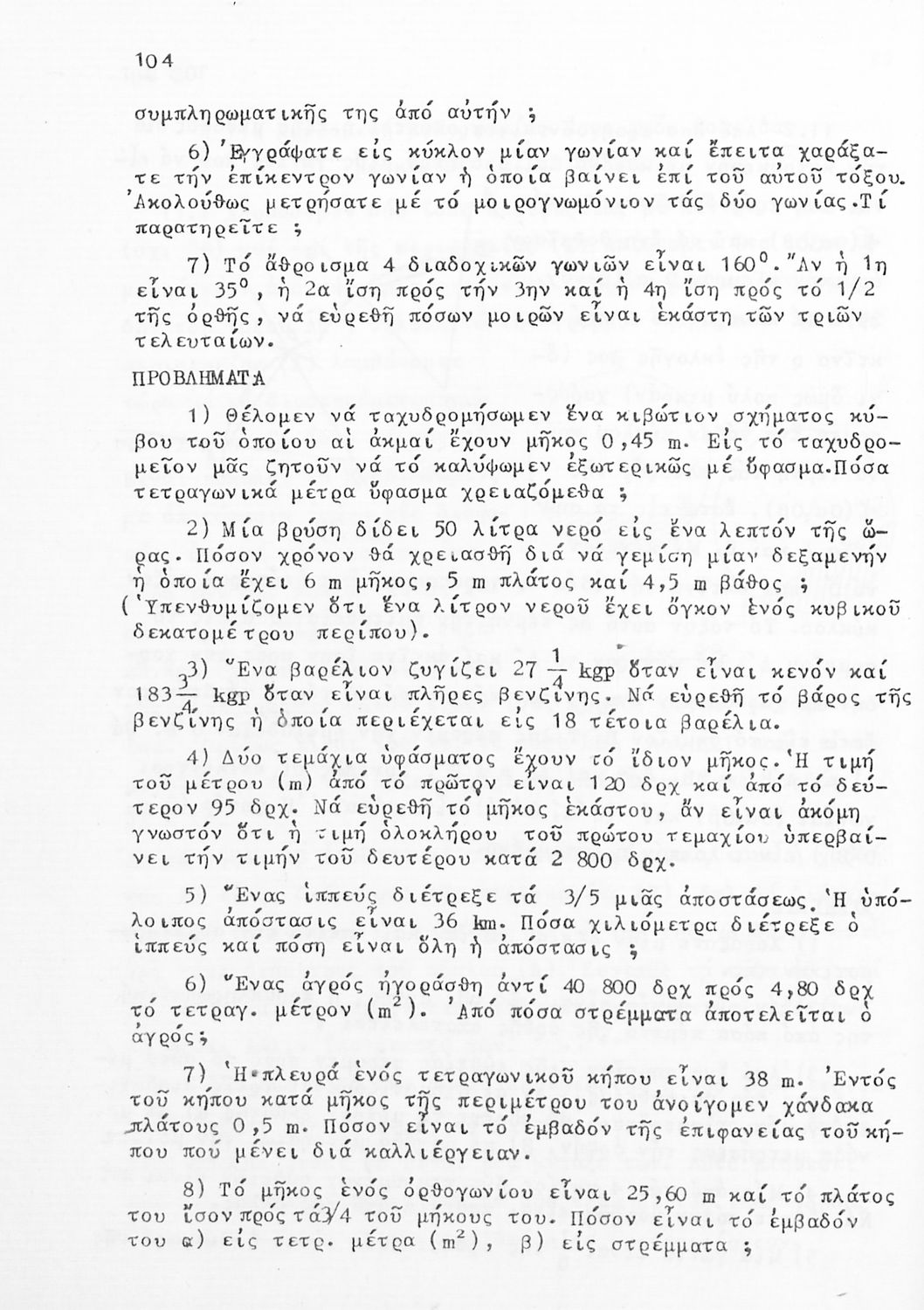Παρουσίαση περιεχομένου: Σχολικό εγχειρίδιο Μαθηματικών Α' Γυμνασίου που περιλαμβάνει γεωμετρία με έμφαση στον υπολογισμό γωνιών και εμβαδού και άλγεβρας με έμφαση στους ακέραιους αριθμούς και τα κλάσματα. Φέρει το σύμβολο της δικτατορίας.
