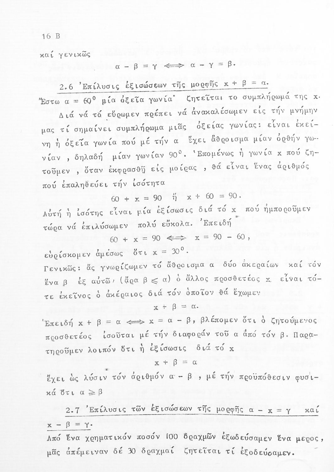 Σχολικό εγχειρίδιο Μαθηματικών Α' Γυμνασίου που περιλαμβάνει γεωμετρία με έμφαση στον υπολογισμό γωνιών και εμβαδού και άλγεβρας με έμφαση στους ακέραιους αριθμούς και τα κλάσματα. Φέρει το σύμβολο της δικτατορίας.