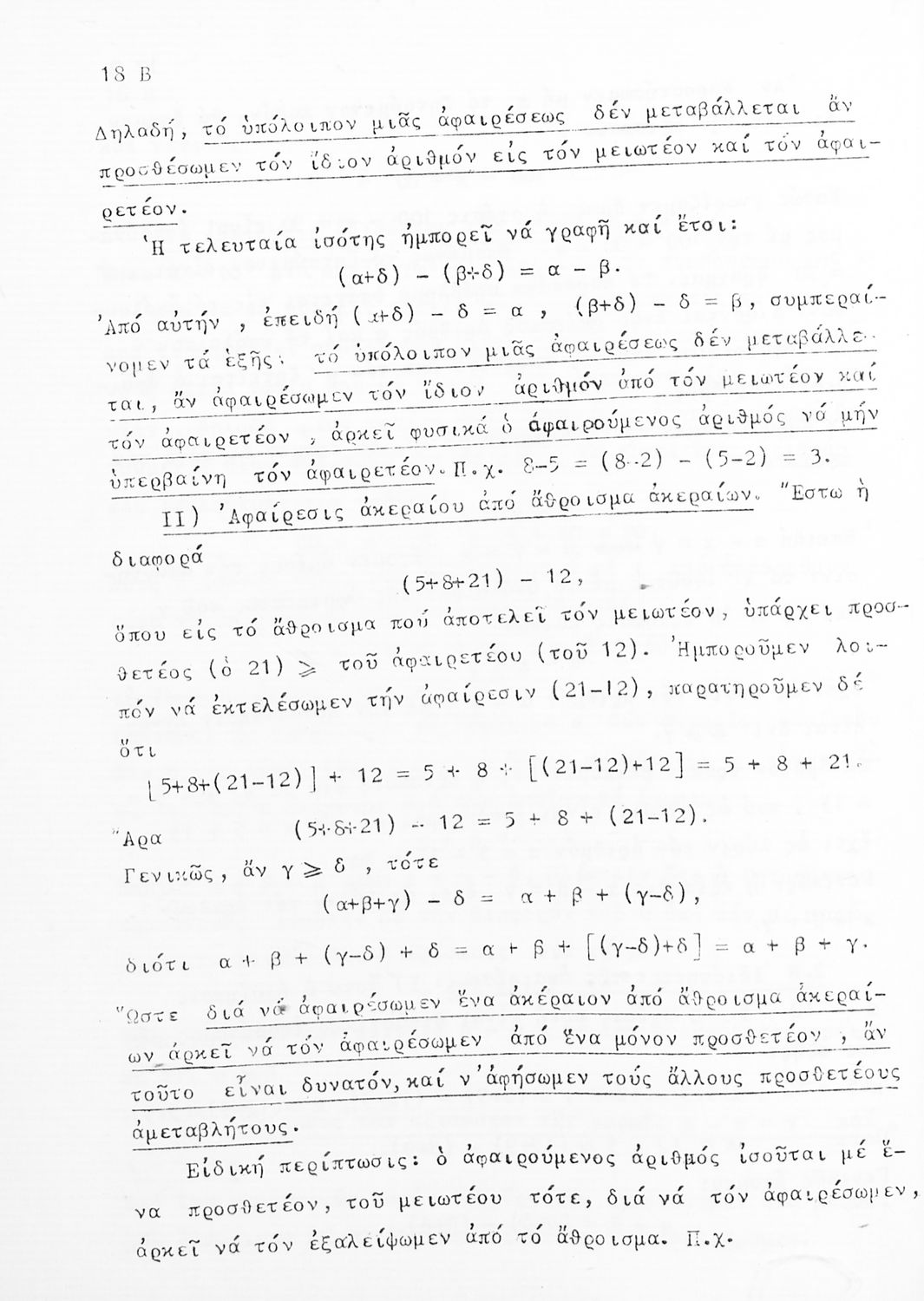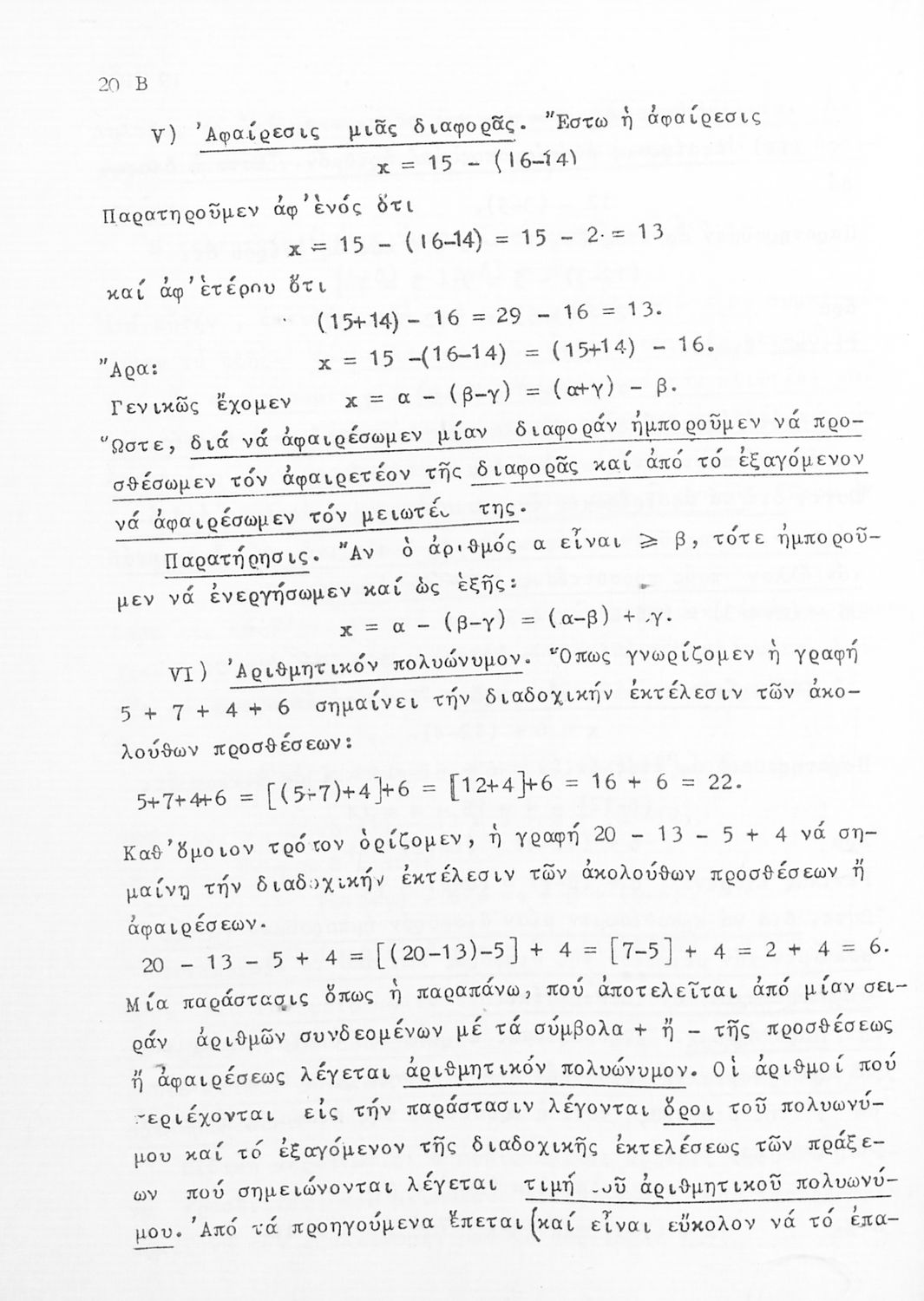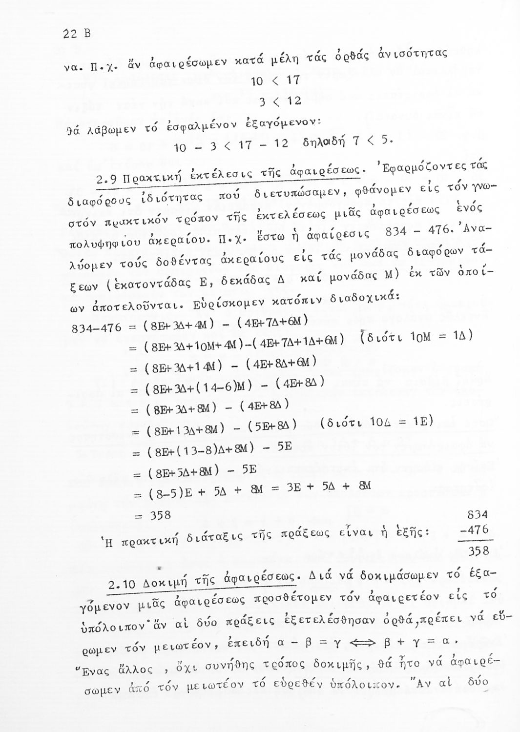 Σχολικό εγχειρίδιο Αριθμητικής για τις Α΄, Β΄, Γ΄ Γυμνασίου και τα Ανώτερα Παρθεναγωγεία που είναι χωρισμένο σε θεωρία και ασκήσεις και εστιάζει στις αριθμητικές πράξεις με κλάσματα και ακέραιους και συμμιγείς