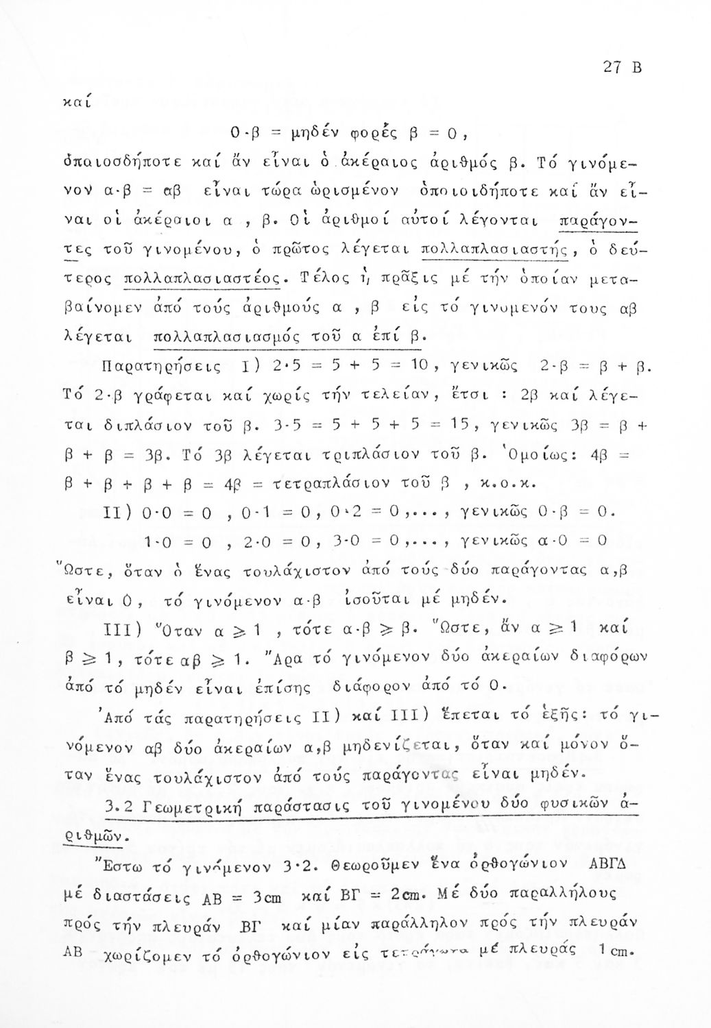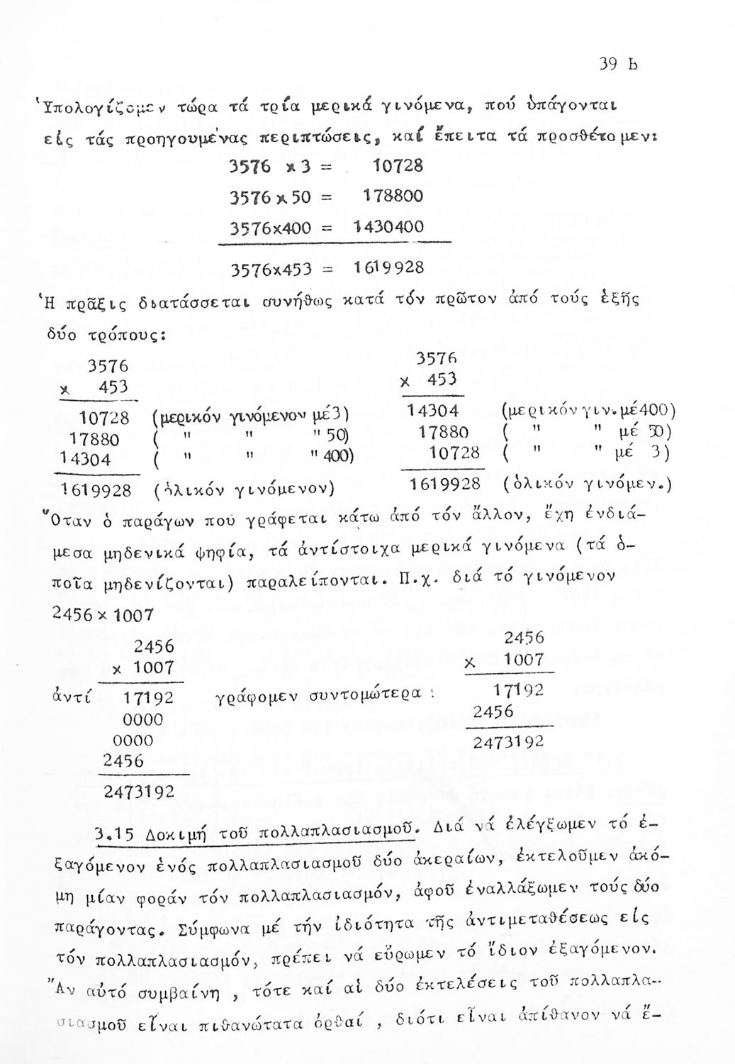 Σχολικό εγχειρίδιο Μαθηματικών Α' Γυμνασίου που περιλαμβάνει γεωμετρία με έμφαση στον υπολογισμό γωνιών και εμβαδού και άλγεβρας με έμφαση στους ακέραιους αριθμούς και τα κλάσματα. Φέρει το σύμβολο της δικτατορίας.