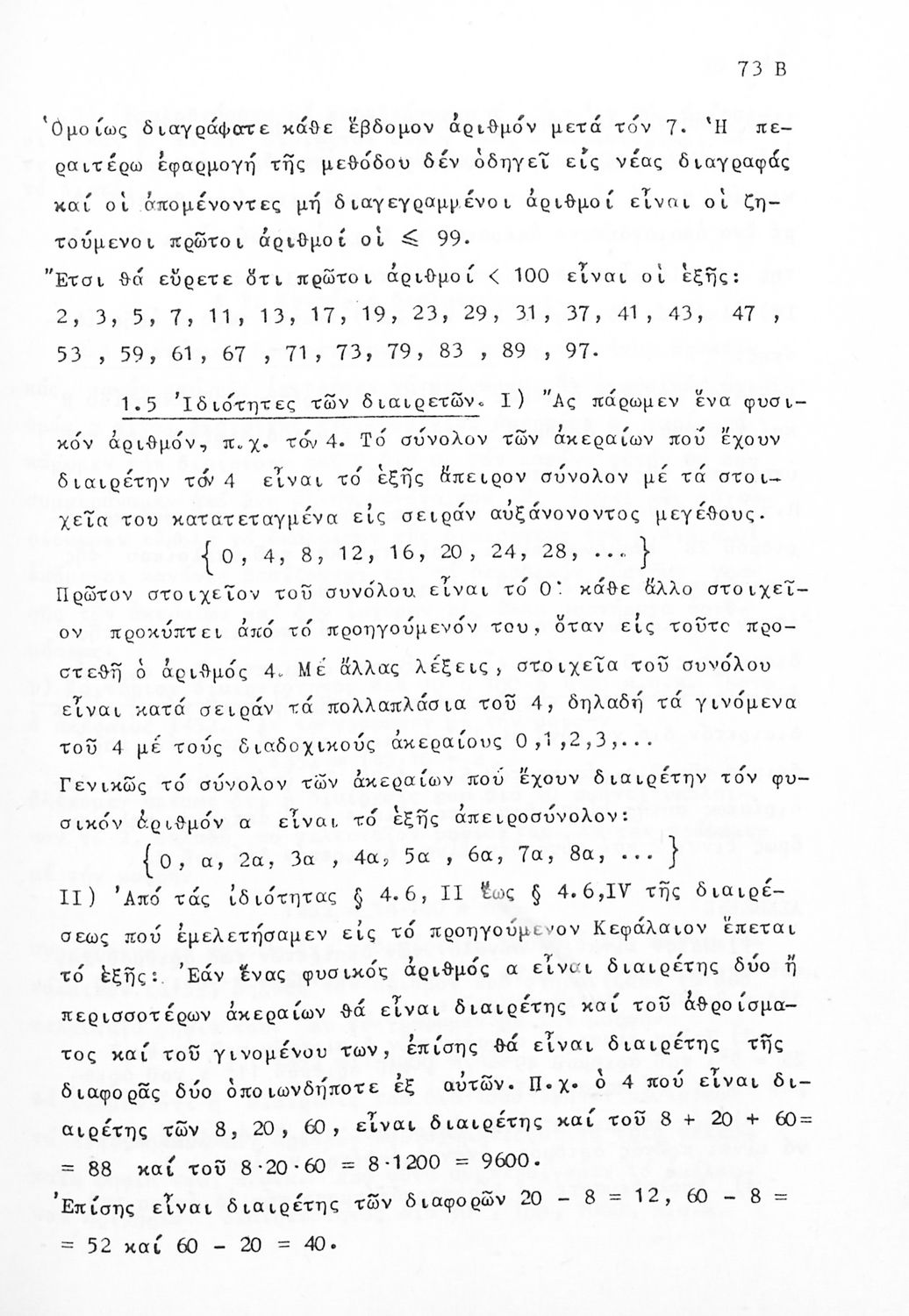 Σχολικό εγχειρίδιο Μαθηματικών Α' Γυμνασίου που περιλαμβάνει γεωμετρία με έμφαση στον υπολογισμό γωνιών και εμβαδού και άλγεβρας με έμφαση στους ακέραιους αριθμούς και τα κλάσματα. Φέρει το σύμβολο της δικτατορίας.