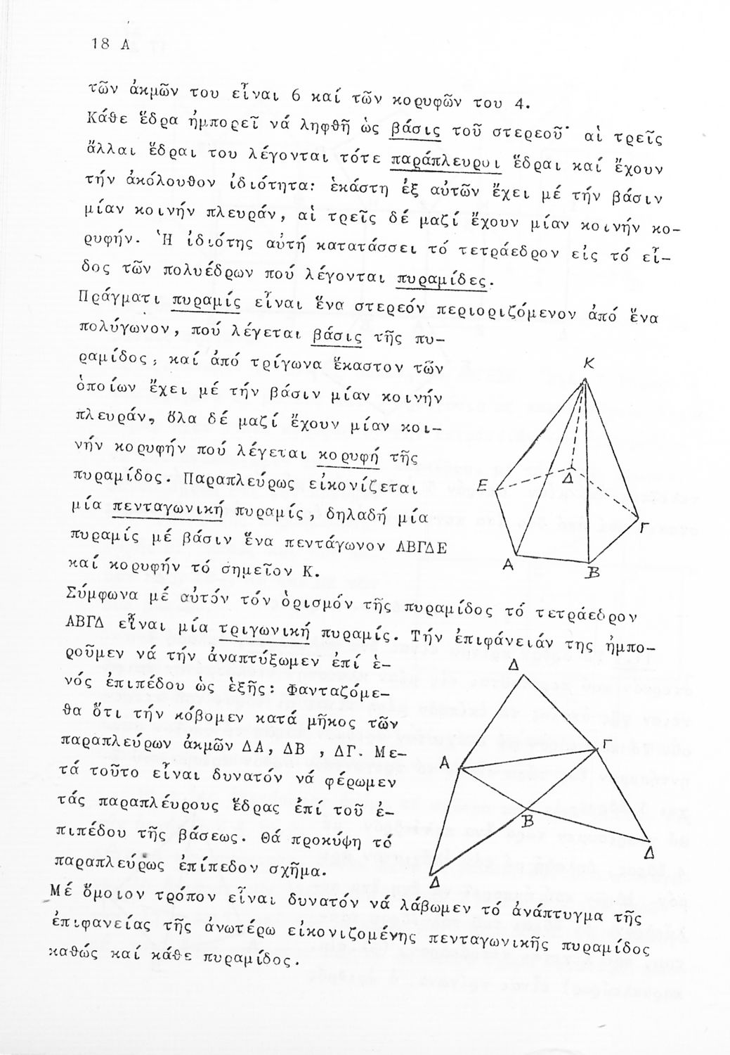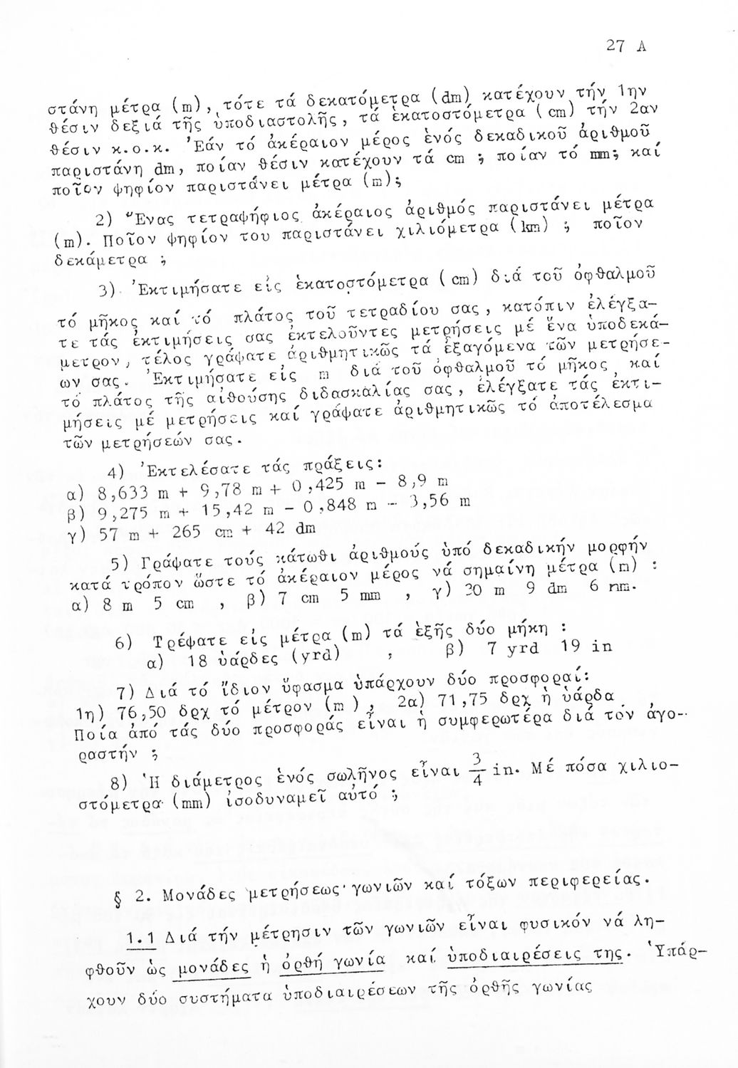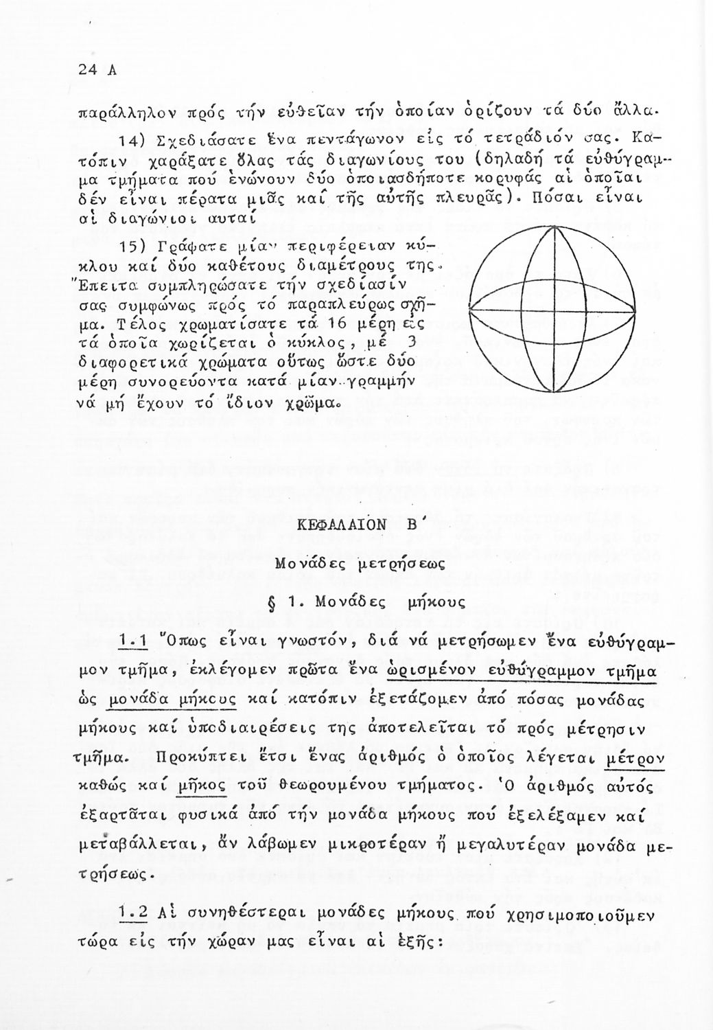 Σχολικό εγχειρίδιο Μαθηματικών Α' Γυμνασίου που περιλαμβάνει γεωμετρία με έμφαση στον υπολογισμό γωνιών και εμβαδού και άλγεβρας με έμφαση στους ακέραιους αριθμούς και τα κλάσματα. Φέρει το σύμβολο της δικτατορίας.