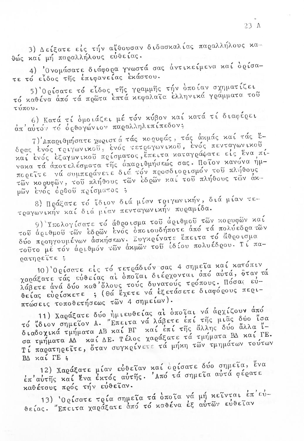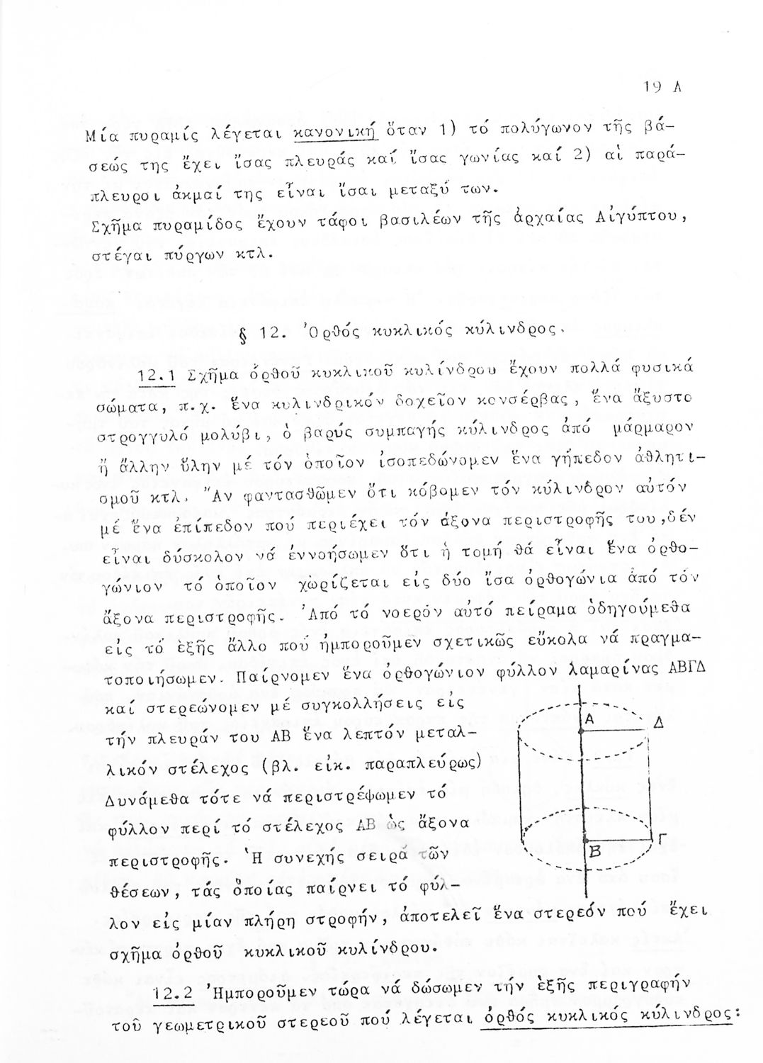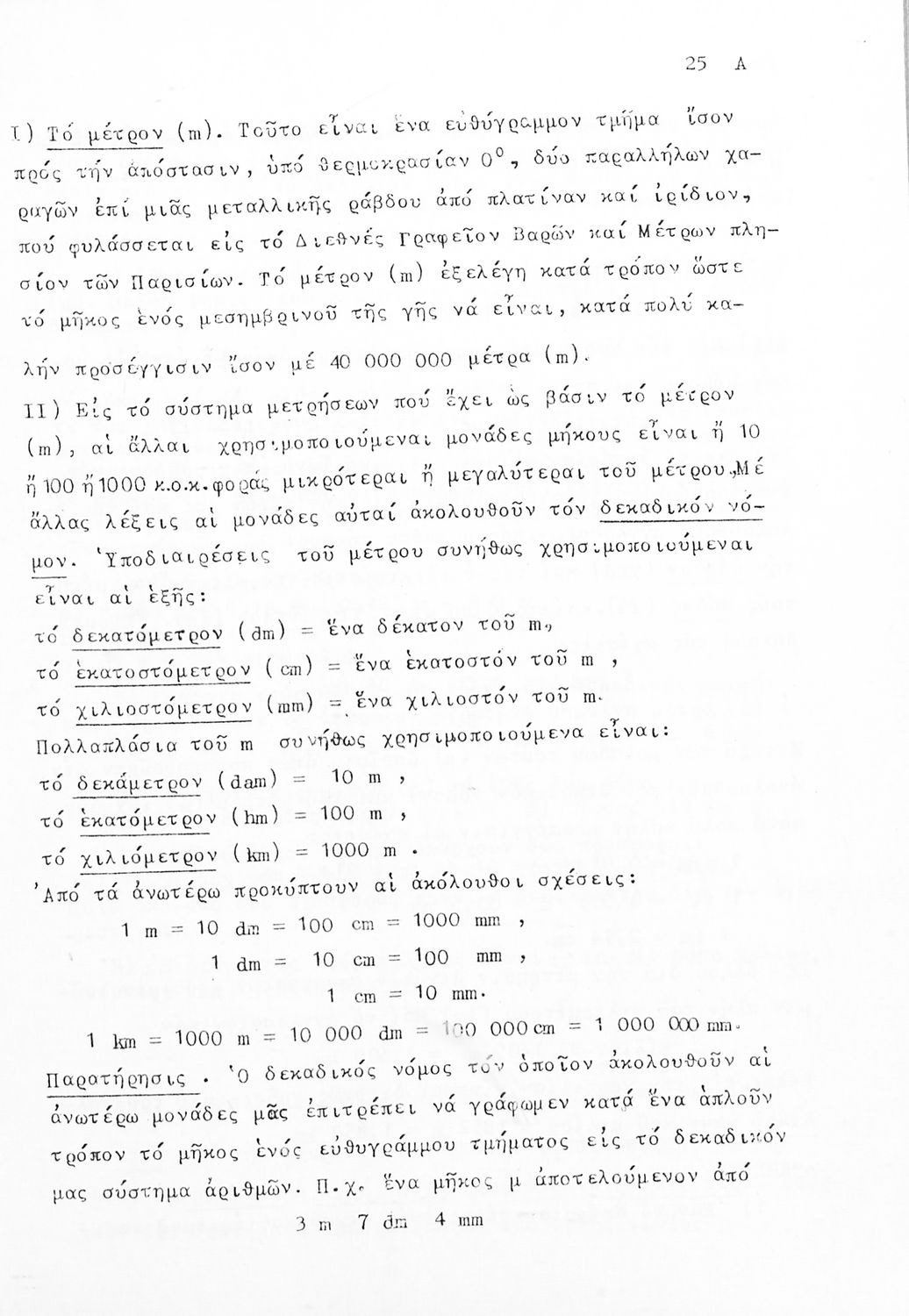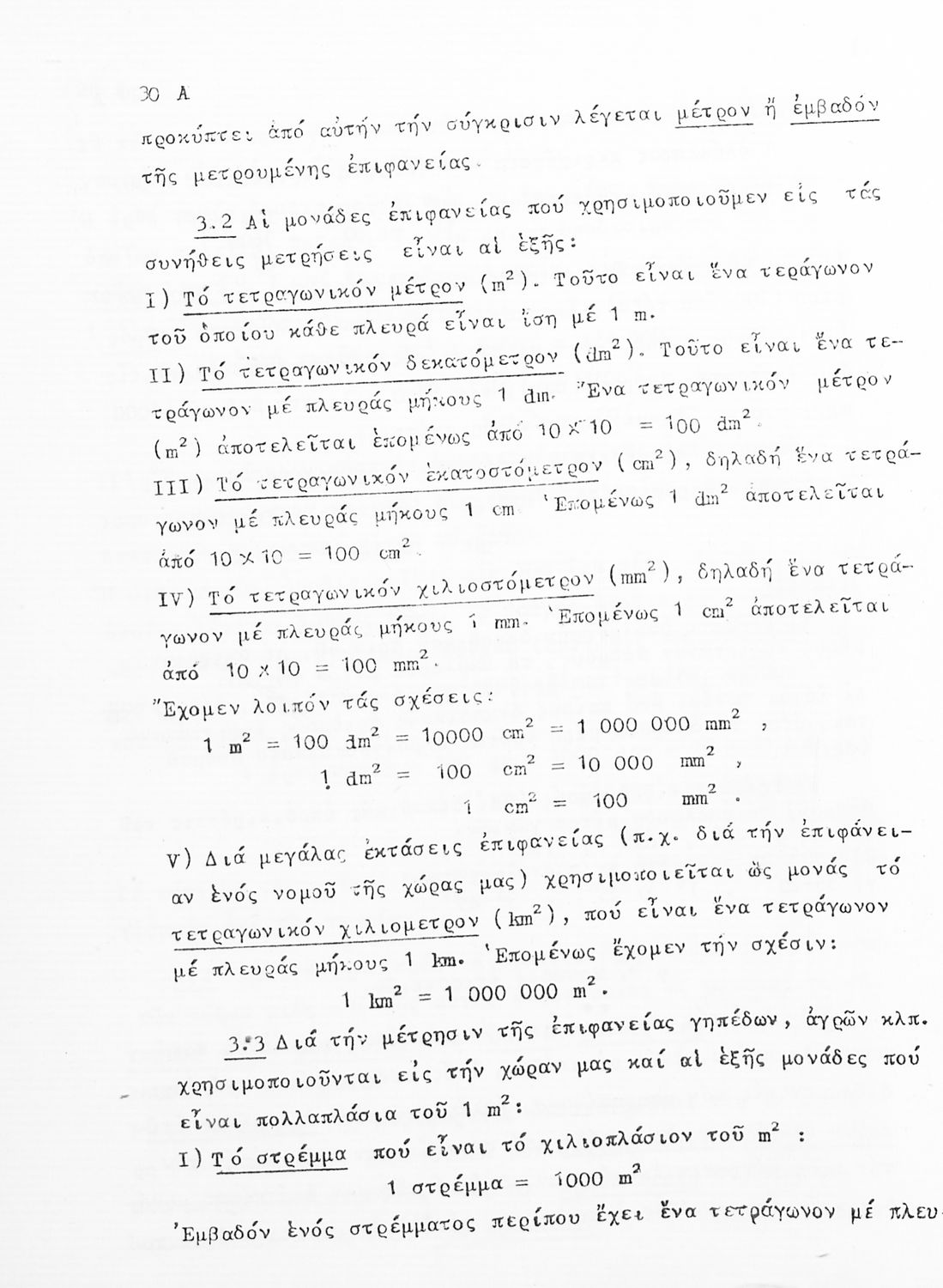 Σχολικό εγχειρίδιο Μαθηματικών Α' Γυμνασίου που περιλαμβάνει γεωμετρία με έμφαση στον υπολογισμό γωνιών και εμβαδού και άλγεβρας με έμφαση στους ακέραιους αριθμούς και τα κλάσματα. Φέρει το σύμβολο της δικτατορίας.