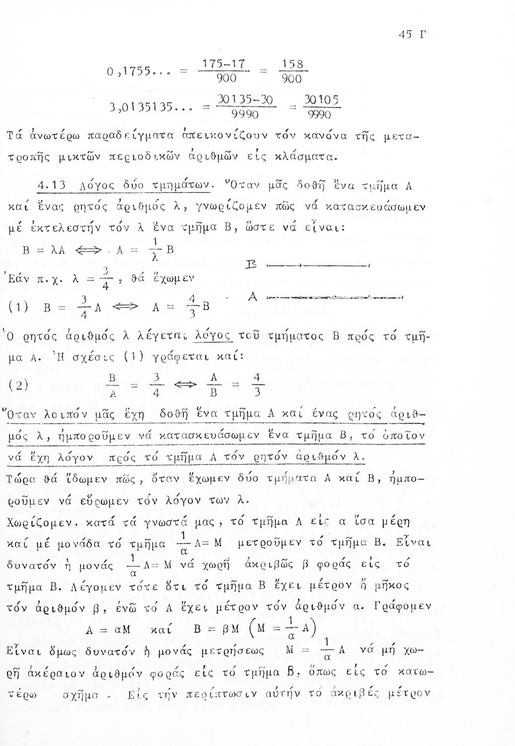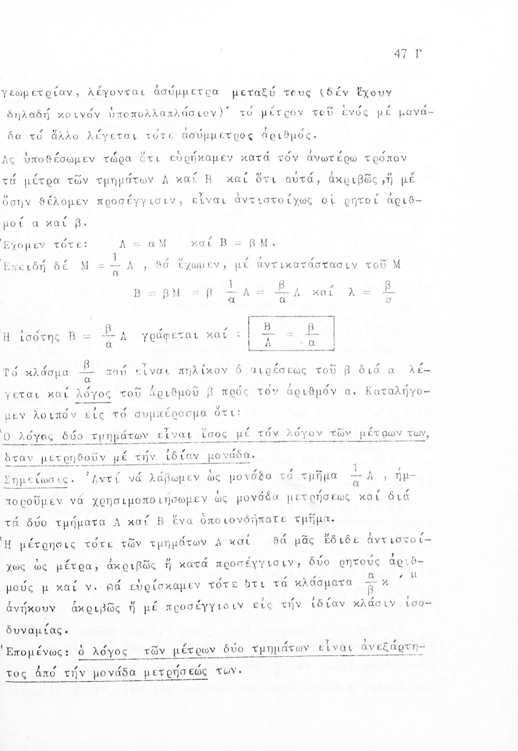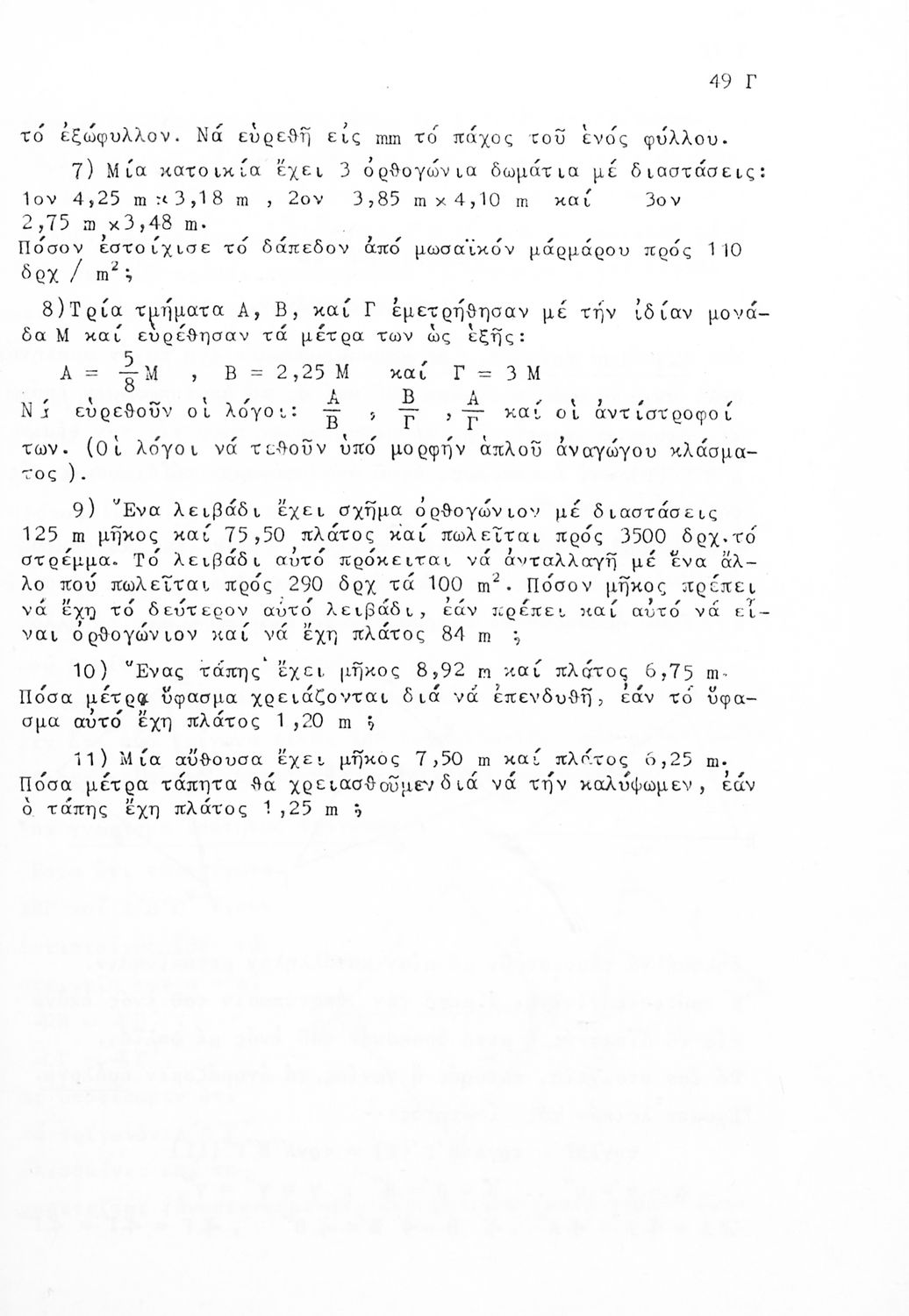 Σχολικό εγχειρίδιο Μαθηματικών Α' Γυμνασίου που περιλαμβάνει γεωμετρία με έμφαση στον υπολογισμό γωνιών και εμβαδού και άλγεβρας με έμφαση στους ακέραιους αριθμούς και τα κλάσματα. Φέρει το σύμβολο της δικτατορίας.