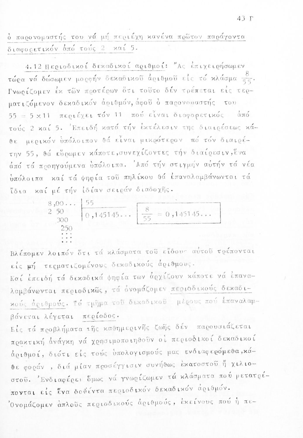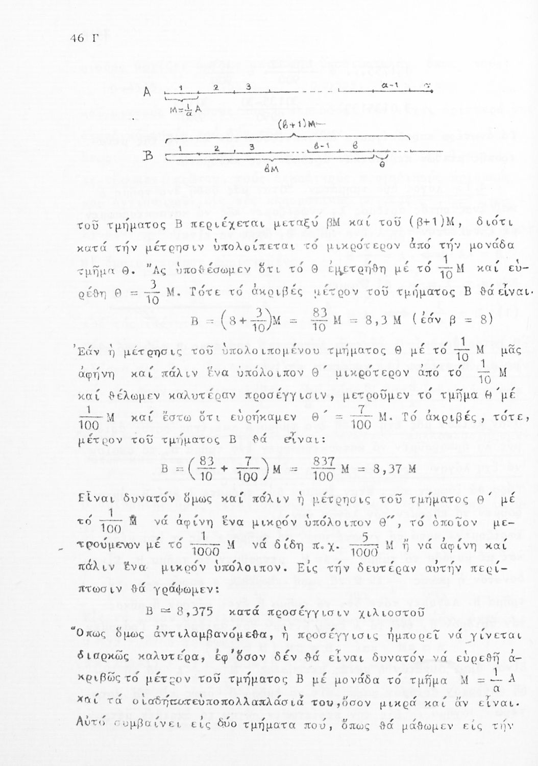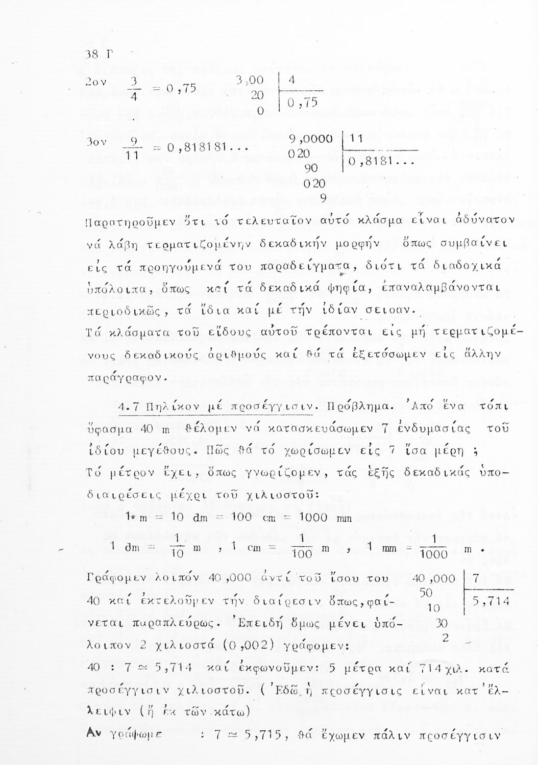 Σχολικό εγχειρίδιο Μαθηματικών Α' Γυμνασίου που περιλαμβάνει γεωμετρία με έμφαση στον υπολογισμό γωνιών και εμβαδού και άλγεβρας με έμφαση στους ακέραιους αριθμούς και τα κλάσματα. Φέρει το σύμβολο της δικτατορίας.