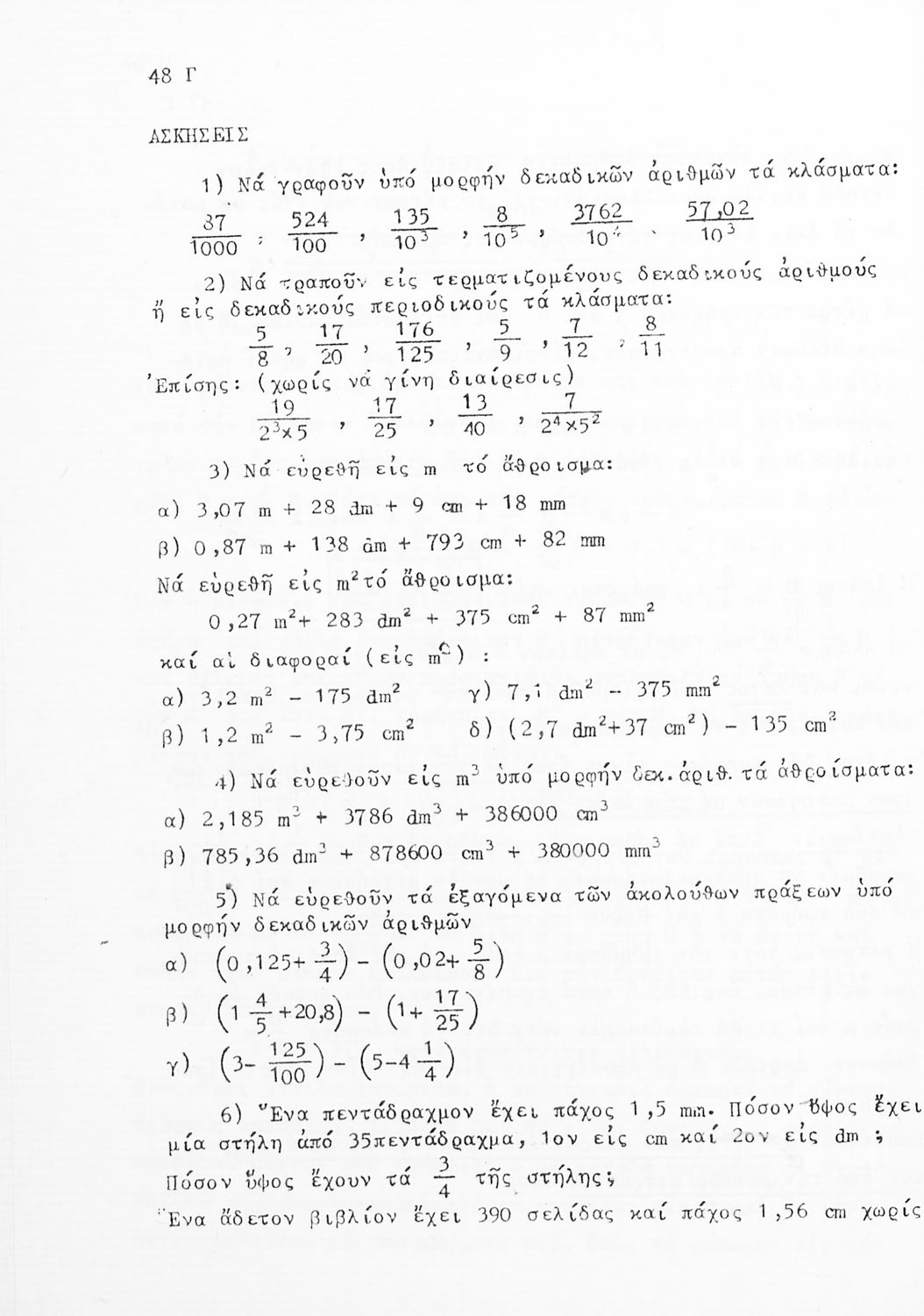 Παρουσίαση περιεχομένου: Σχολικό εγχειρίδιο Μαθηματικών Α' Γυμνασίου που περιλαμβάνει γεωμετρία με έμφαση στον υπολογισμό γωνιών και εμβαδού και άλγεβρας με έμφαση στους ακέραιους αριθμούς και τα κλάσματα. Φέρει το σύμβολο της δικτατορίας.