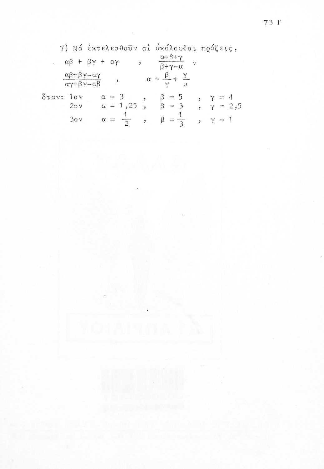 Σχολικό εγχειρίδιο Μαθηματικών Α' Γυμνασίου που περιλαμβάνει γεωμετρία με έμφαση στον υπολογισμό γωνιών και εμβαδού και άλγεβρας με έμφαση στους ακέραιους αριθμούς και τα κλάσματα. Φέρει το σύμβολο της δικτατορίας.