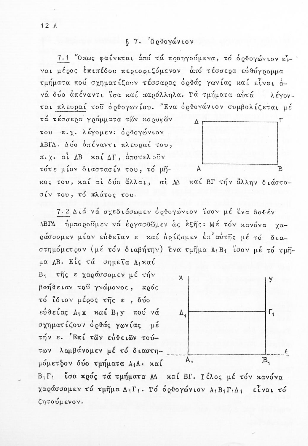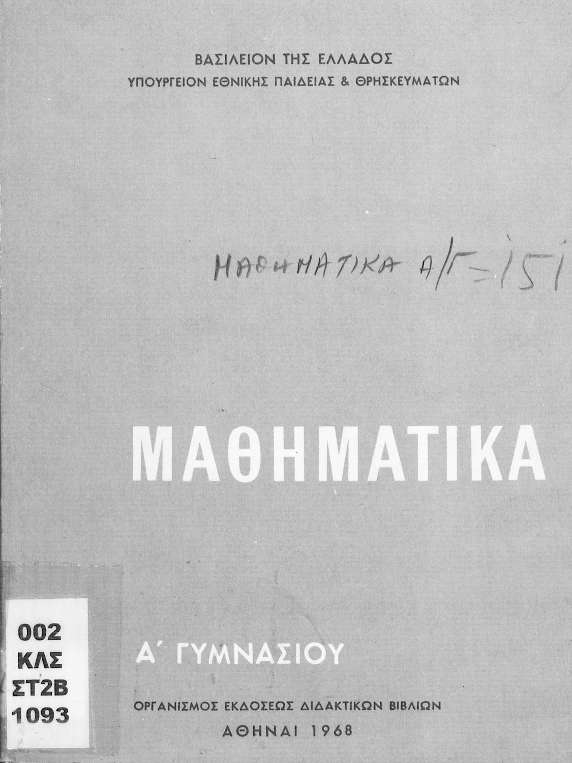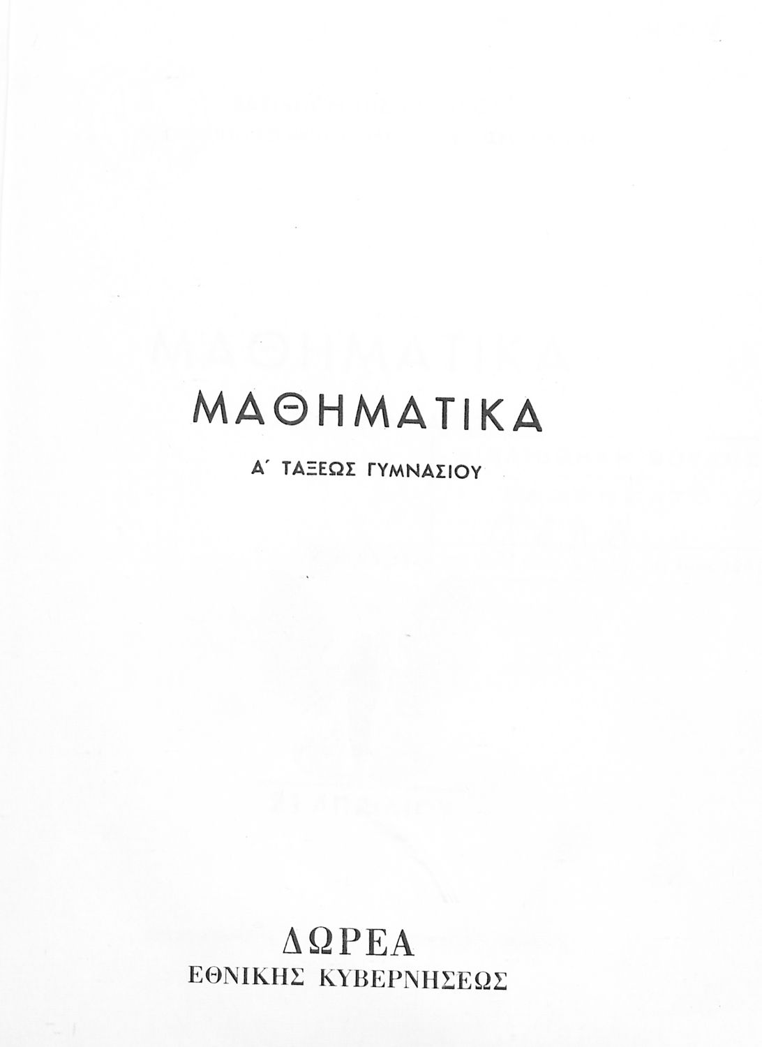 Σχολικό εγχειρίδιο Μαθηματικών Α' Γυμνασίου που περιλαμβάνει γεωμετρία με έμφαση στον υπολογισμό γωνιών και εμβαδού και άλγεβρας με έμφαση στους ακέραιους αριθμούς και τα κλάσματα. Φέρει το σύμβολο της δικτατορίας.