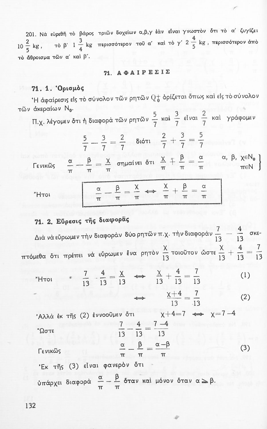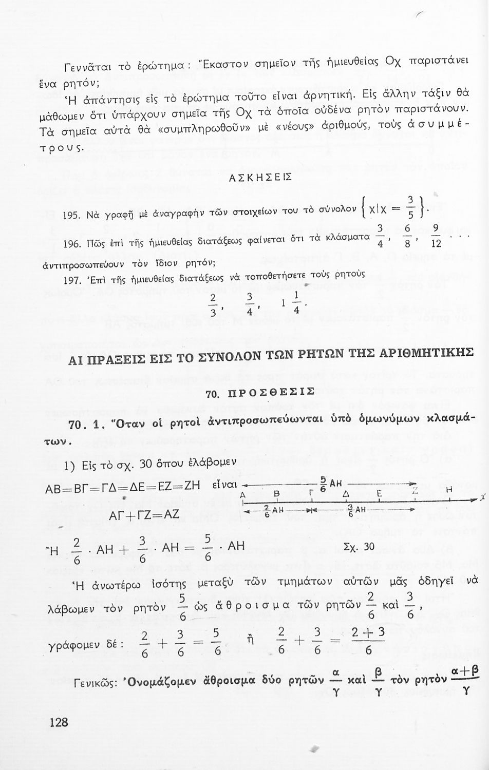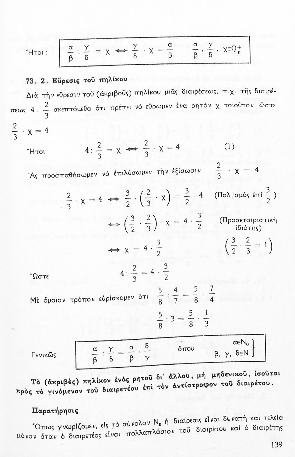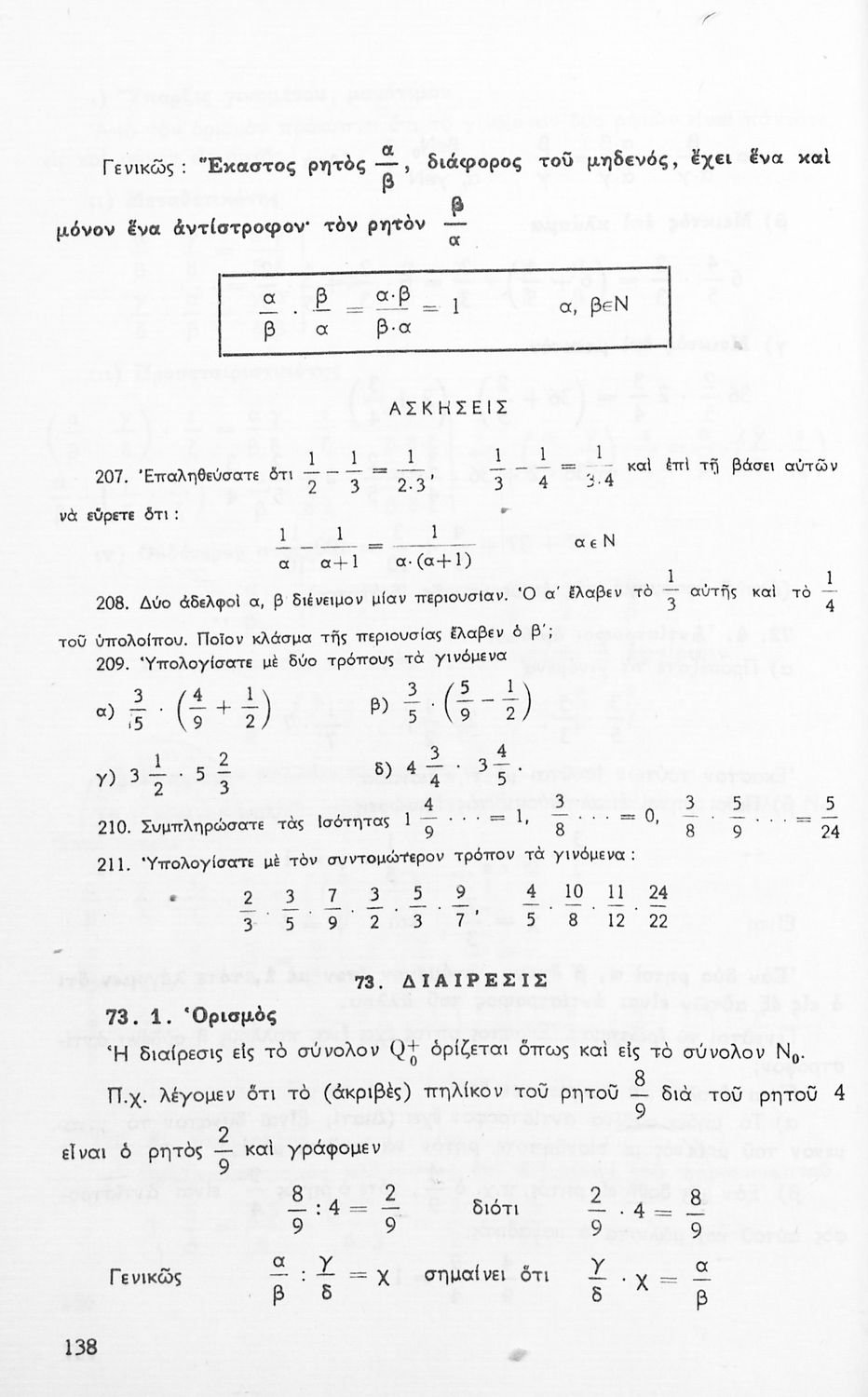 Σχολικό εγχειρίδιο Μαθηματικών Α' Γυμνασίου που περιέχει άλγεβρα με έμφαση στις αριθμητικές πράξεις με ακέραιους, δεκαδικούς και κλάσματα, και γεωμετρία με έμφαση στην επιπεδομετρία. Περιέχει και εισαγωγή στη θεωρία των συνόλων. Φέρει το σύμβολο της δικτατορίας.