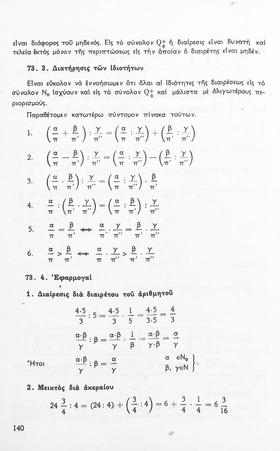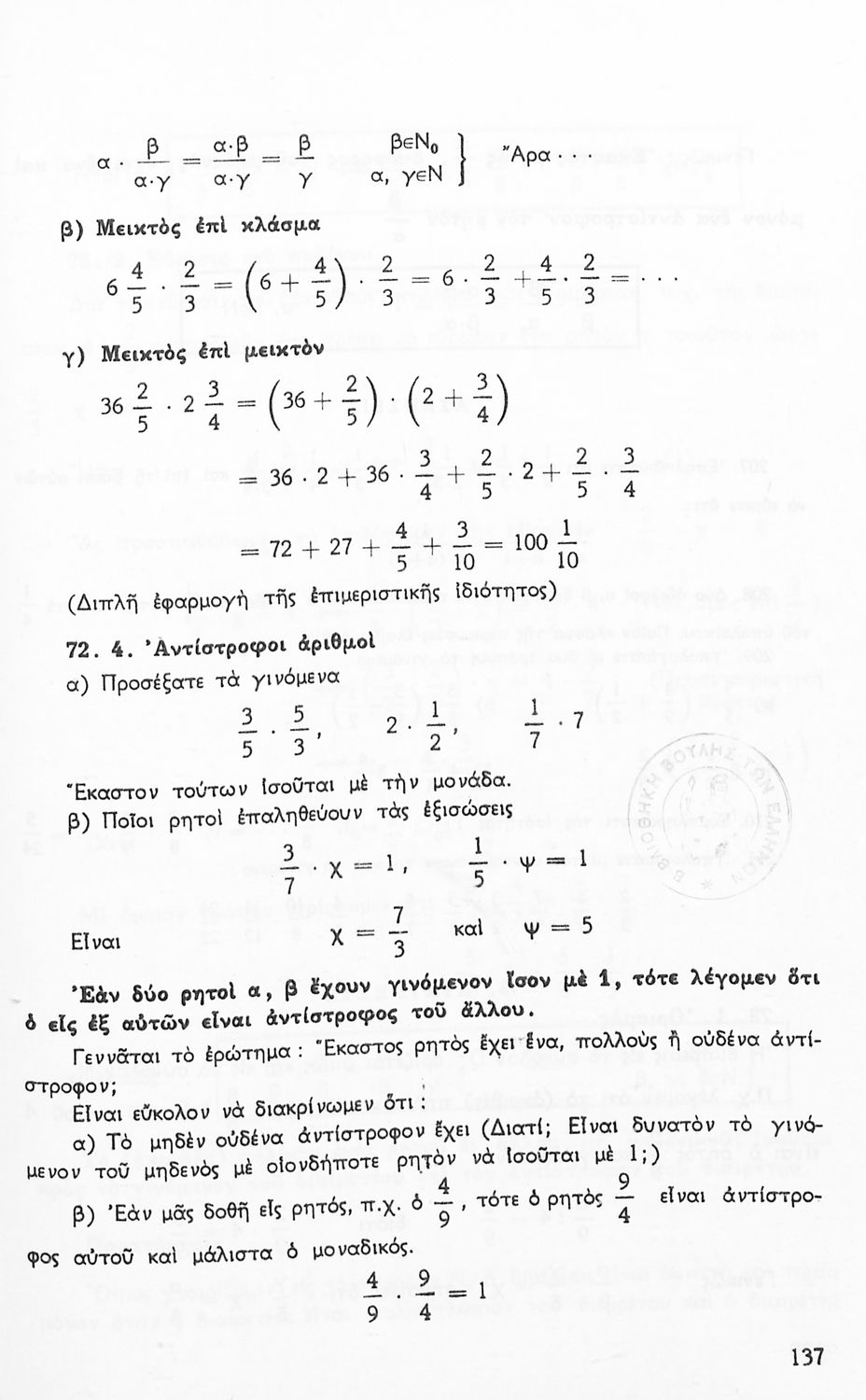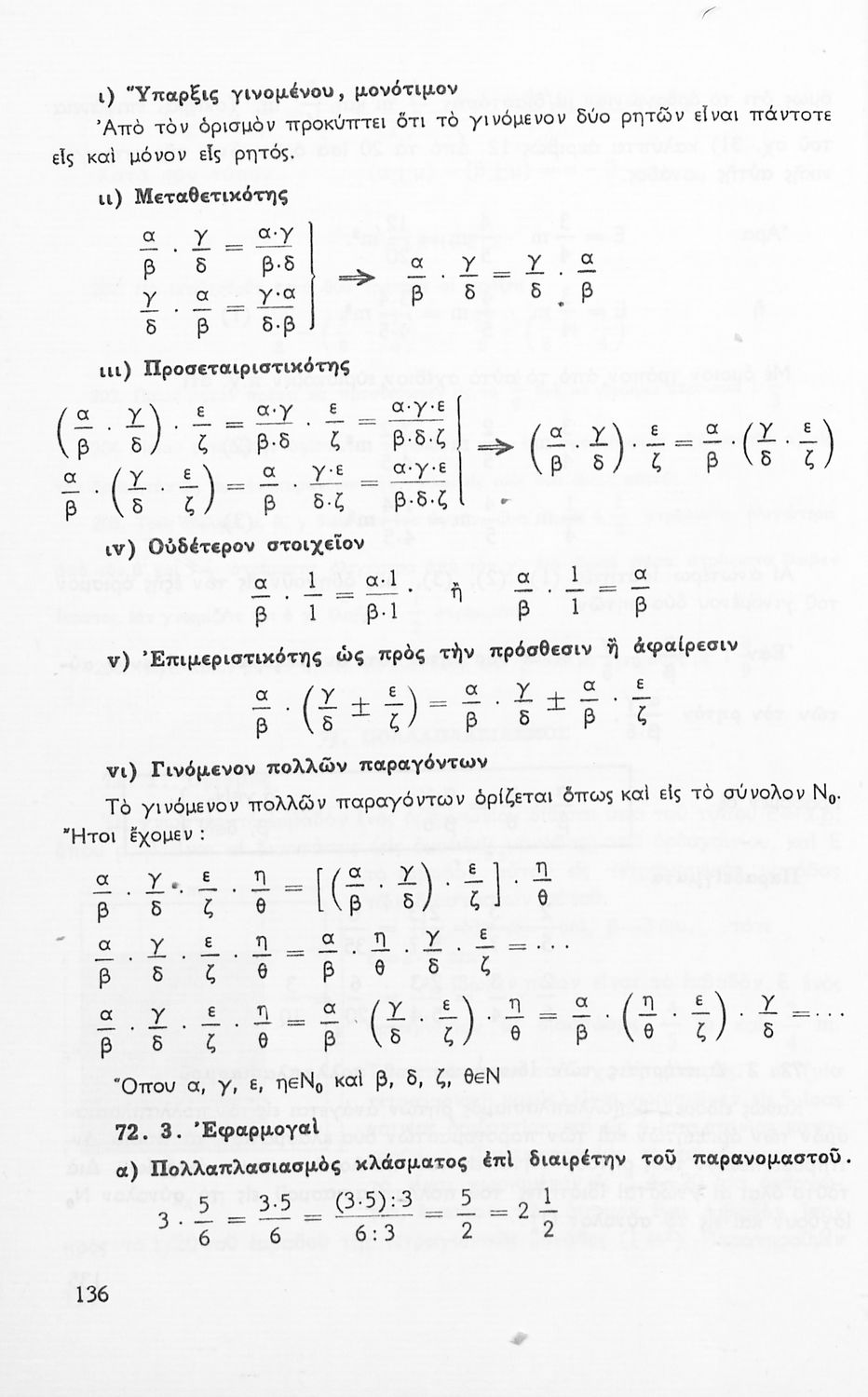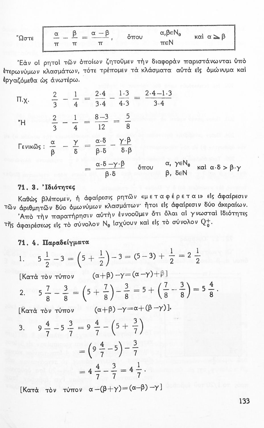 Σχολικό εγχειρίδιο Μαθηματικών Α' Γυμνασίου που περιέχει άλγεβρα με έμφαση στις αριθμητικές πράξεις με ακέραιους, δεκαδικούς και κλάσματα, και γεωμετρία με έμφαση στην επιπεδομετρία. Περιέχει και εισαγωγή στη θεωρία των συνόλων. Φέρει το σύμβολο της δικτατορίας.