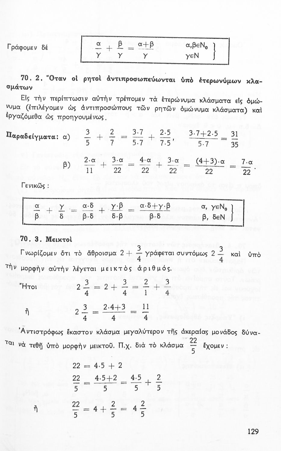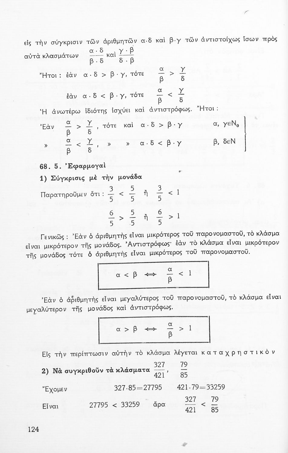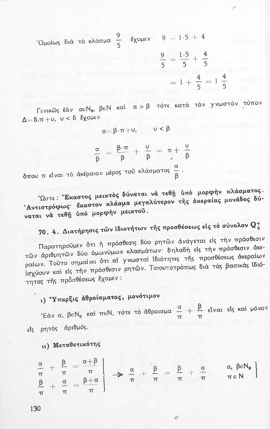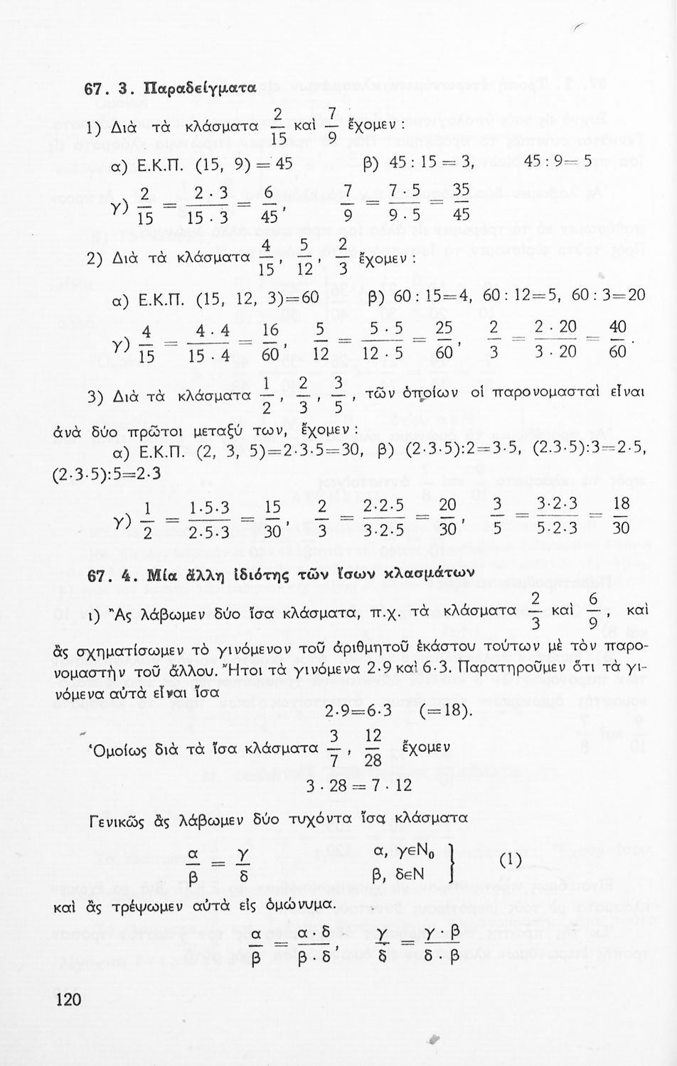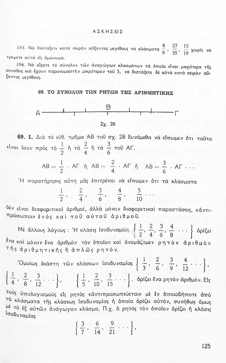 Σχολικό εγχειρίδιο Μαθηματικών Α' Γυμνασίου που περιέχει άλγεβρα με έμφαση στις αριθμητικές πράξεις με ακέραιους, δεκαδικούς και κλάσματα, και γεωμετρία με έμφαση στην επιπεδομετρία. Περιέχει και εισαγωγή στη θεωρία των συνόλων. Φέρει το σύμβολο της δικτατορίας.