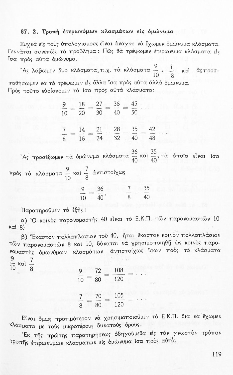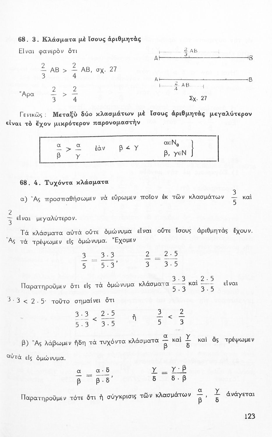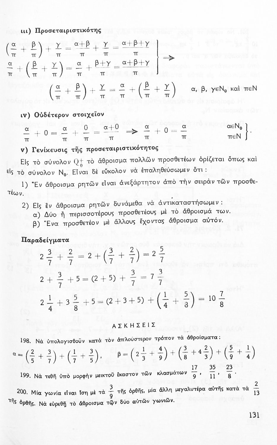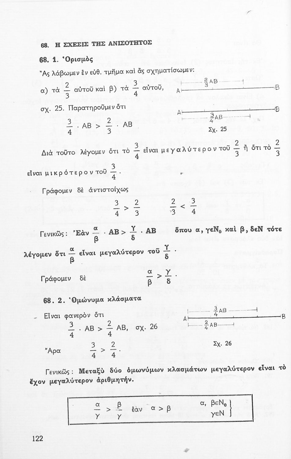 Σχολικό εγχειρίδιο Μαθηματικών Α' Γυμνασίου που περιέχει άλγεβρα με έμφαση στις αριθμητικές πράξεις με ακέραιους, δεκαδικούς και κλάσματα, και γεωμετρία με έμφαση στην επιπεδομετρία. Περιέχει και εισαγωγή στη θεωρία των συνόλων. Φέρει το σύμβολο της δικτατορίας.