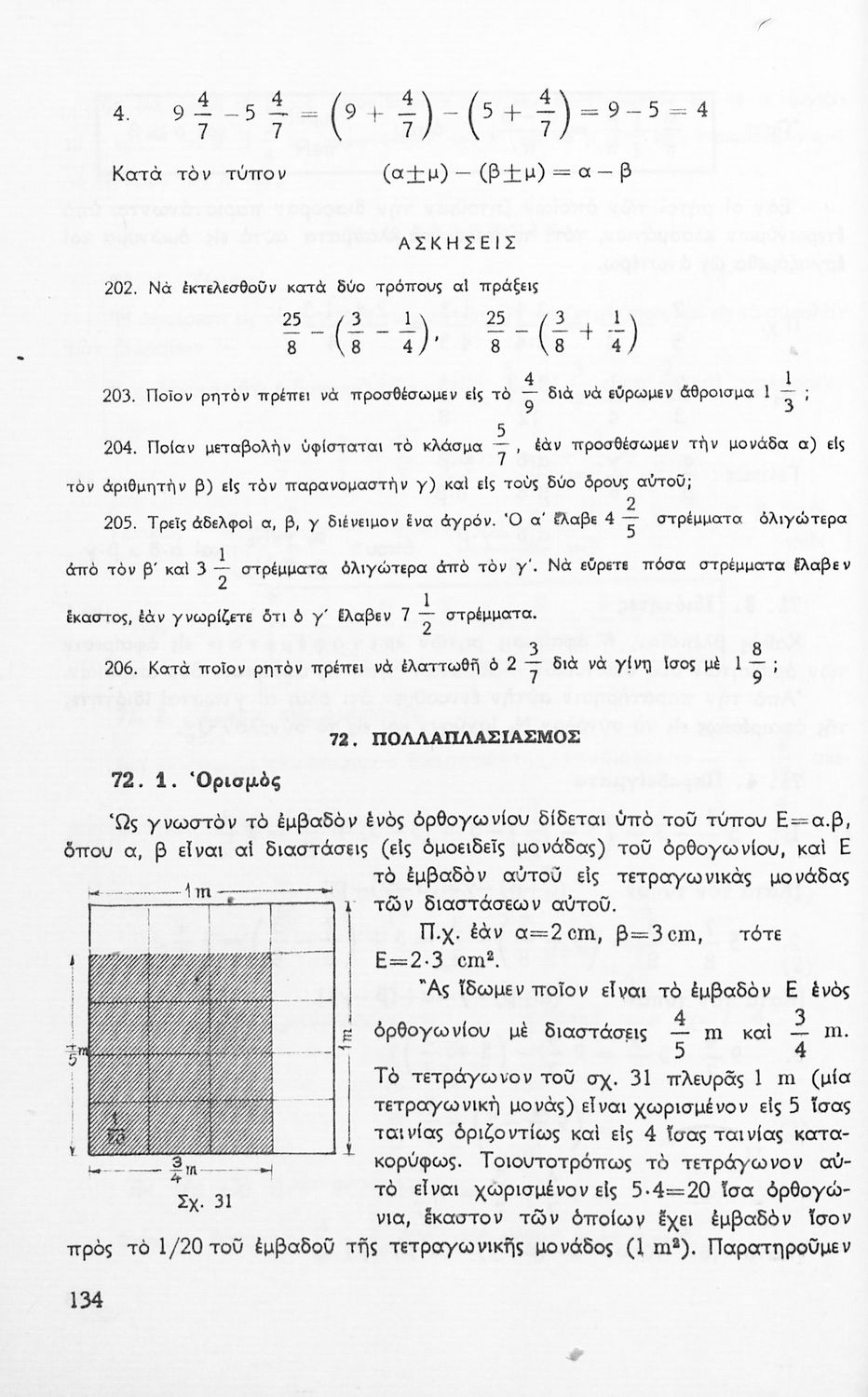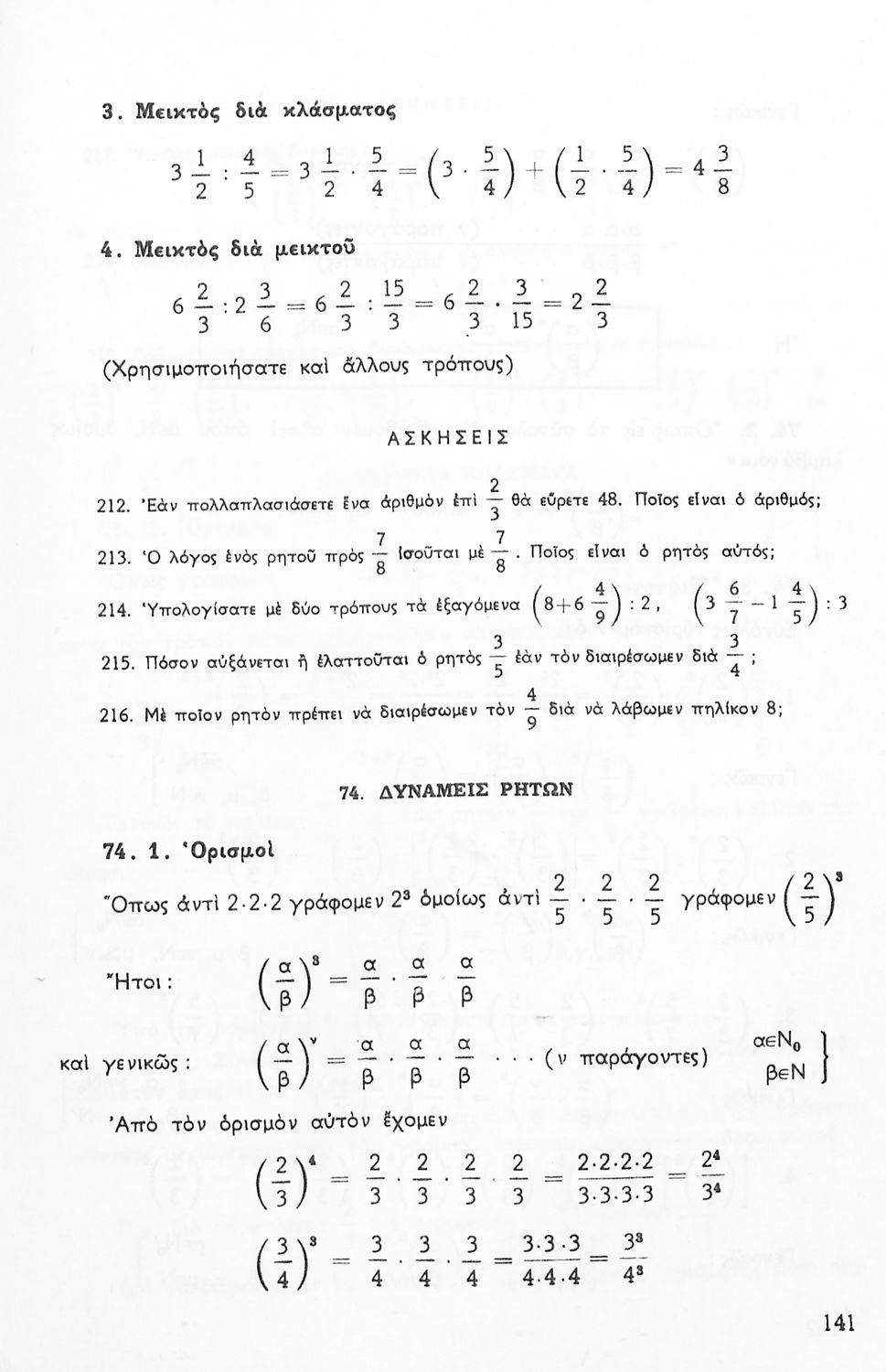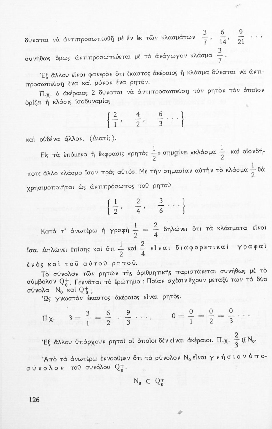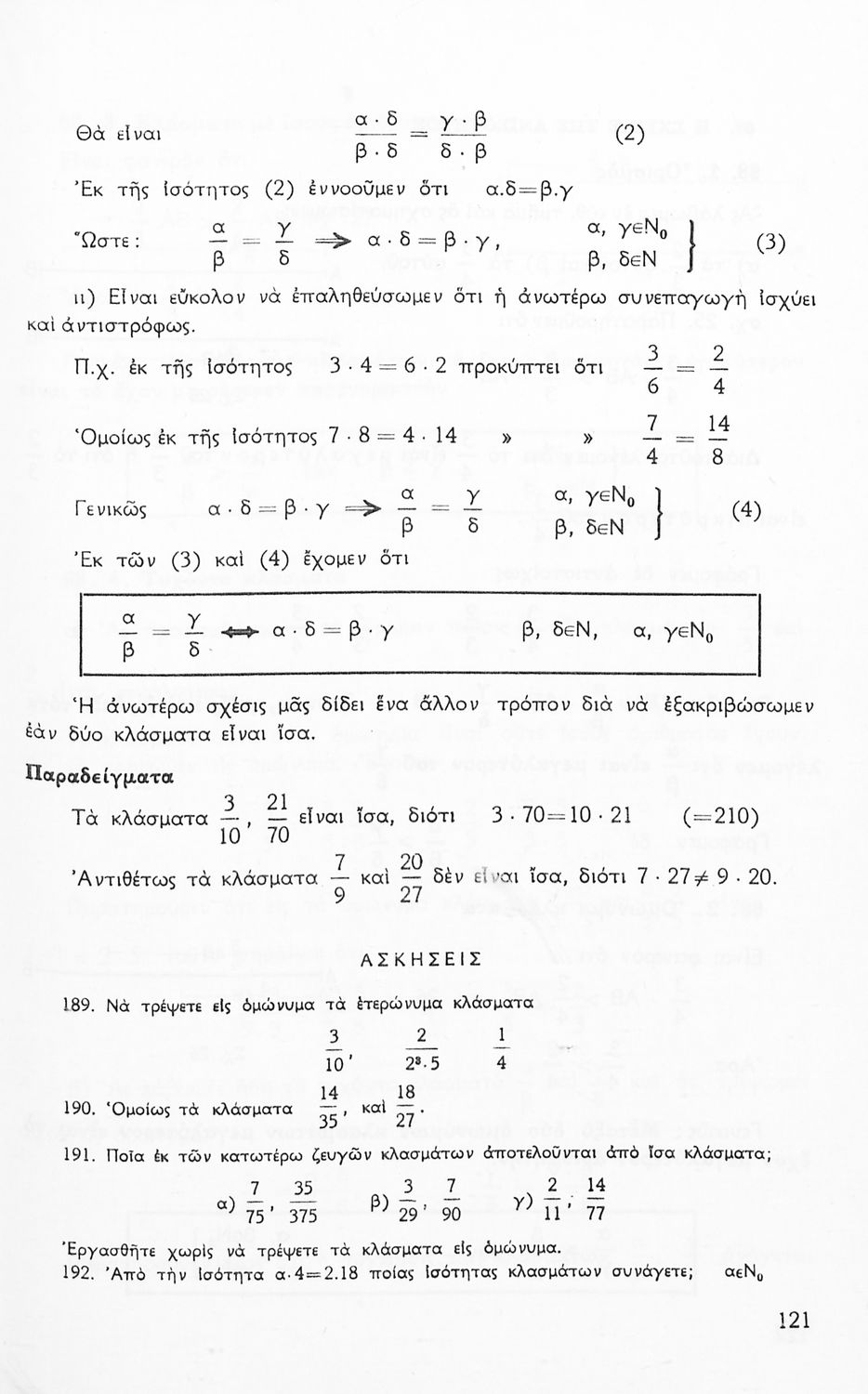 Σχολικό εγχειρίδιο Μαθηματικών Α' Γυμνασίου που περιέχει άλγεβρα με έμφαση στις αριθμητικές πράξεις με ακέραιους, δεκαδικούς και κλάσματα, και γεωμετρία με έμφαση στην επιπεδομετρία. Περιέχει και εισαγωγή στη θεωρία των συνόλων. Φέρει το σύμβολο της δικτατορίας.