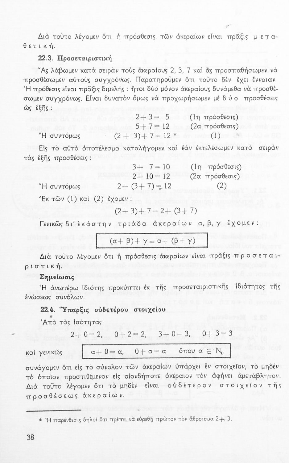Σχολικό εγχειρίδιο Μαθηματικών Α' Γυμνασίου που περιέχει άλγεβρα με έμφαση στις αριθμητικές πράξεις με ακέραιους, δεκαδικούς και κλάσματα, και γεωμετρία με έμφαση στην επιπεδομετρία. Περιέχει και εισαγωγή στη θεωρία των συνόλων. Φέρει το σύμβολο της δικτατορίας.