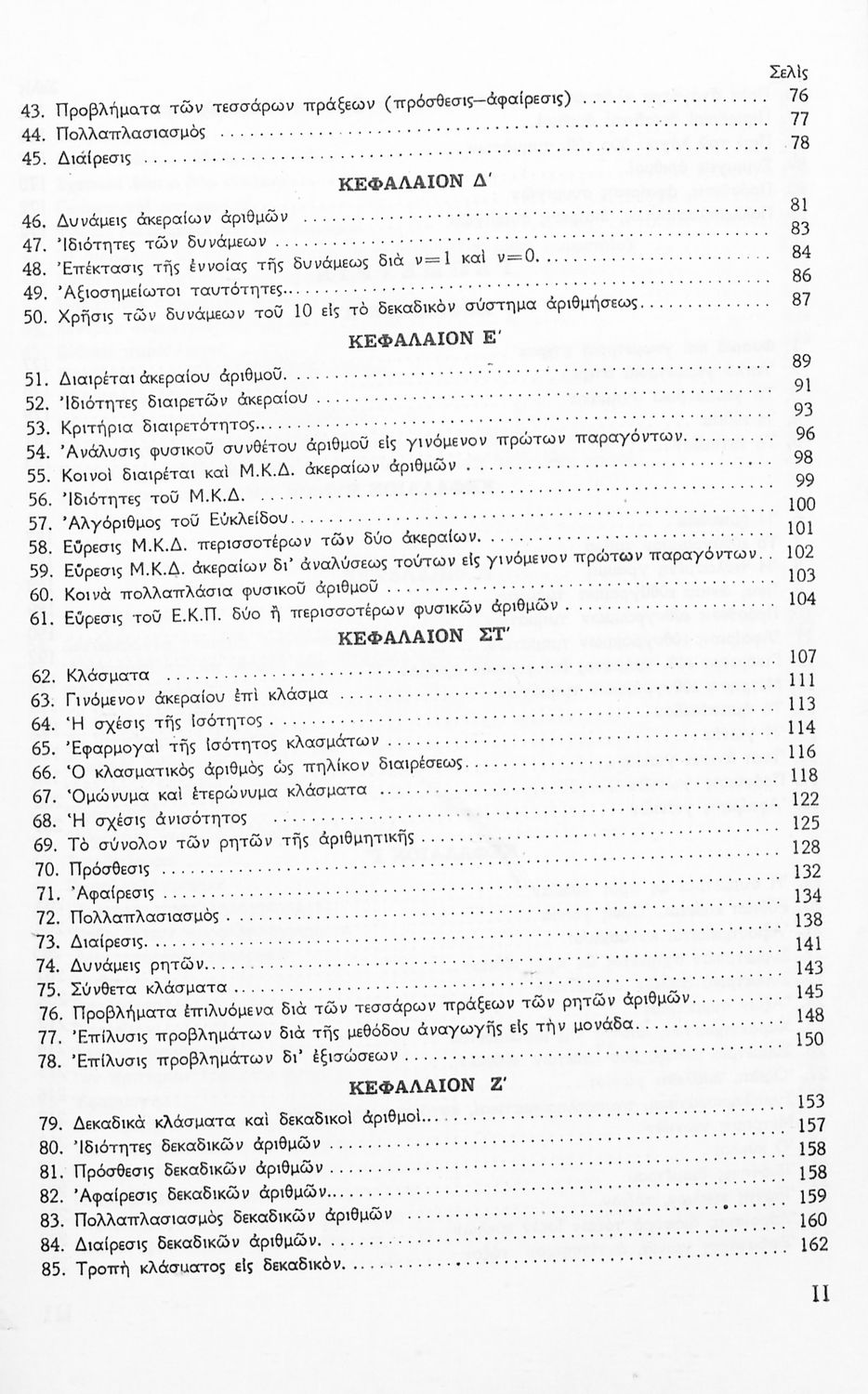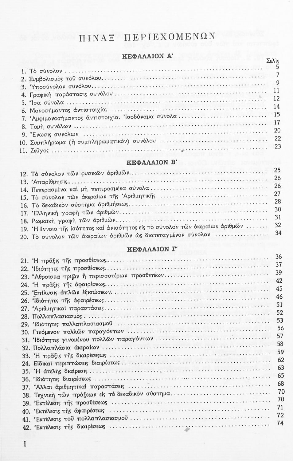 Σχολικό εγχειρίδιο Μαθηματικών Α' Γυμνασίου που περιέχει άλγεβρα με έμφαση στις αριθμητικές πράξεις με ακέραιους, δεκαδικούς και κλάσματα, και γεωμετρία με έμφαση στην επιπεδομετρία. Περιέχει και εισαγωγή στη θεωρία των συνόλων. Φέρει το σύμβολο της δικτατορίας.