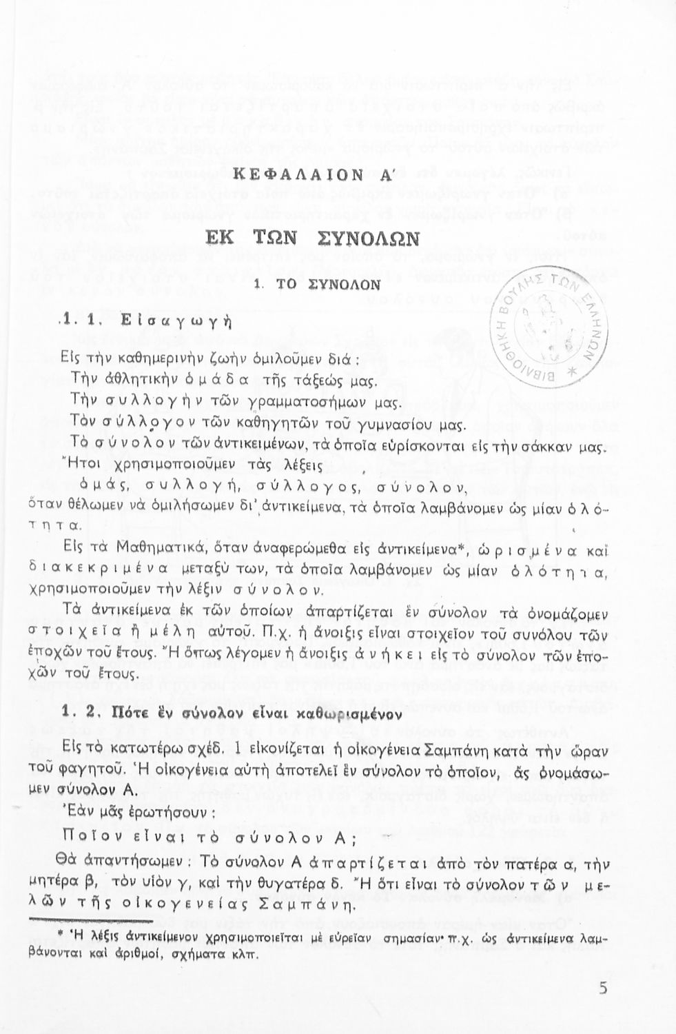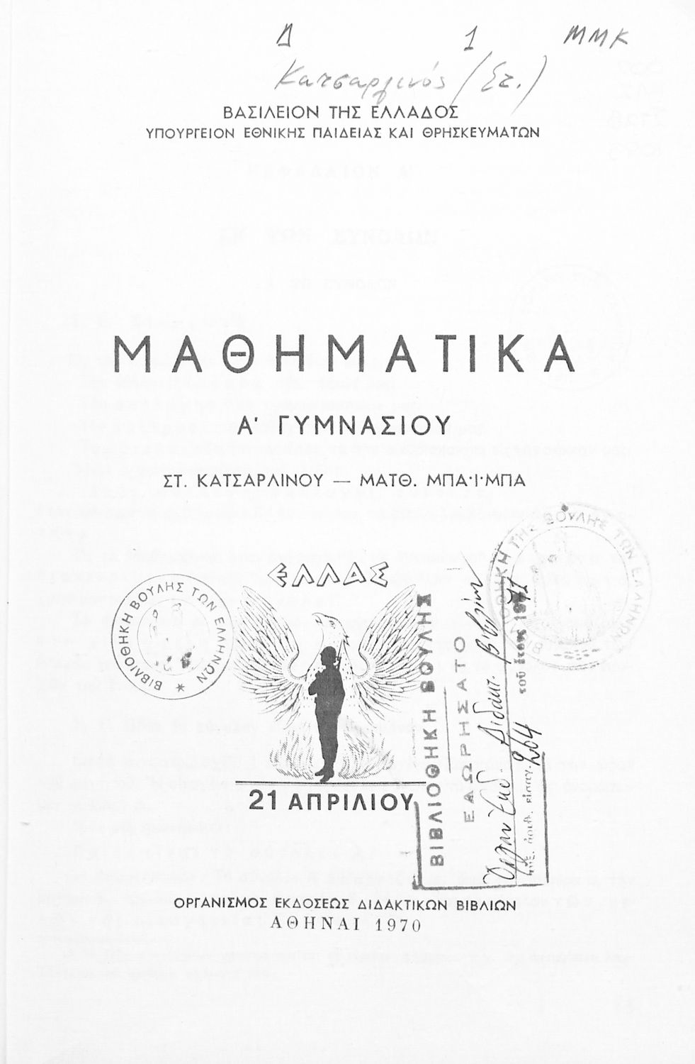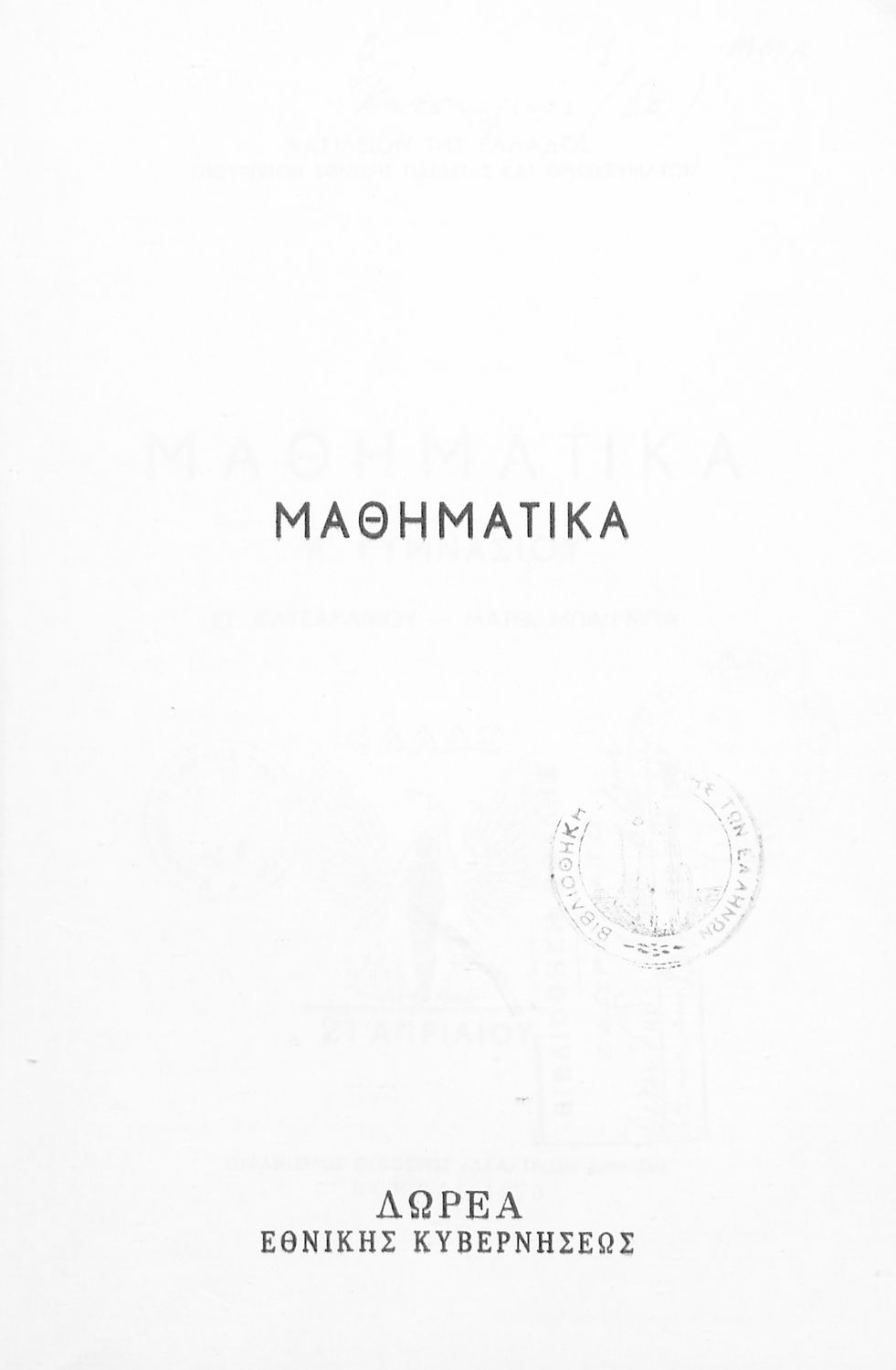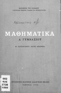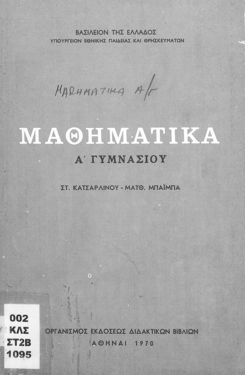 Σχολικό εγχειρίδιο Μαθηματικών Α' Γυμνασίου που περιέχει άλγεβρα με έμφαση στις αριθμητικές πράξεις με ακέραιους, δεκαδικούς και κλάσματα, και γεωμετρία με έμφαση στην επιπεδομετρία. Περιέχει και εισαγωγή στη θεωρία των συνόλων. Φέρει το σύμβολο της δικτατορίας.