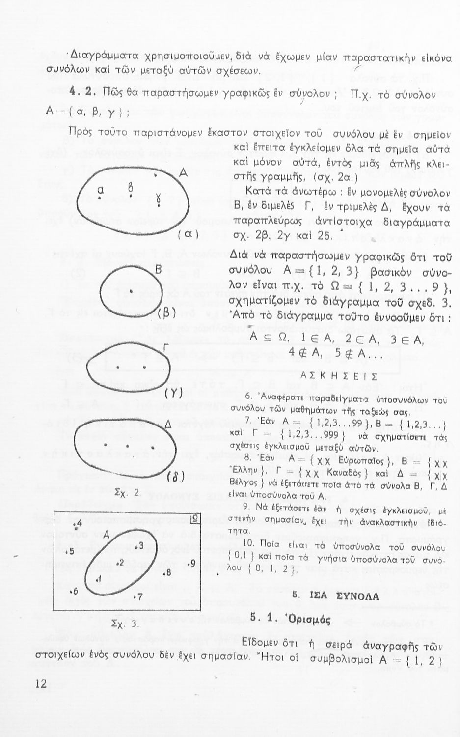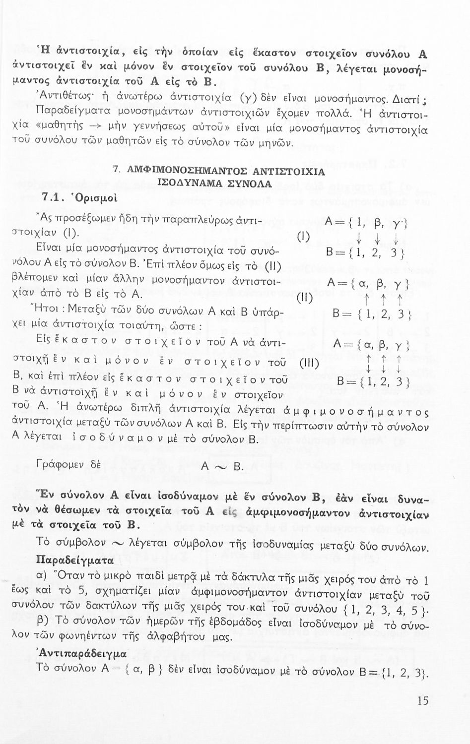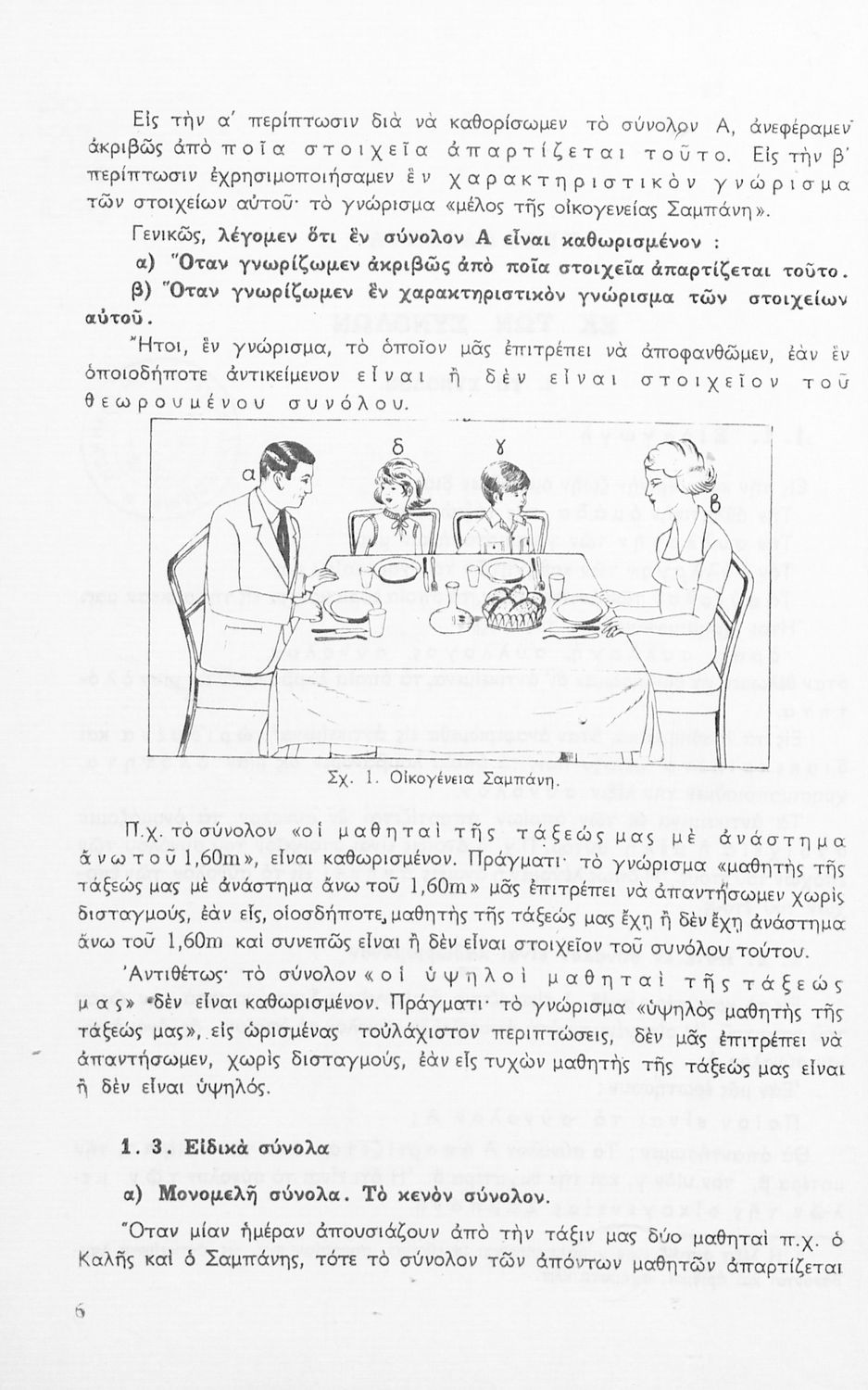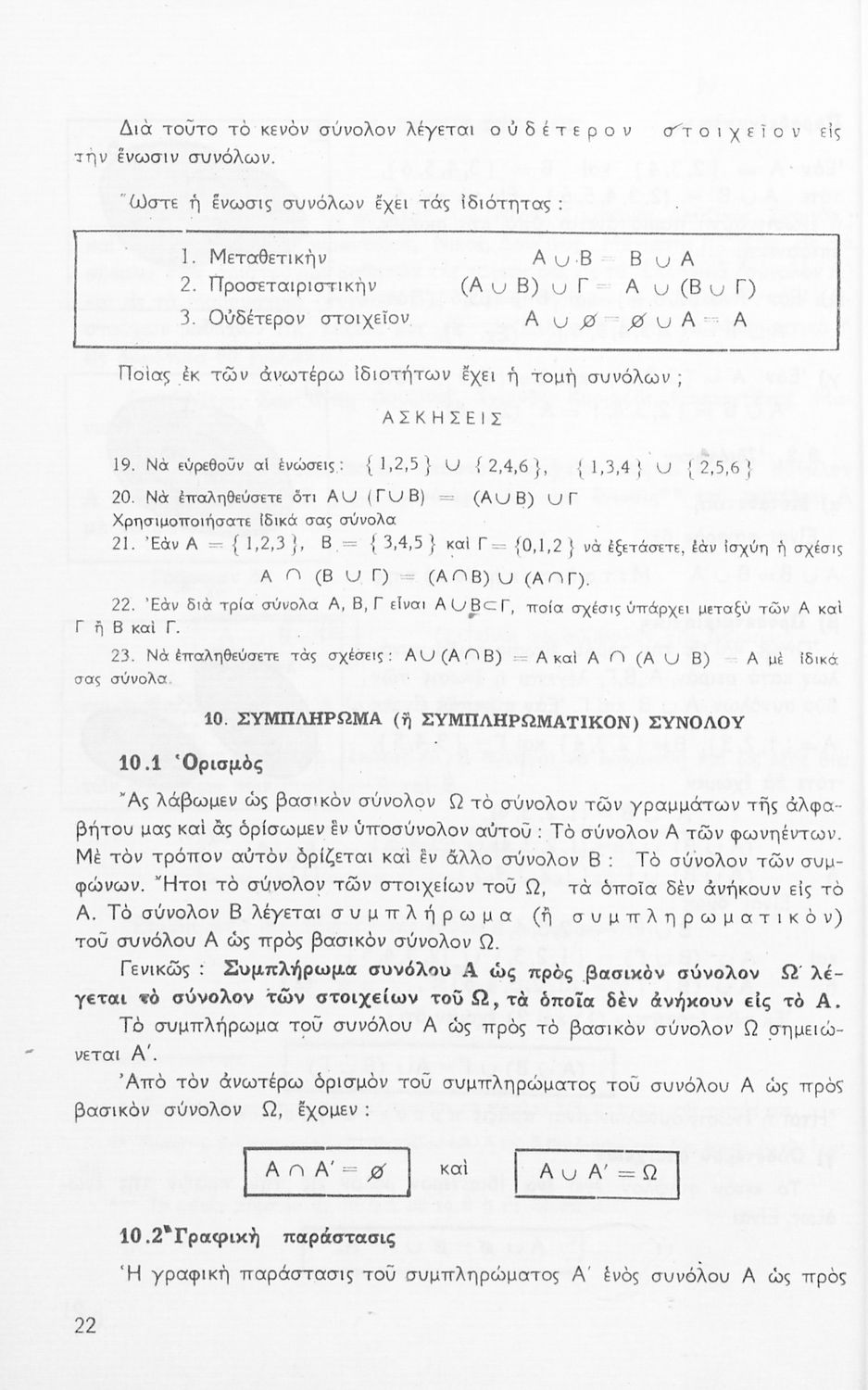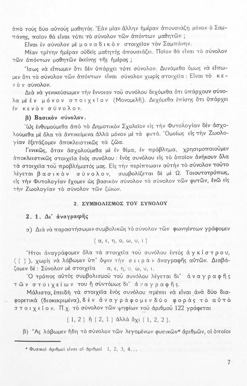 Σχολικό εγχειρίδιο Μαθηματικών Α' Γυμνασίου που περιέχει άλγεβρα με έμφαση στις αριθμητικές πράξεις με ακέραιους, δεκαδικούς και κλάσματα, και γεωμετρία με έμφαση στην επιπεδομετρία. Περιέχει και εισαγωγή στη θεωρία των συνόλων. Φέρει το σύμβολο της δικτατορίας.