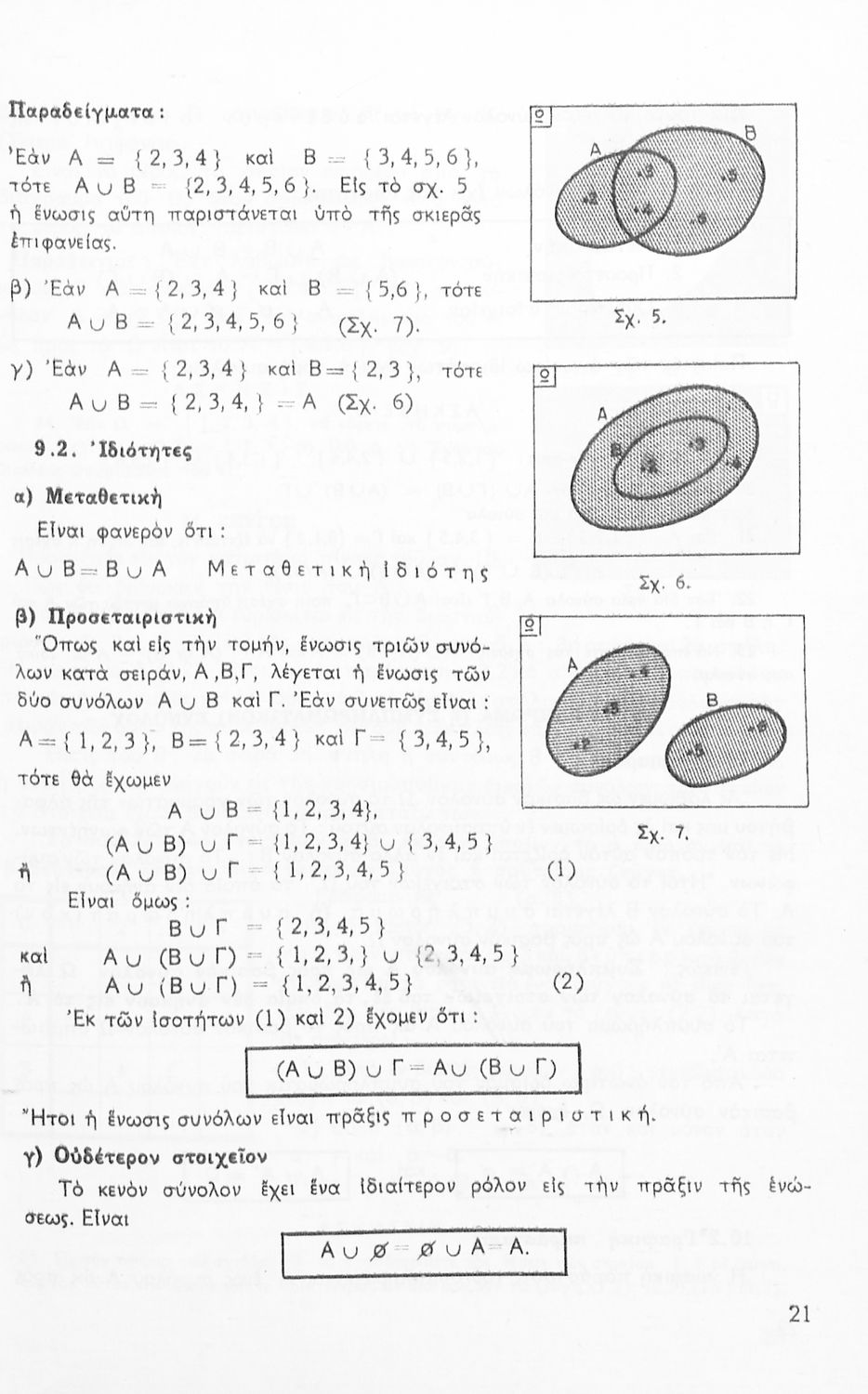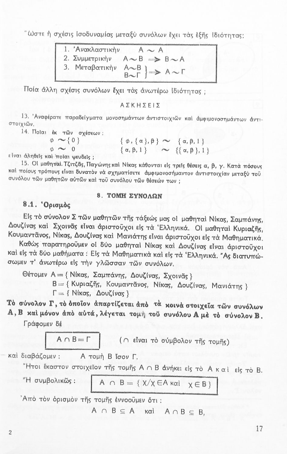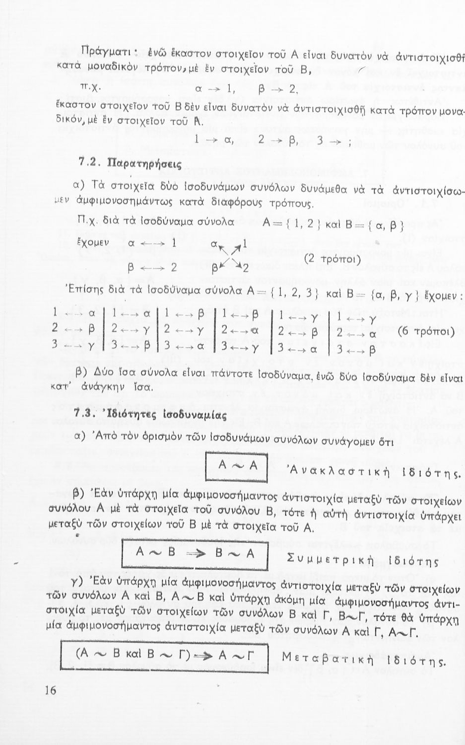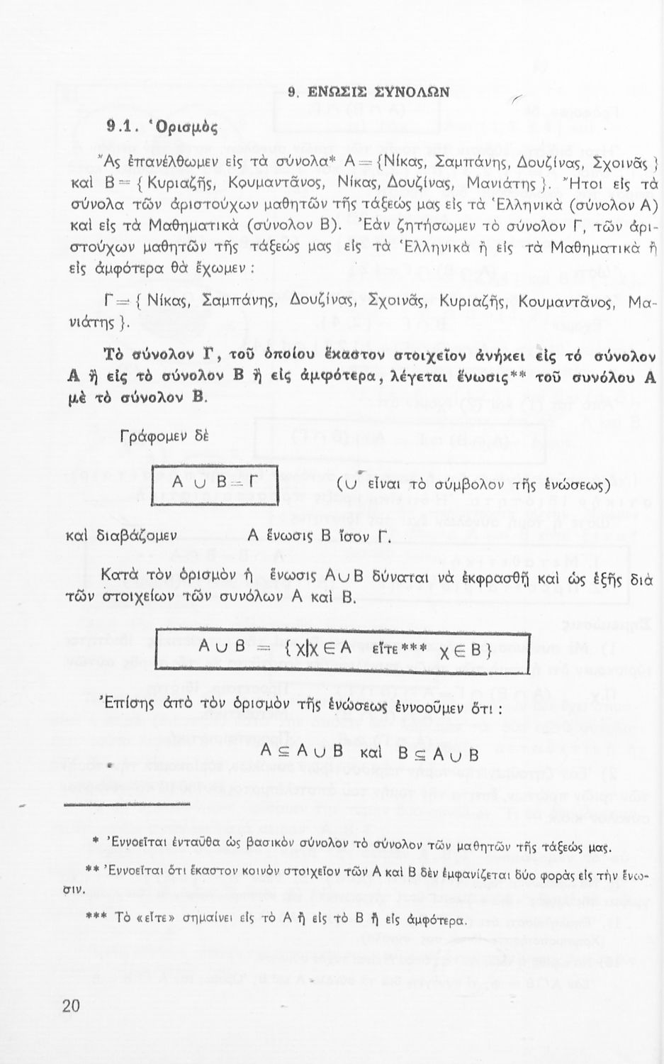 Σχολικό εγχειρίδιο Μαθηματικών Α' Γυμνασίου που περιέχει άλγεβρα με έμφαση στις αριθμητικές πράξεις με ακέραιους, δεκαδικούς και κλάσματα, και γεωμετρία με έμφαση στην επιπεδομετρία. Περιέχει και εισαγωγή στη θεωρία των συνόλων. Φέρει το σύμβολο της δικτατορίας.