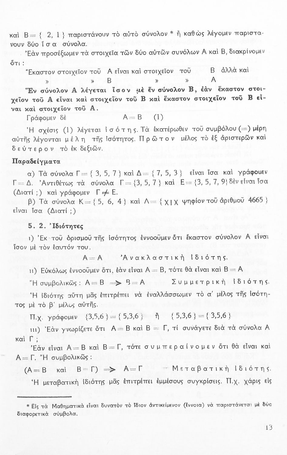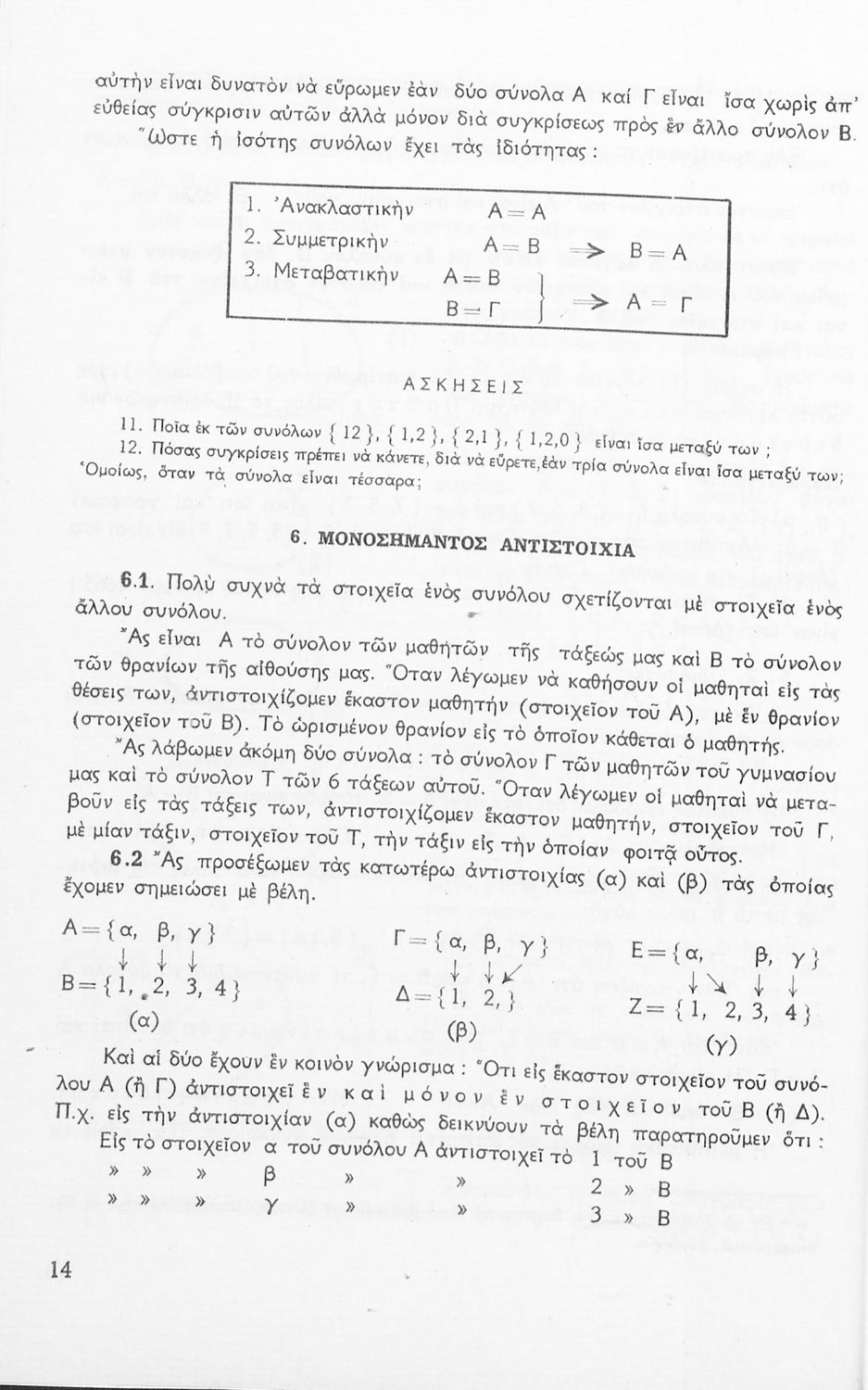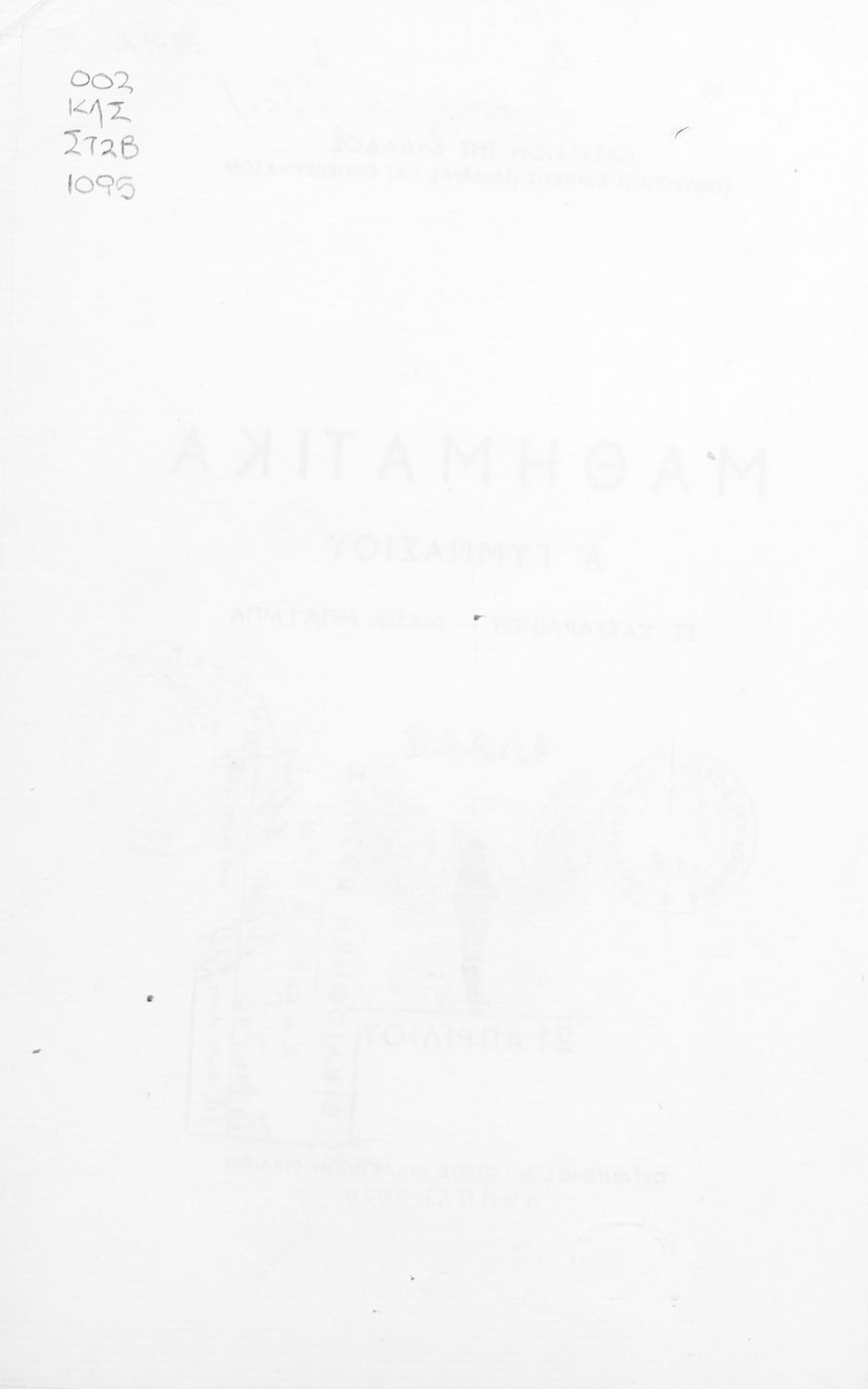 Βαθμίδα εκπαίδευσης: Δευτεροβάθμια Τάξη: Α' Γυμνασίου Μάθημα: Μαθηματικά Γλώσσα: Καθαρεύουσα Παρουσίαση περιεχομένου: Σχολικό εγχειρίδιο Μαθηματικών Α' Γυμνασίου που περιέχει άλγεβρα με έμφαση στις αριθμητικές πράξεις με ακέραιους, δεκαδικούς και κλάσματα, και γεωμετρία με έμφαση στην επιπεδομετρία. Περιέχει και εισαγωγή στη θεωρία των συνόλων. Φέρει το σύμβολο της δικτατορίας. |