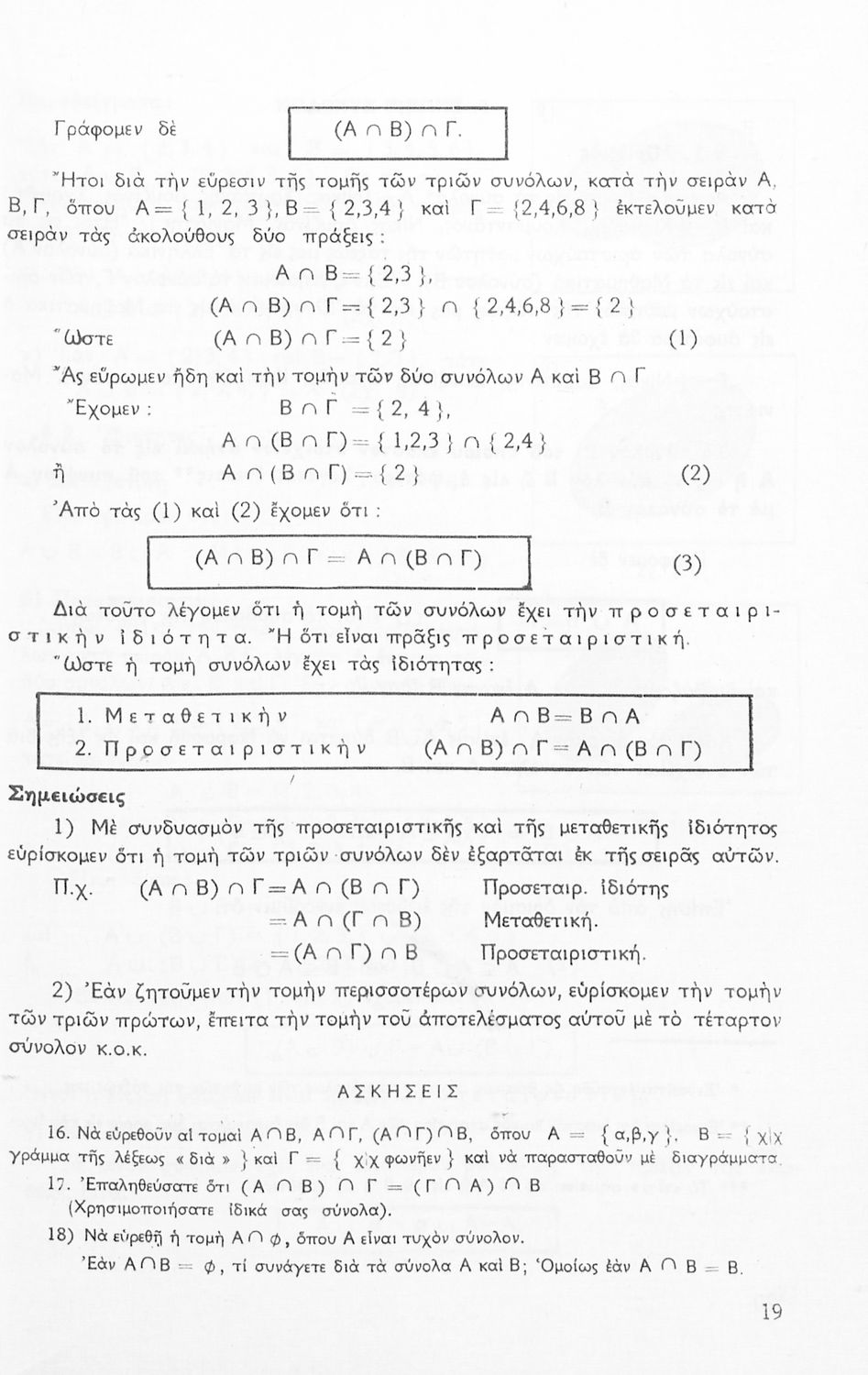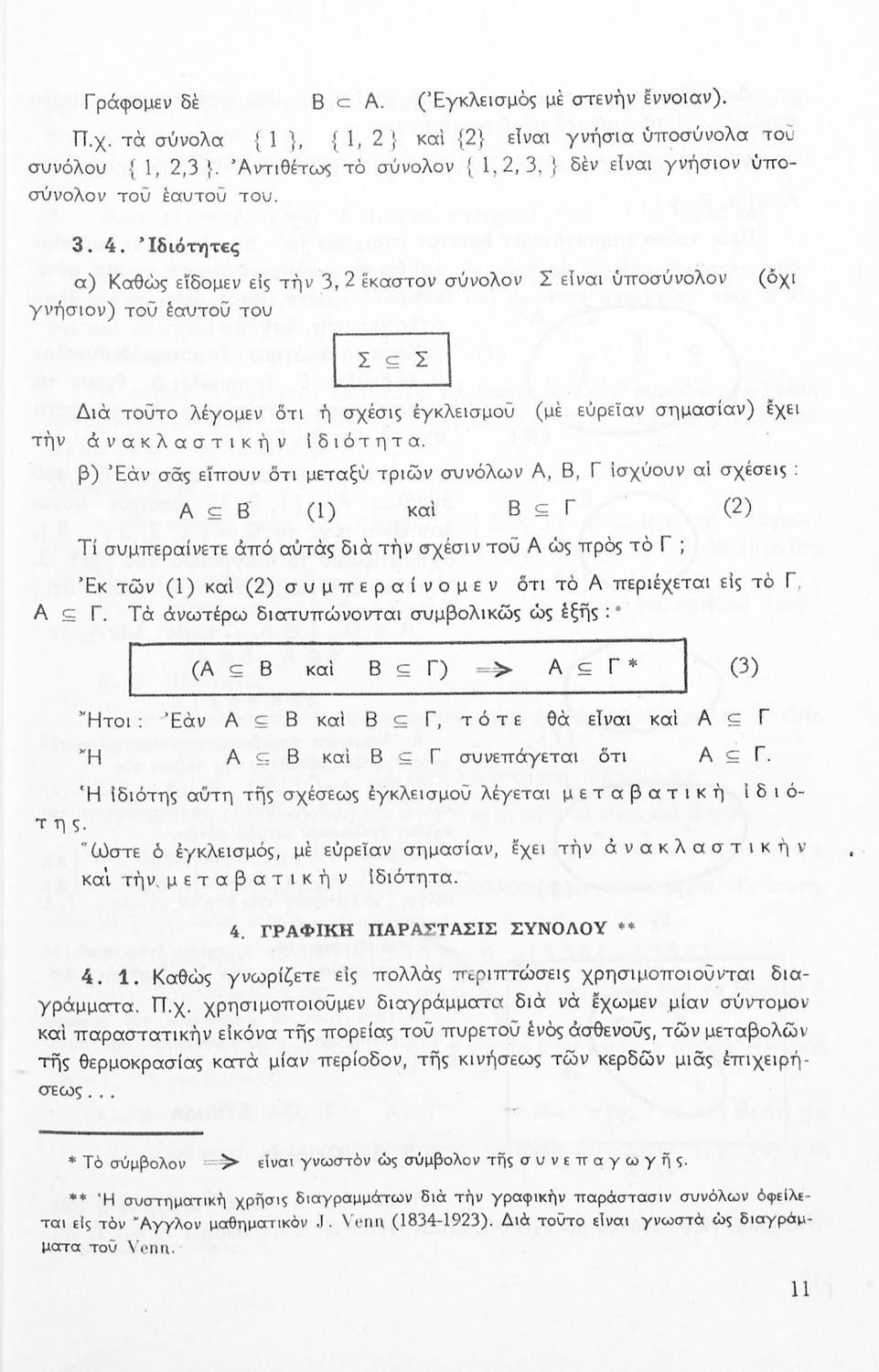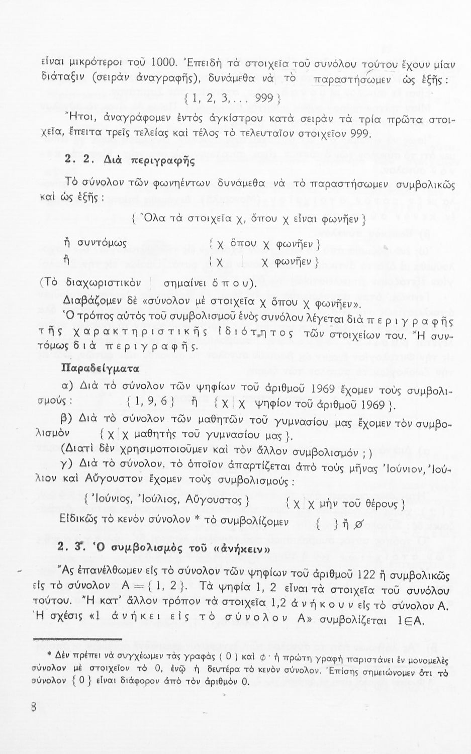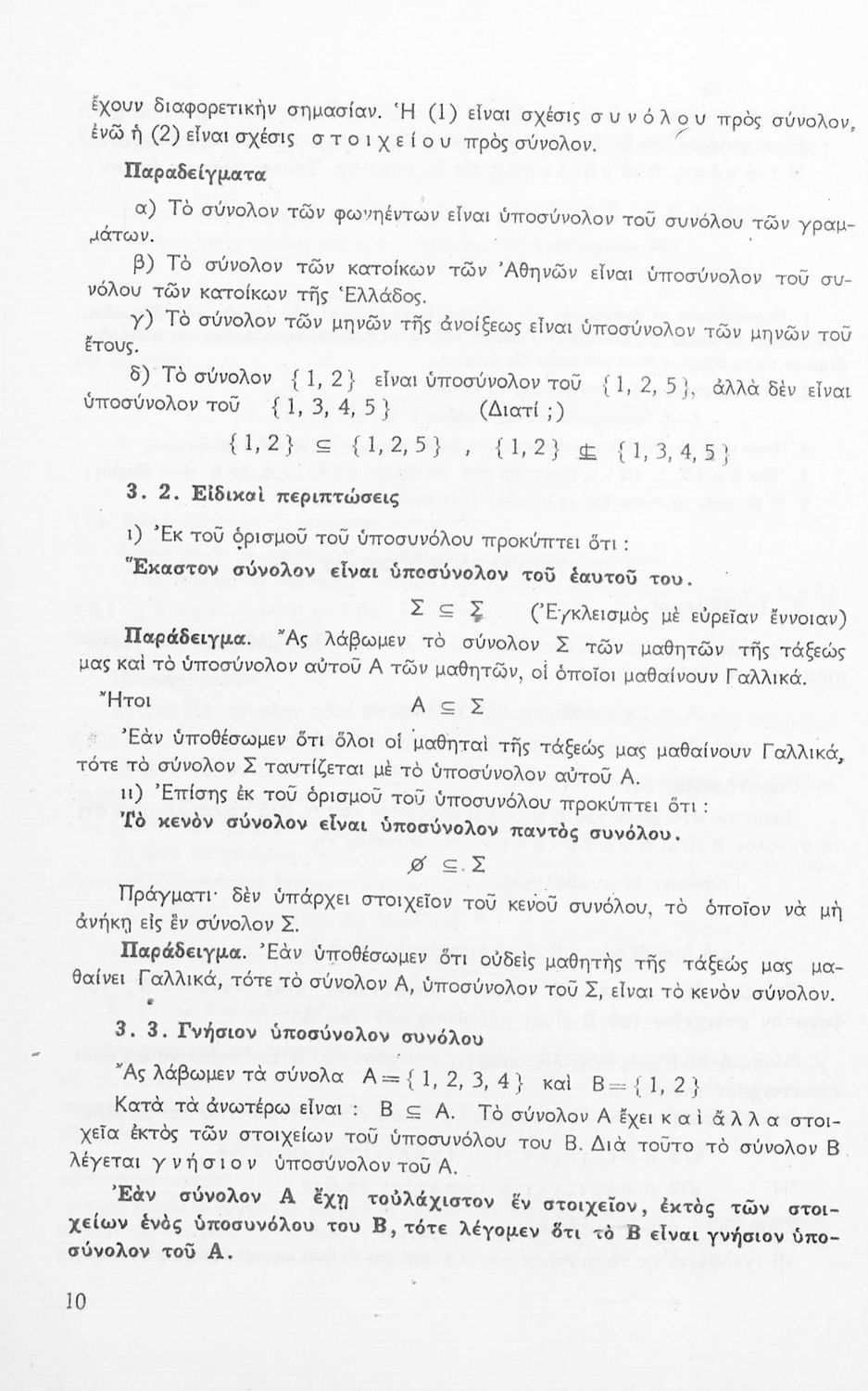 Βαθμίδα εκπαίδευσης: Δευτεροβάθμια Τάξη: Α' Γυμνασίου Μάθημα: Μαθηματικά Γλώσσα: Καθαρεύουσα Παρουσίαση περιεχομένου: Σχολικό εγχειρίδιο Μαθηματικών Α' Γυμνασίου που περιέχει άλγεβρα με έμφαση στις αριθμητικές πράξεις με ακέραιους, δεκαδικούς και κλάσματα, και γεωμετρία με έμφαση στην επιπεδομετρία. Περιέχει και εισαγωγή στη θεωρία των συνόλων. Φέρει το σύμβολο της δικτατορίας. |