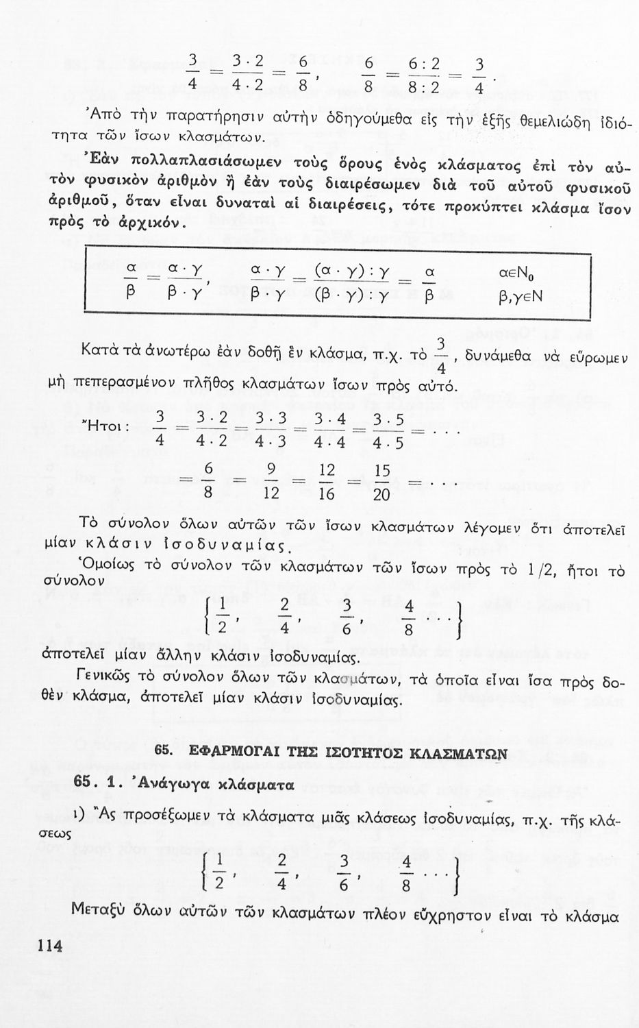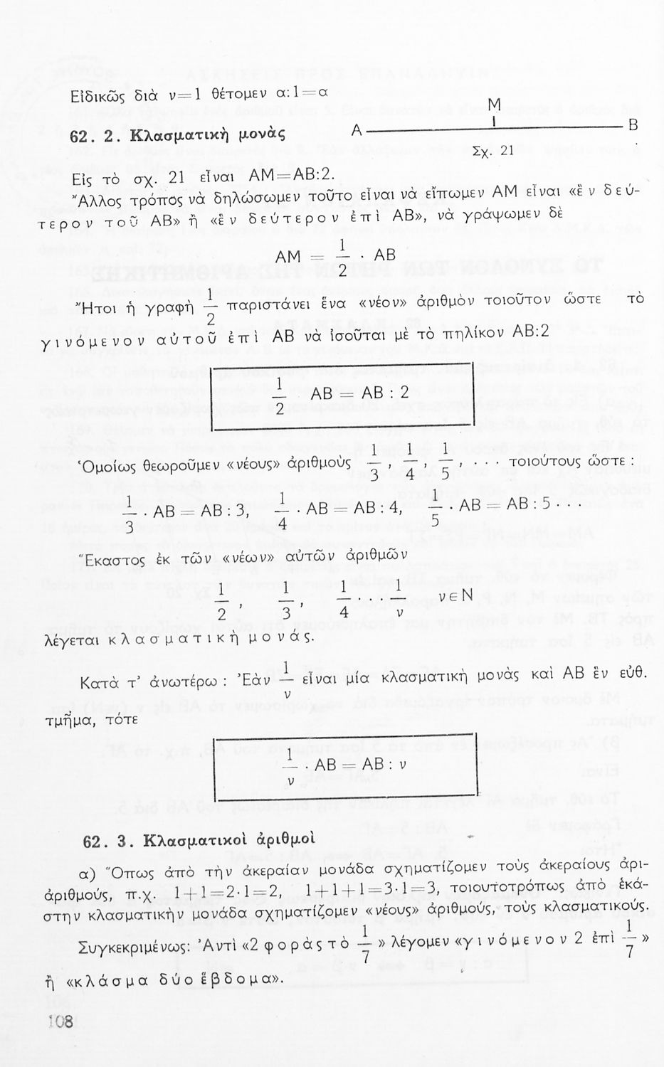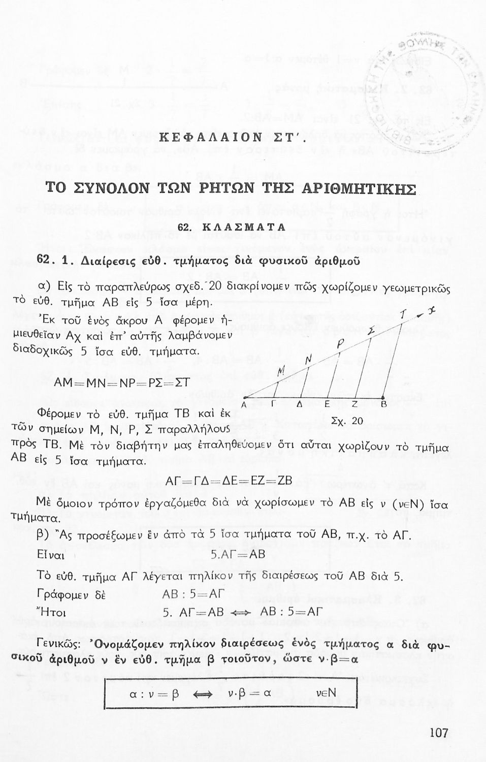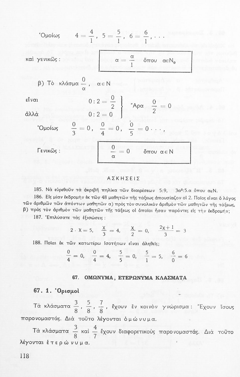 Σχολικό εγχειρίδιο Μαθηματικών Α' Γυμνασίου που περιέχει άλγεβρα με έμφαση στις αριθμητικές πράξεις με ακέραιους, δεκαδικούς και κλάσματα, και γεωμετρία με έμφαση στην επιπεδομετρία. Περιέχει και εισαγωγή στη θεωρία των συνόλων. Φέρει το σύμβολο της δικτατορίας.