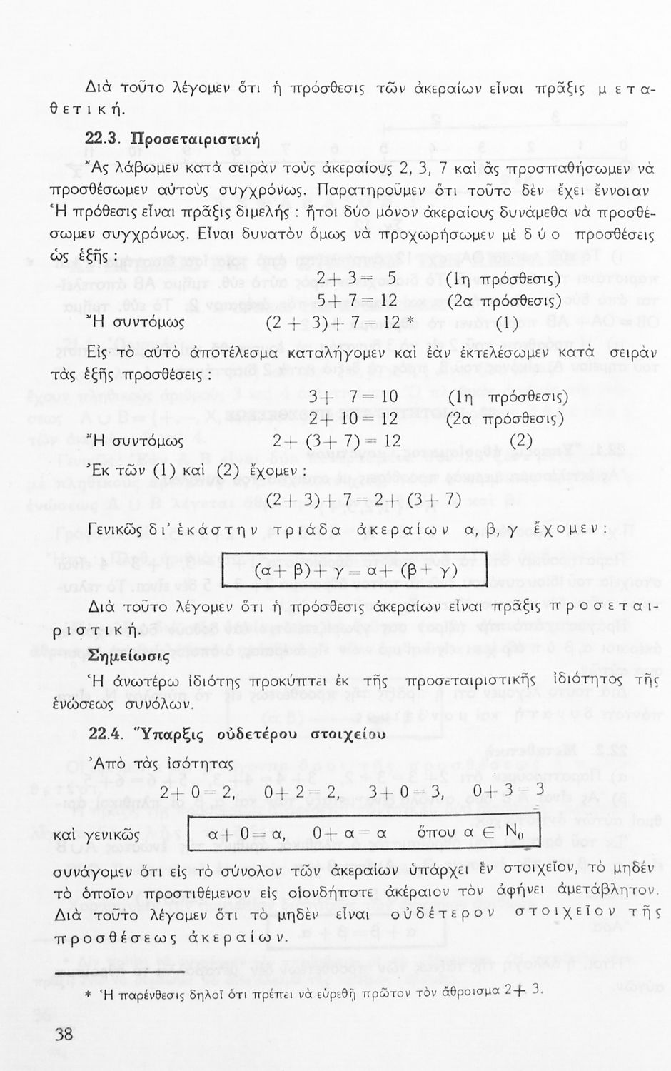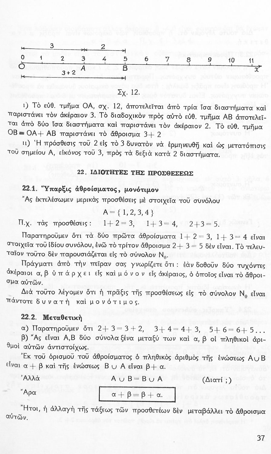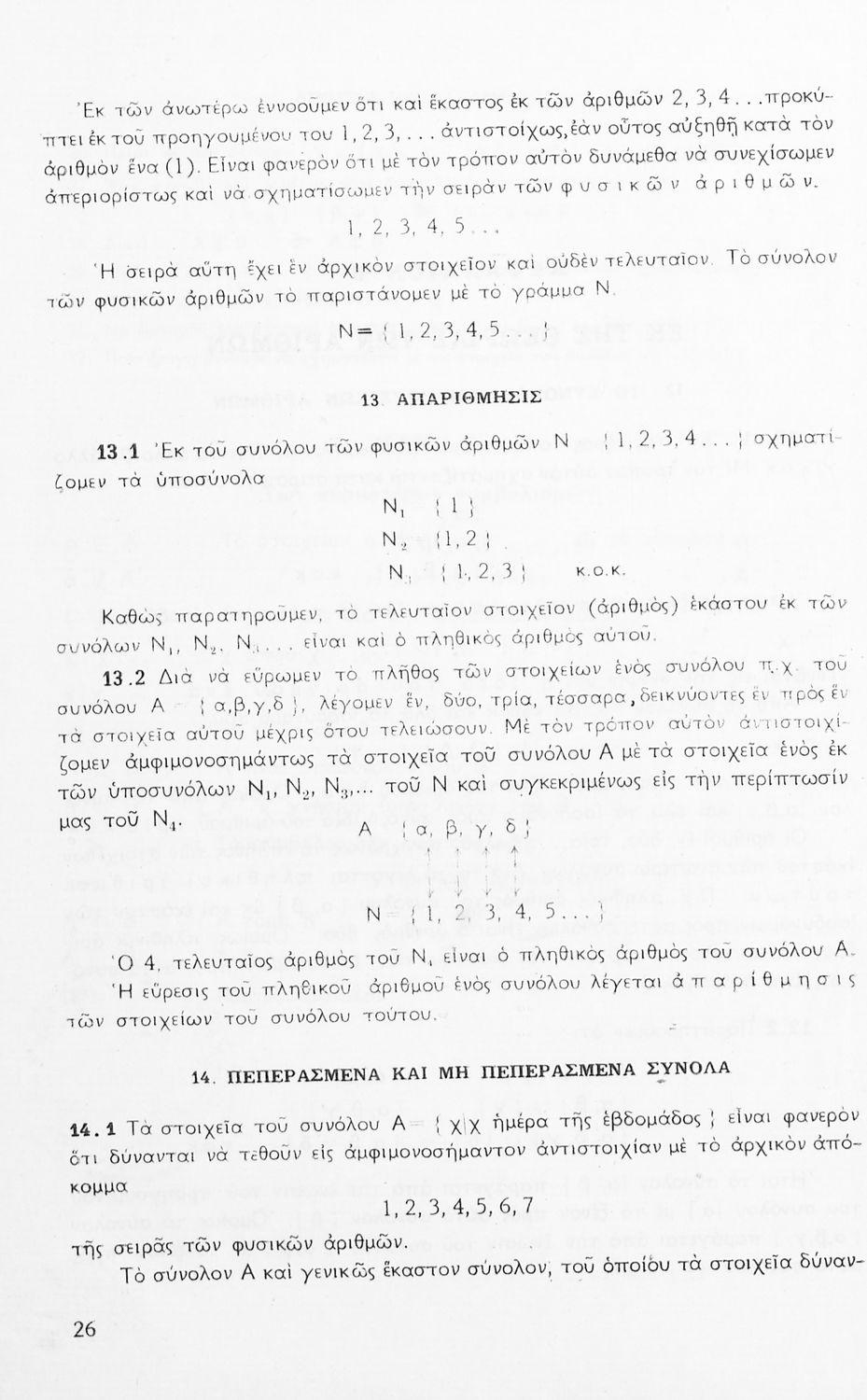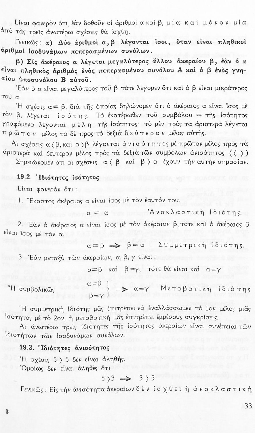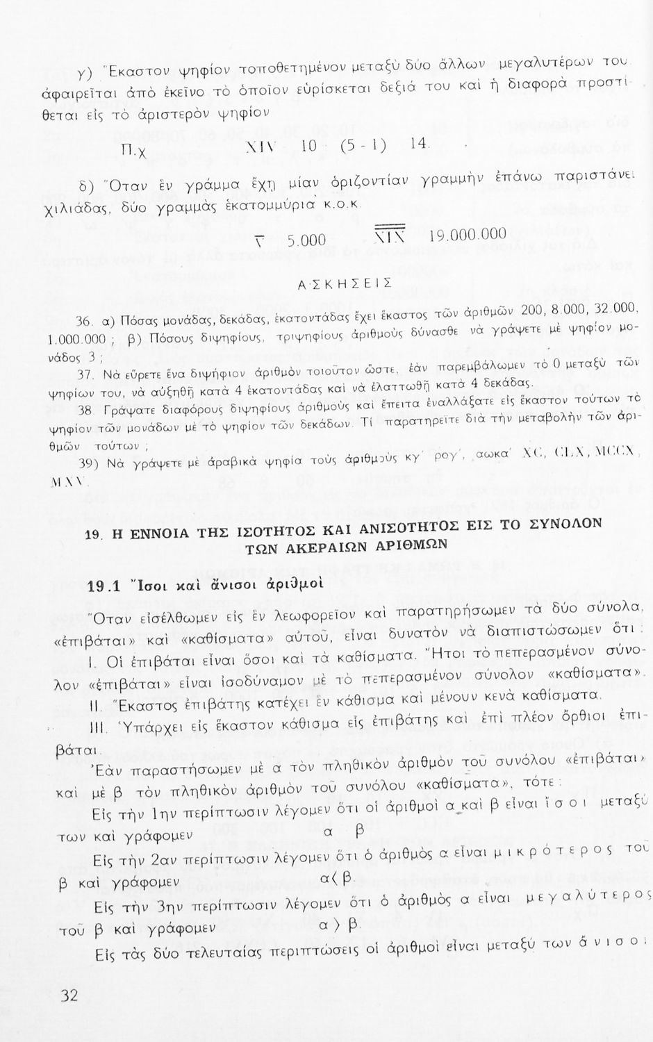 Σχολικό εγχειρίδιο Μαθηματικών Α' Γυμνασίου που περιέχει άλγεβρα με έμφαση στις αριθμητικές πράξεις με ακέραιους, δεκαδικούς και κλάσματα, και γεωμετρία με έμφαση στην επιπεδομετρία. Περιέχει και εισαγωγή στη θεωρία των συνόλων. Φέρει το σύμβολο της δικτατορίας.