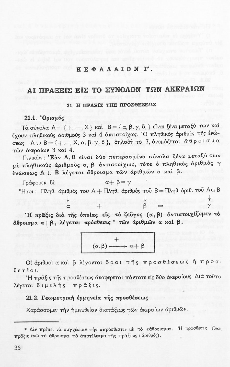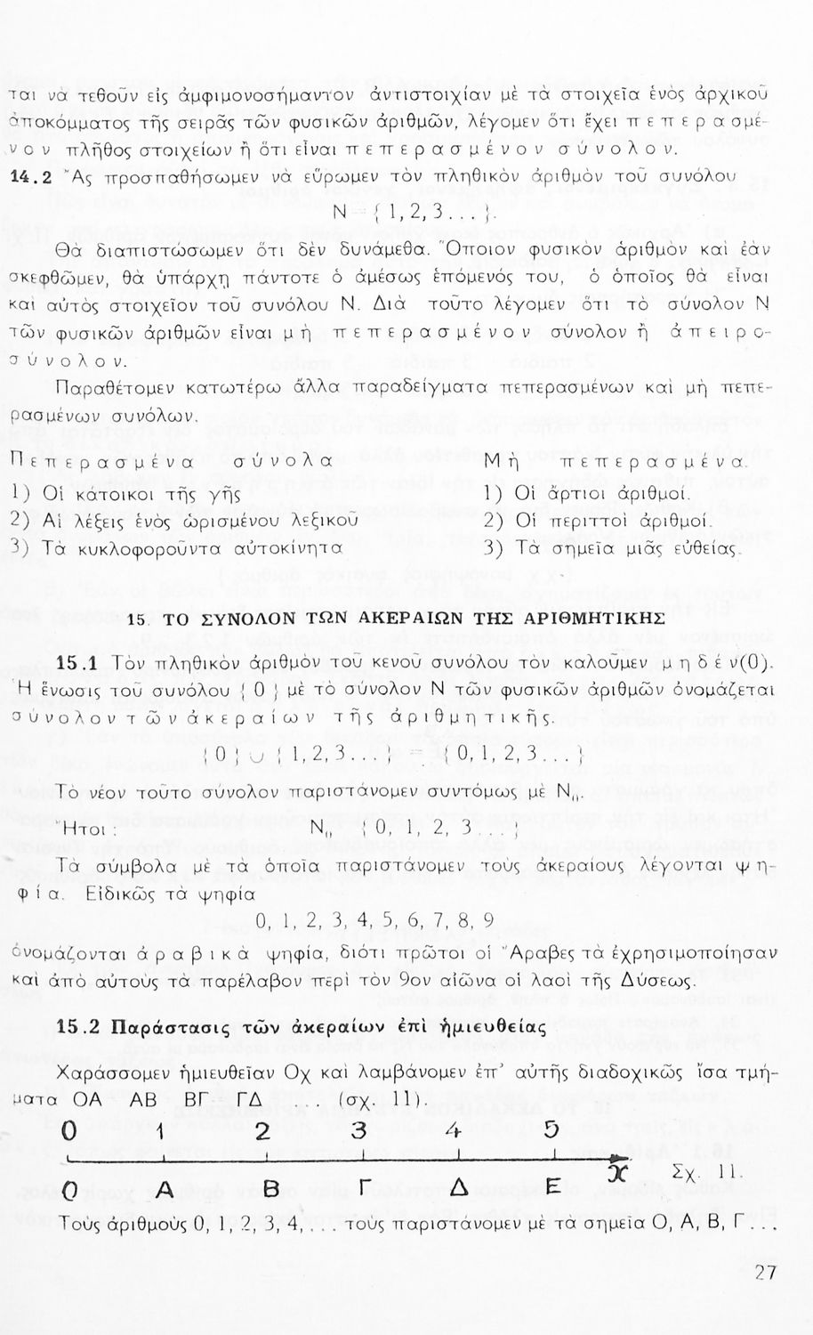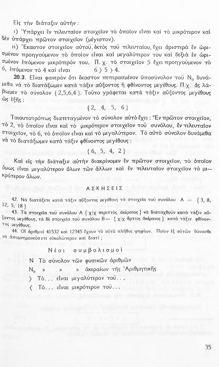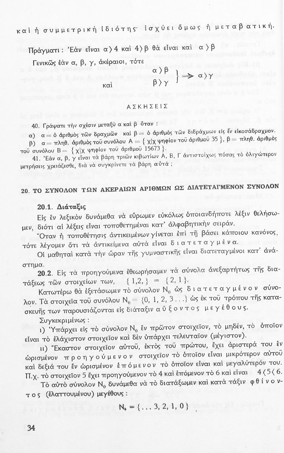 Σχολικό εγχειρίδιο Μαθηματικών Α' Γυμνασίου που περιέχει άλγεβρα με έμφαση στις αριθμητικές πράξεις με ακέραιους, δεκαδικούς και κλάσματα, και γεωμετρία με έμφαση στην επιπεδομετρία. Περιέχει και εισαγωγή στη θεωρία των συνόλων. Φέρει το σύμβολο της δικτατορίας.