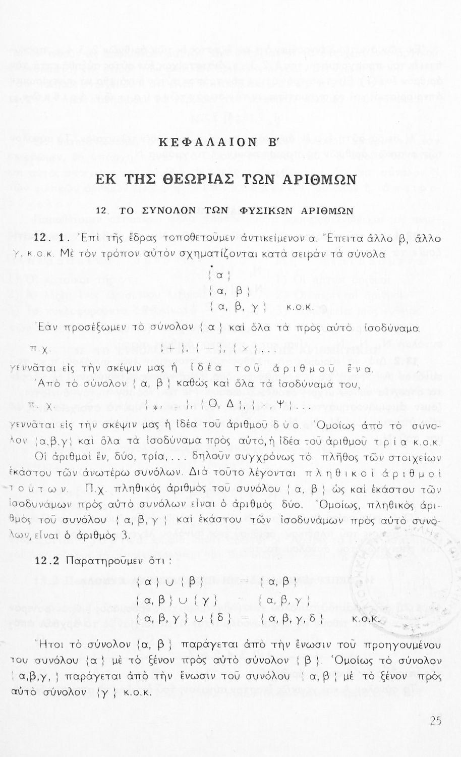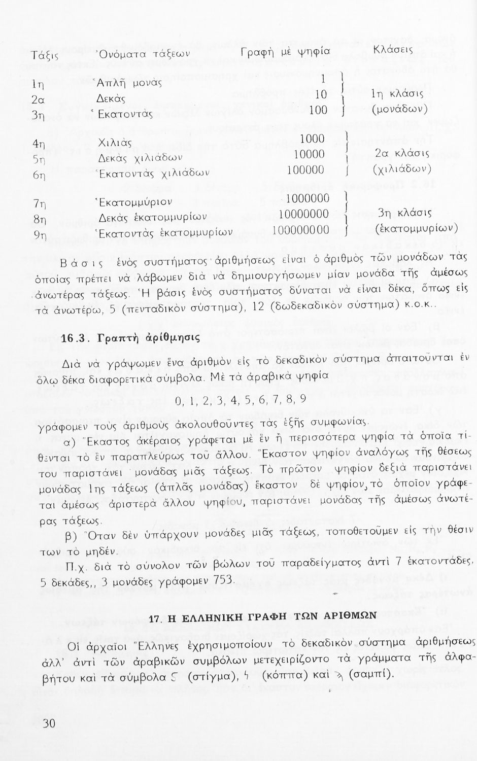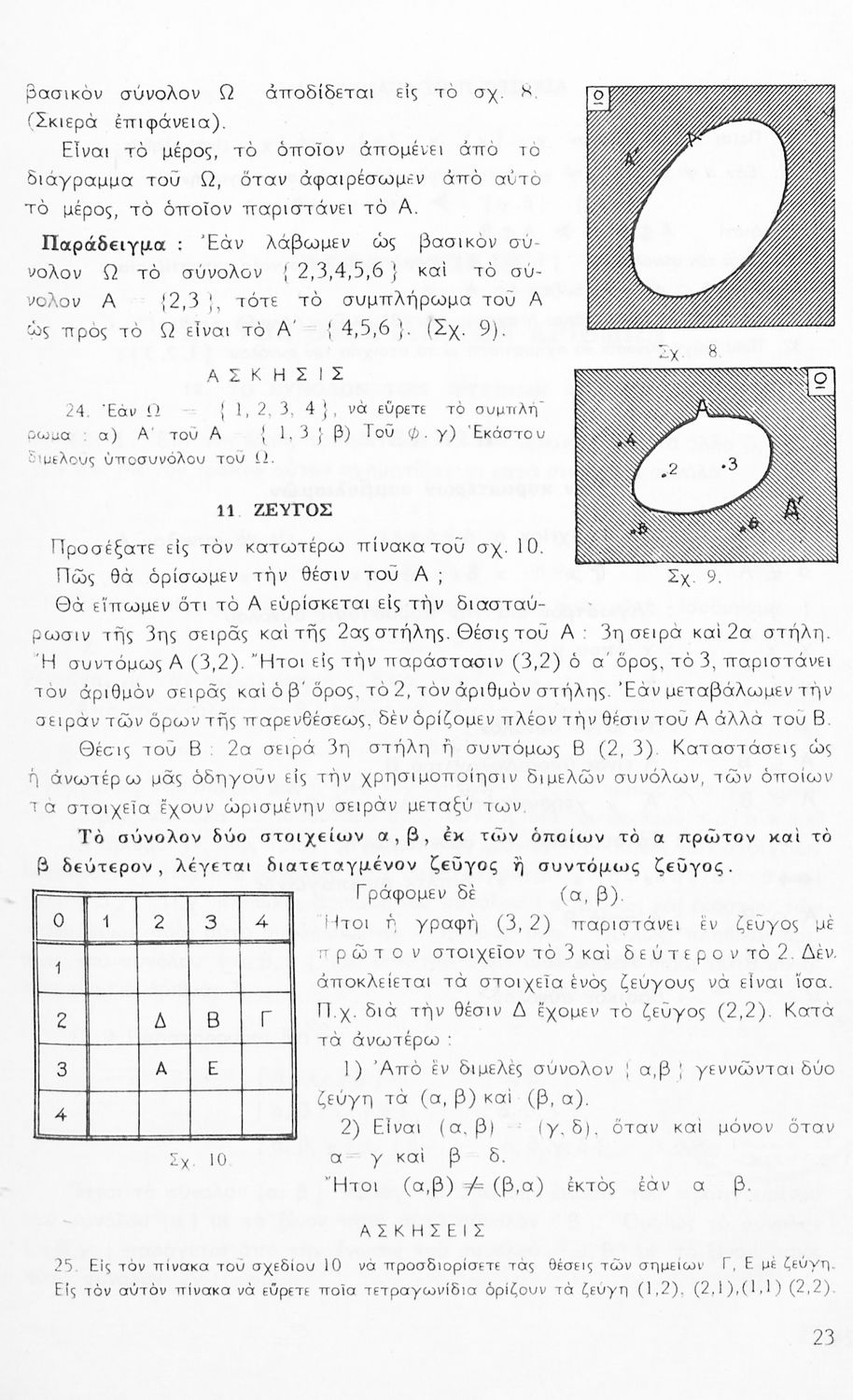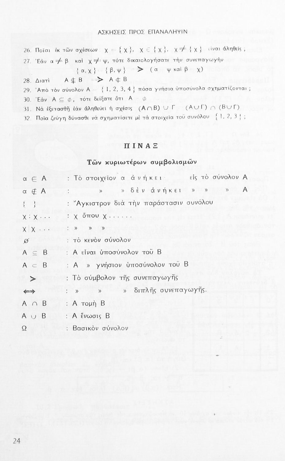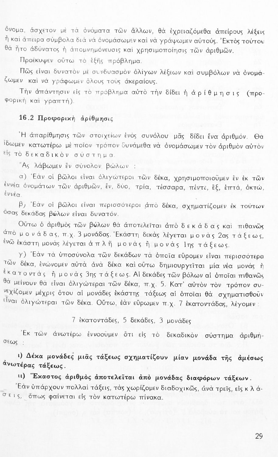 Σχολικό εγχειρίδιο Μαθηματικών Α' Γυμνασίου που περιέχει άλγεβρα με έμφαση στις αριθμητικές πράξεις με ακέραιους, δεκαδικούς και κλάσματα, και γεωμετρία με έμφαση στην επιπεδομετρία. Περιέχει και εισαγωγή στη θεωρία των συνόλων. Φέρει το σύμβολο της δικτατορίας.
