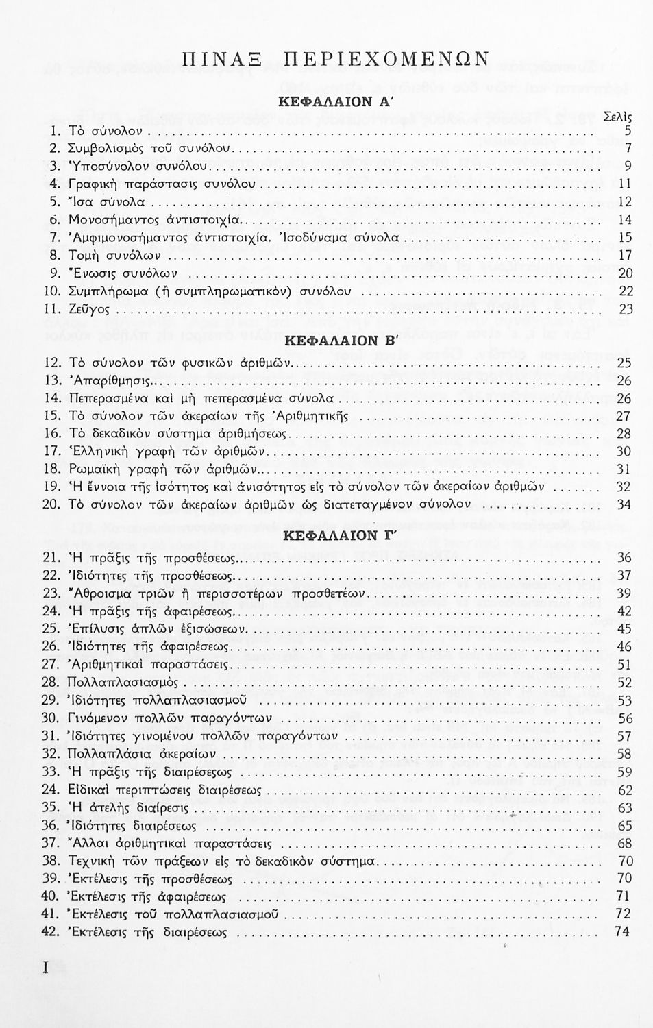 Σχολικό εγχειρίδιο Μαθηματικών Α' Γυμνασίου που περιέχει άλγεβρα με έμφαση στις αριθμητικές πράξεις με ακέραιους, δεκαδικούς και κλάσματα, και γεωμετρία με έμφαση στην επιπεδομετρία. Περιέχει και εισαγωγή στη θεωρία των συνόλων. Φέρει το σύμβολο της δικτατορίας.