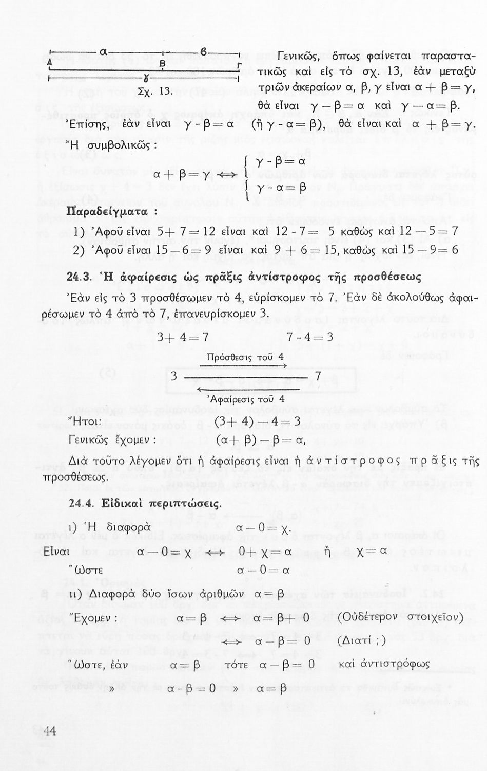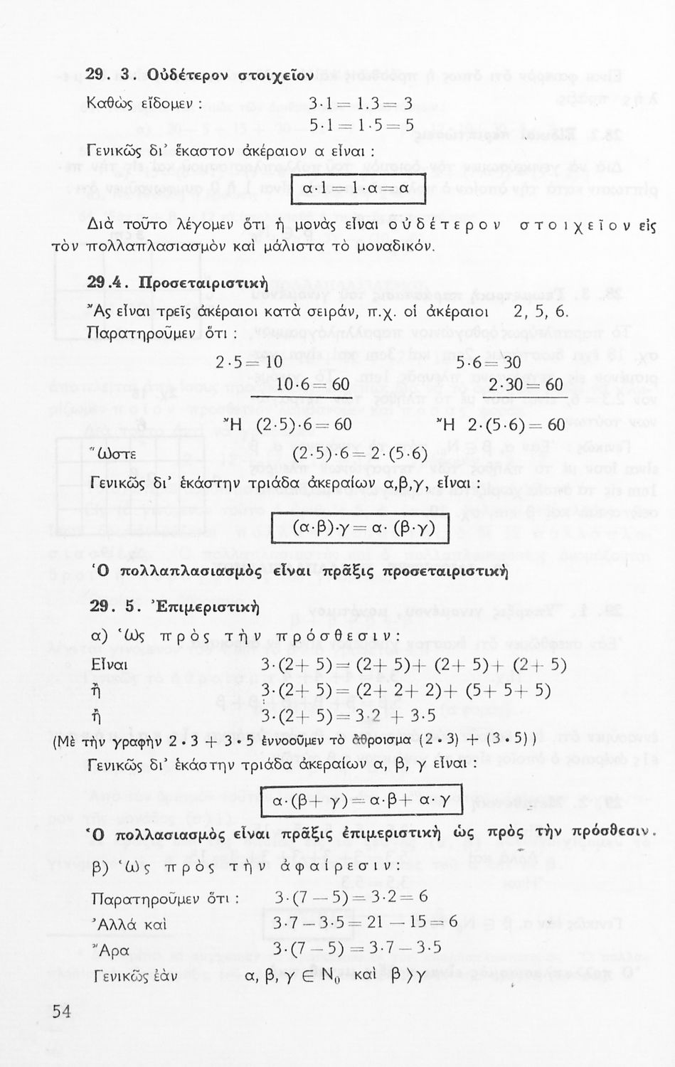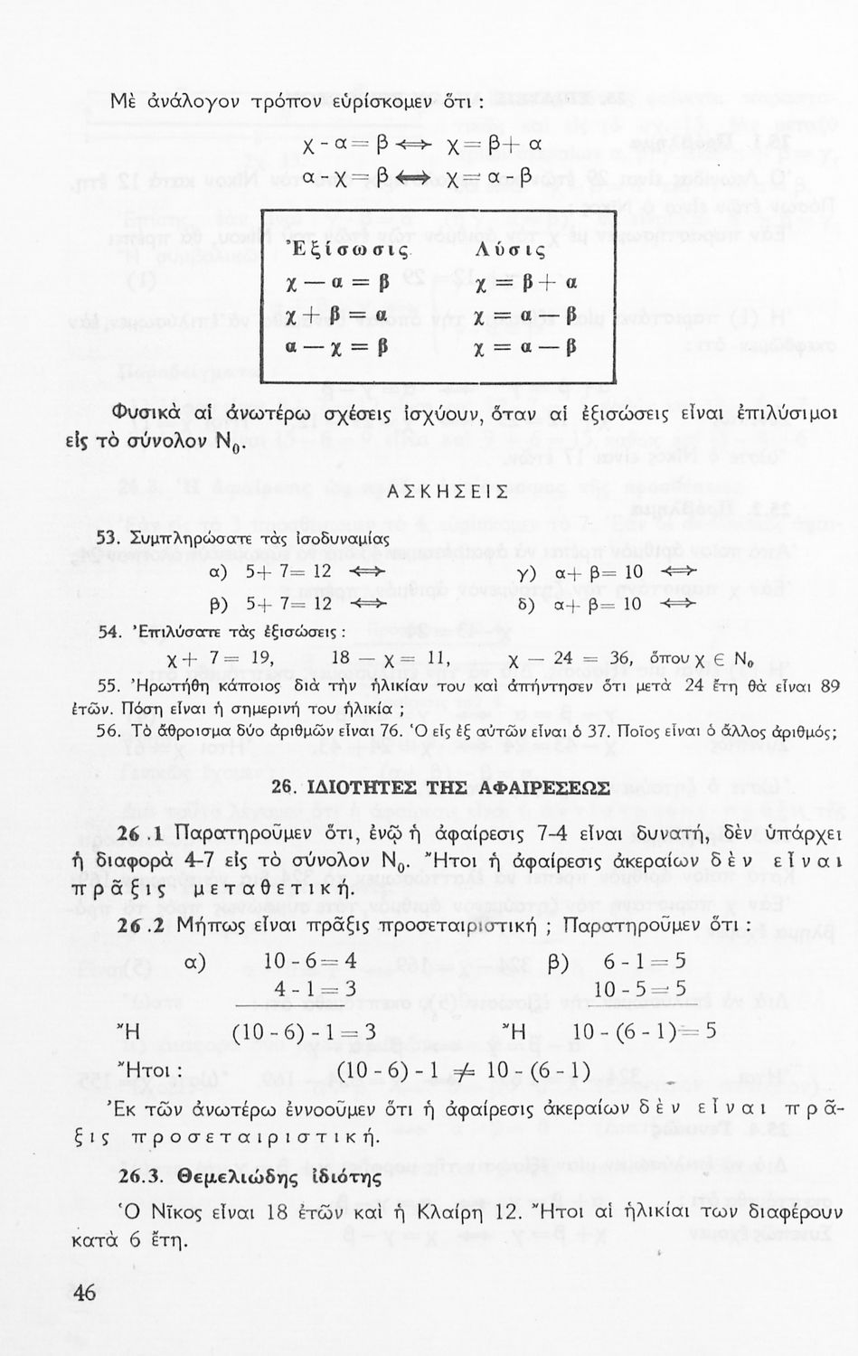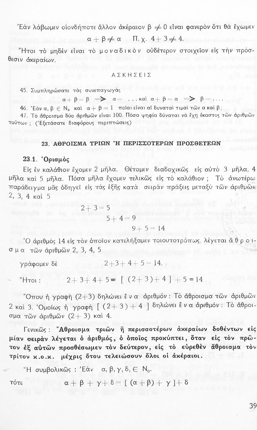 Σχολικό εγχειρίδιο Μαθηματικών Α' Γυμνασίου που περιέχει άλγεβρα με έμφαση στις αριθμητικές πράξεις με ακέραιους, δεκαδικούς και κλάσματα, και γεωμετρία με έμφαση στην επιπεδομετρία. Περιέχει και εισαγωγή στη θεωρία των συνόλων. Φέρει το σύμβολο της δικτατορίας.