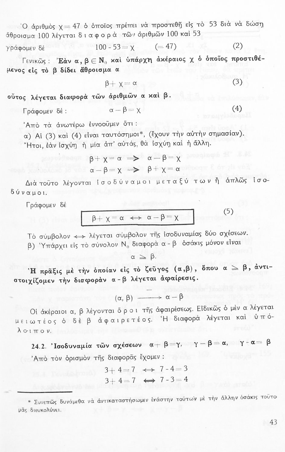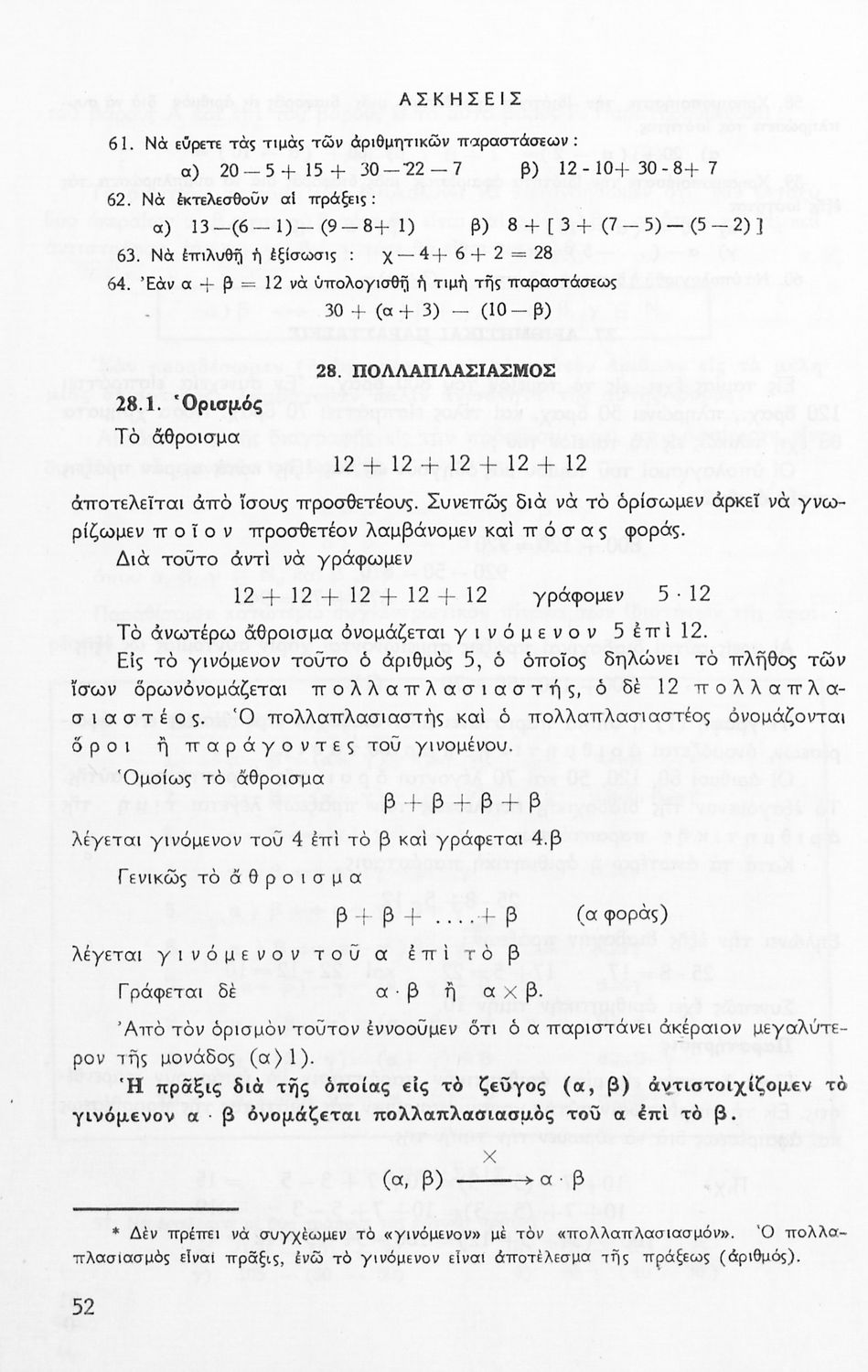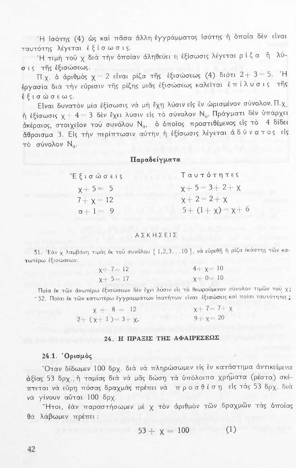 Σχολικό εγχειρίδιο Μαθηματικών Α' Γυμνασίου που περιέχει άλγεβρα με έμφαση στις αριθμητικές πράξεις με ακέραιους, δεκαδικούς και κλάσματα, και γεωμετρία με έμφαση στην επιπεδομετρία. Περιέχει και εισαγωγή στη θεωρία των συνόλων. Φέρει το σύμβολο της δικτατορίας.