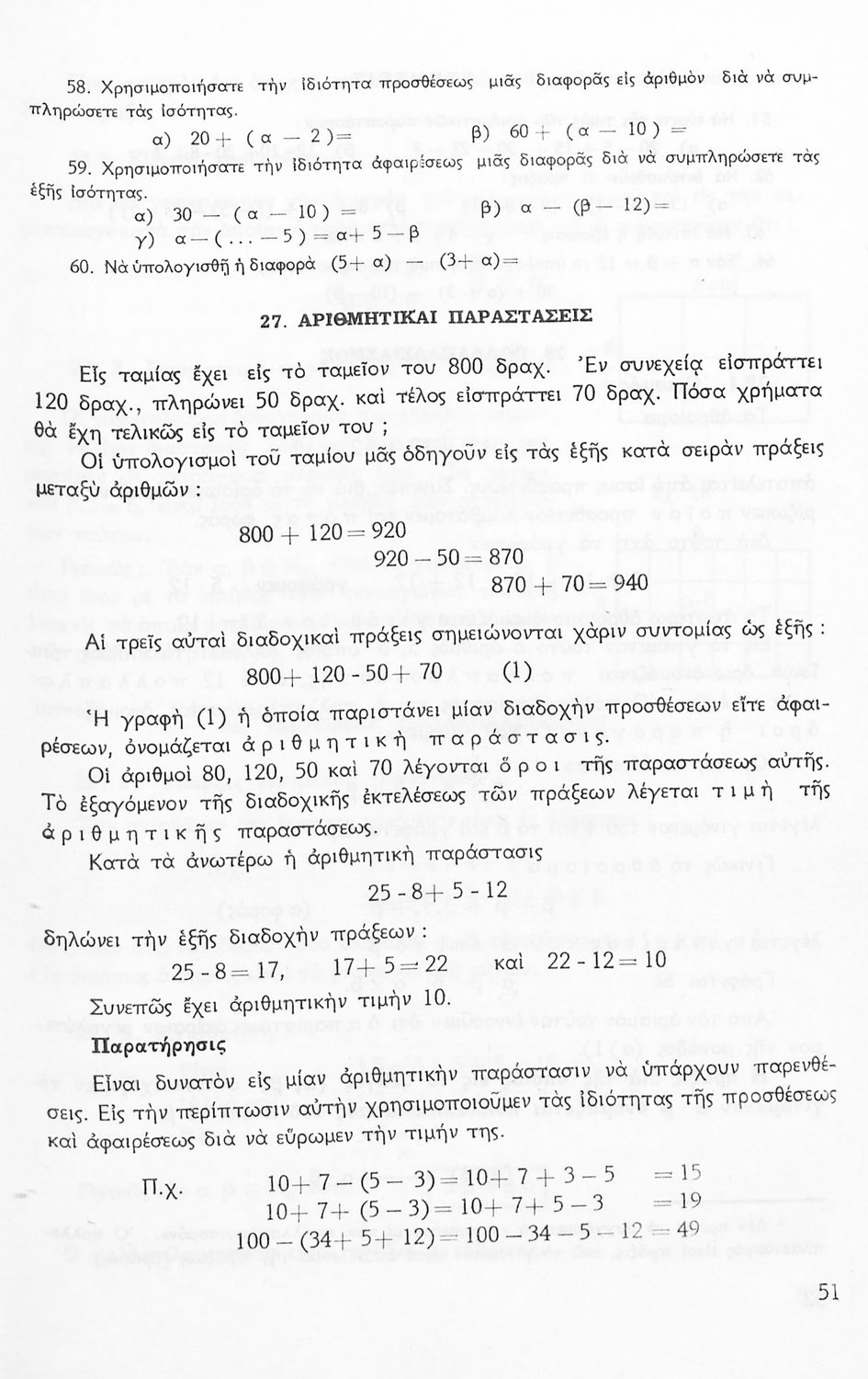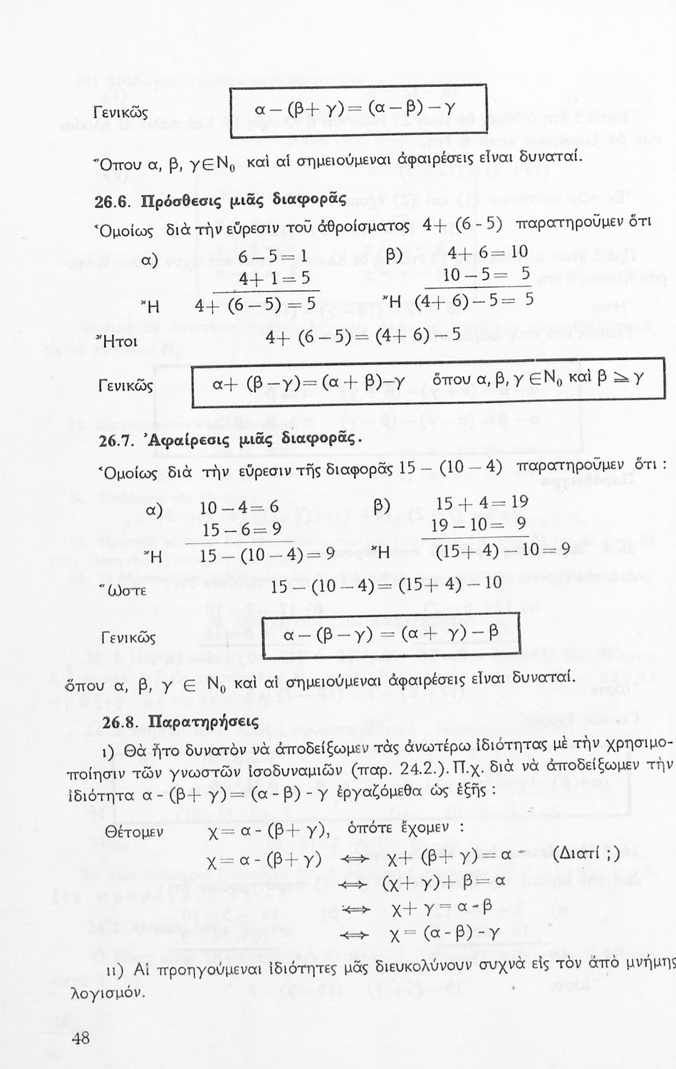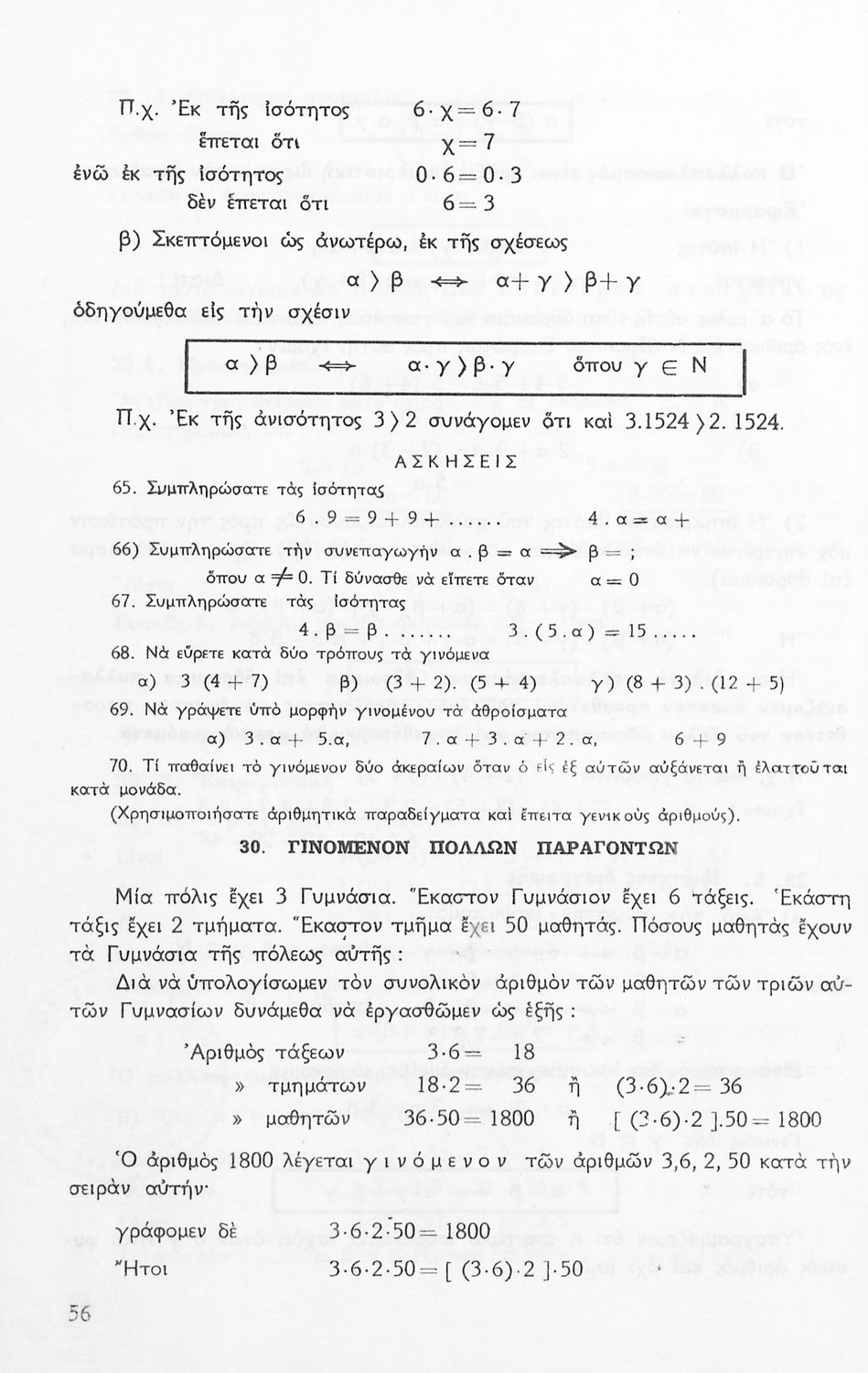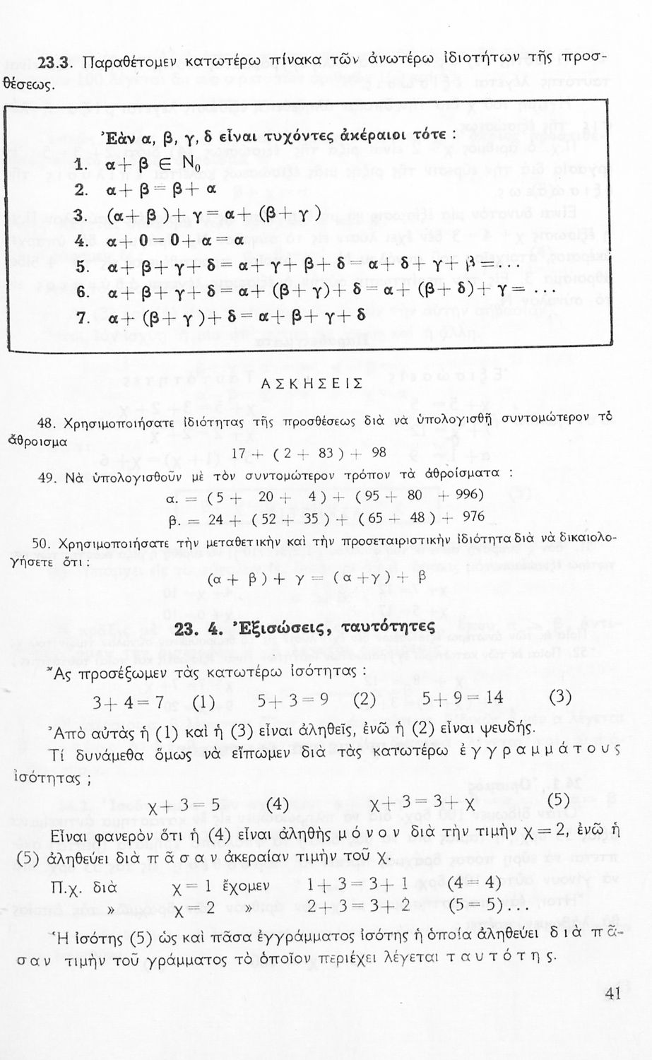 Σχολικό εγχειρίδιο Μαθηματικών Α' Γυμνασίου που περιέχει άλγεβρα με έμφαση στις αριθμητικές πράξεις με ακέραιους, δεκαδικούς και κλάσματα, και γεωμετρία με έμφαση στην επιπεδομετρία. Περιέχει και εισαγωγή στη θεωρία των συνόλων. Φέρει το σύμβολο της δικτατορίας.