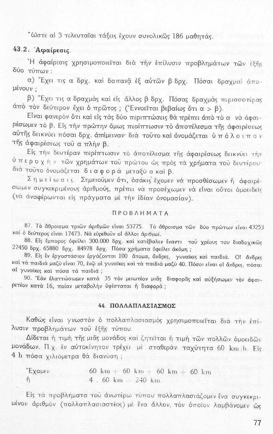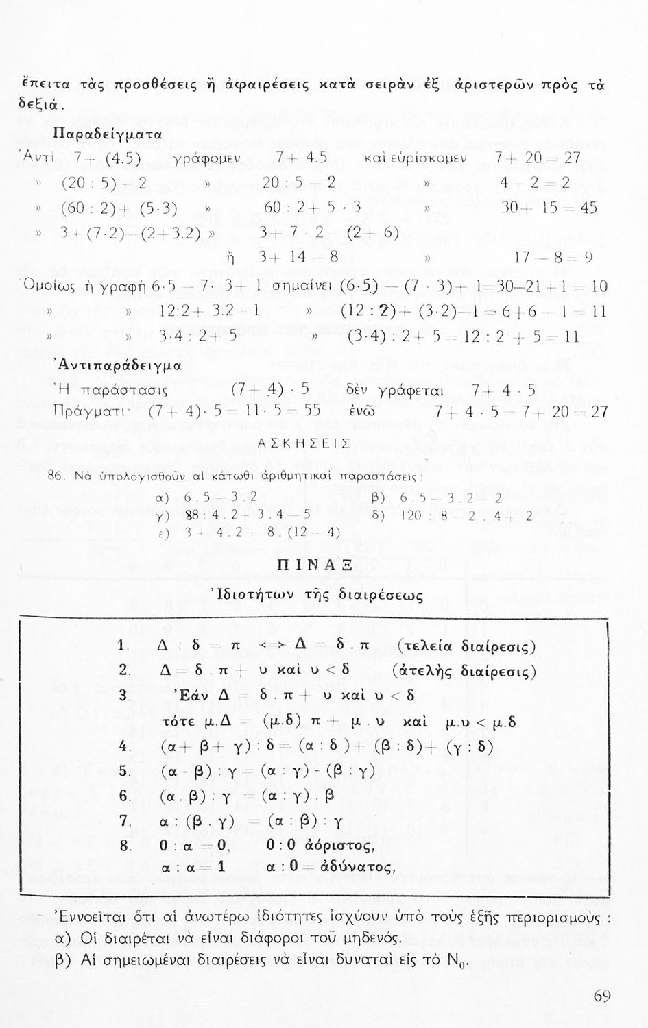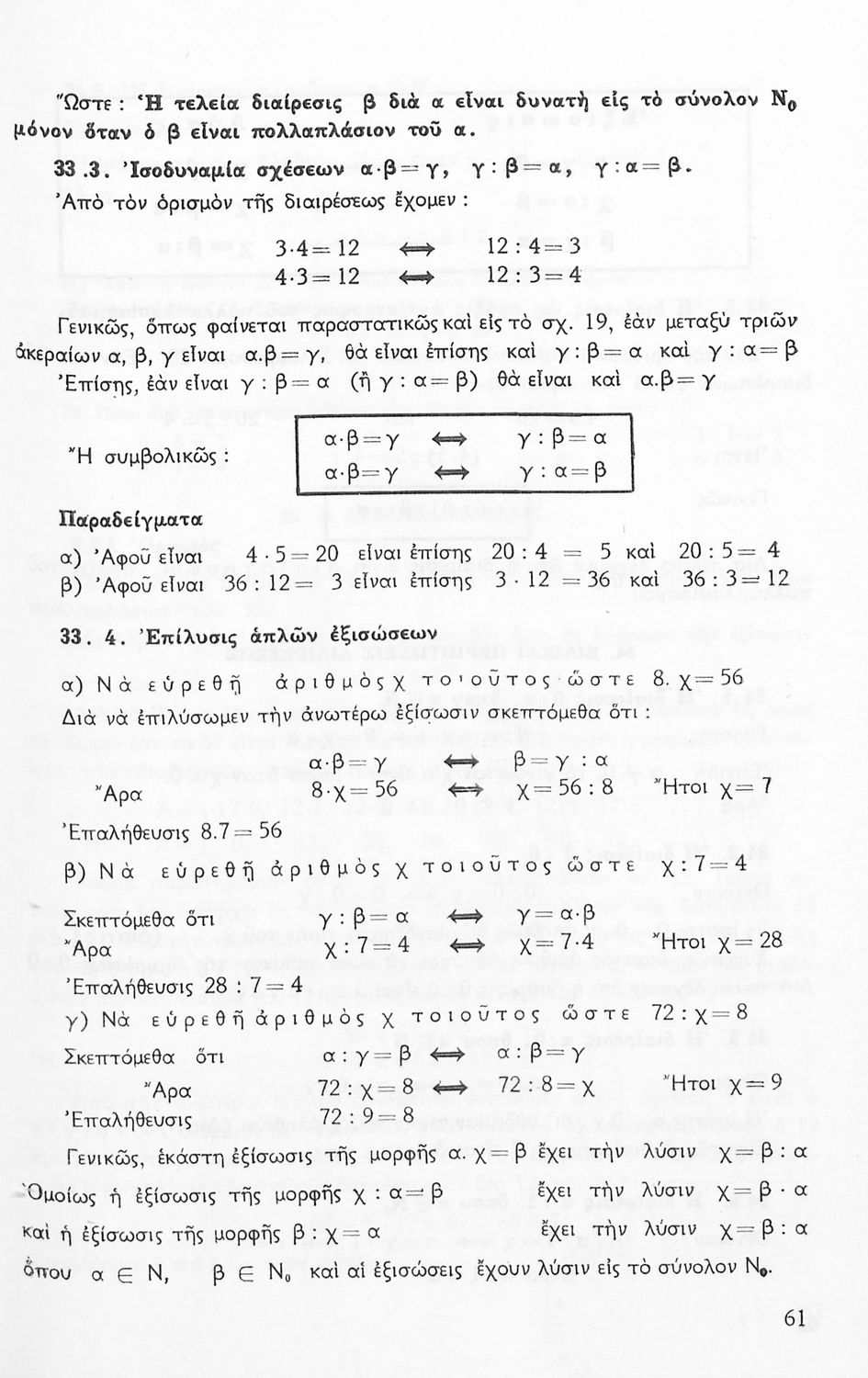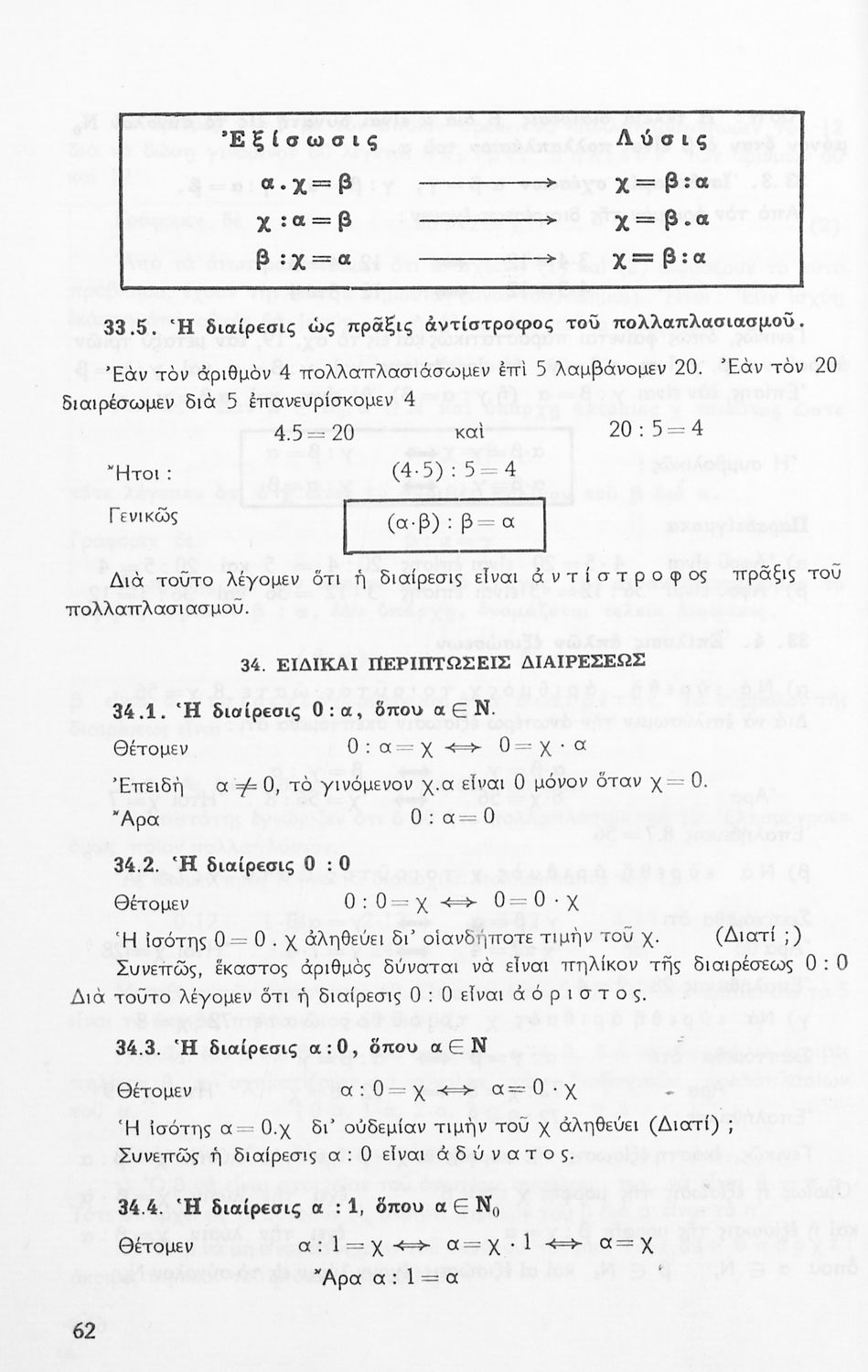 Σχολικό εγχειρίδιο Μαθηματικών Α' Γυμνασίου που περιέχει άλγεβρα με έμφαση στις αριθμητικές πράξεις με ακέραιους, δεκαδικούς και κλάσματα, και γεωμετρία με έμφαση στην επιπεδομετρία. Περιέχει και εισαγωγή στη θεωρία των συνόλων. Φέρει το σύμβολο της δικτατορίας.
