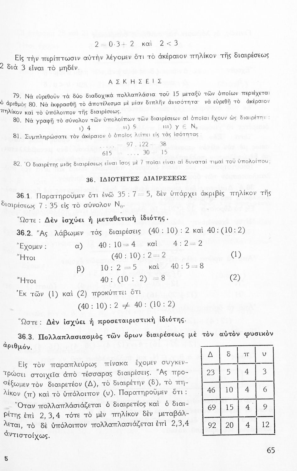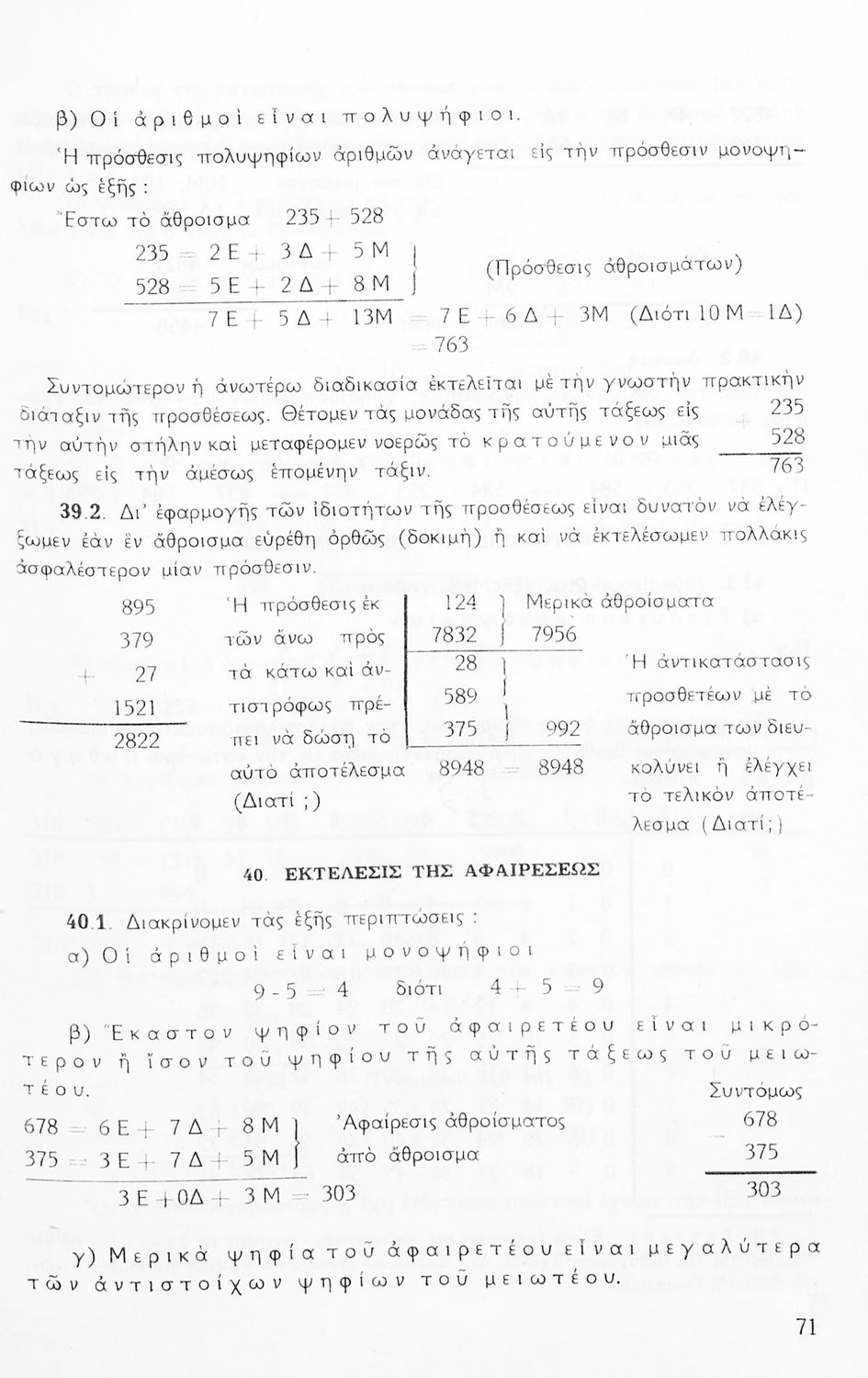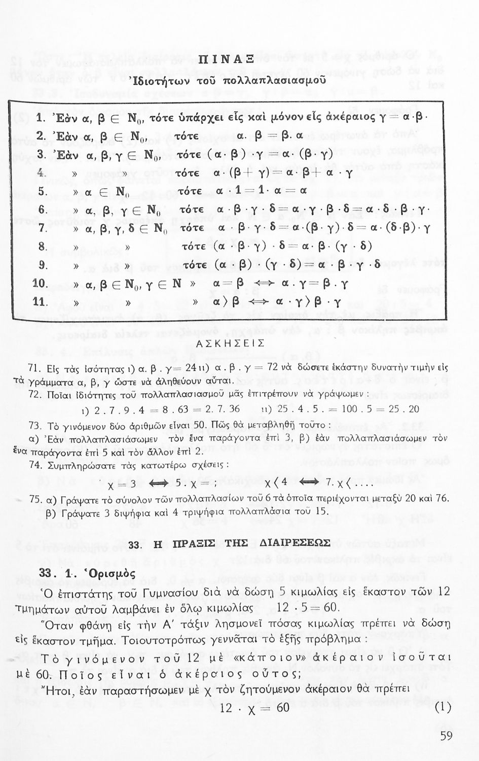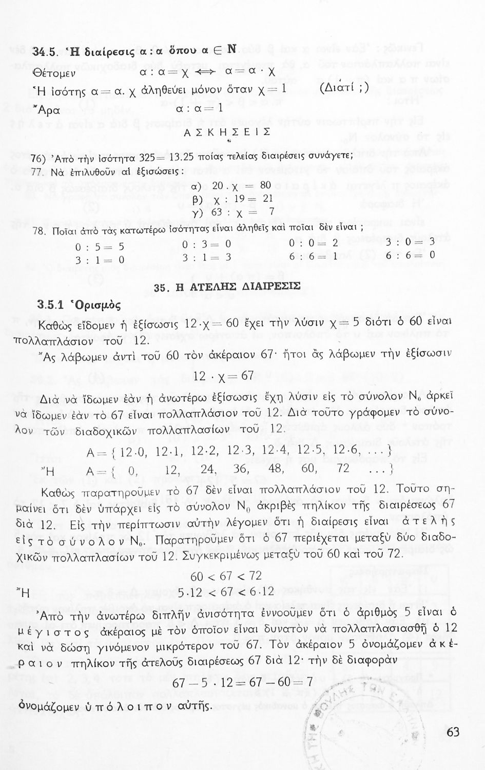 Σχολικό εγχειρίδιο Μαθηματικών Α' Γυμνασίου που περιέχει άλγεβρα με έμφαση στις αριθμητικές πράξεις με ακέραιους, δεκαδικούς και κλάσματα, και γεωμετρία με έμφαση στην επιπεδομετρία. Περιέχει και εισαγωγή στη θεωρία των συνόλων. Φέρει το σύμβολο της δικτατορίας.