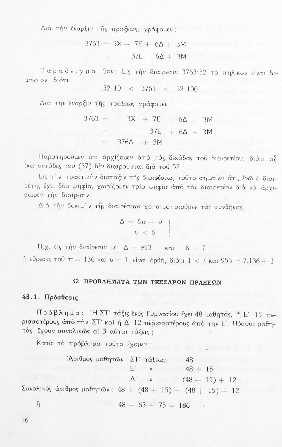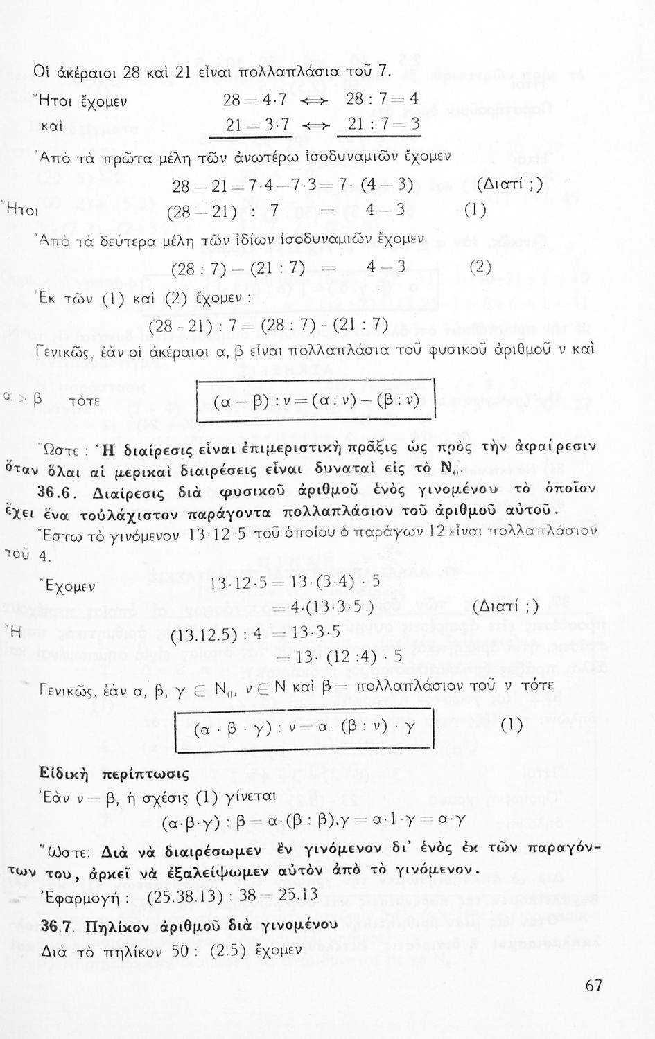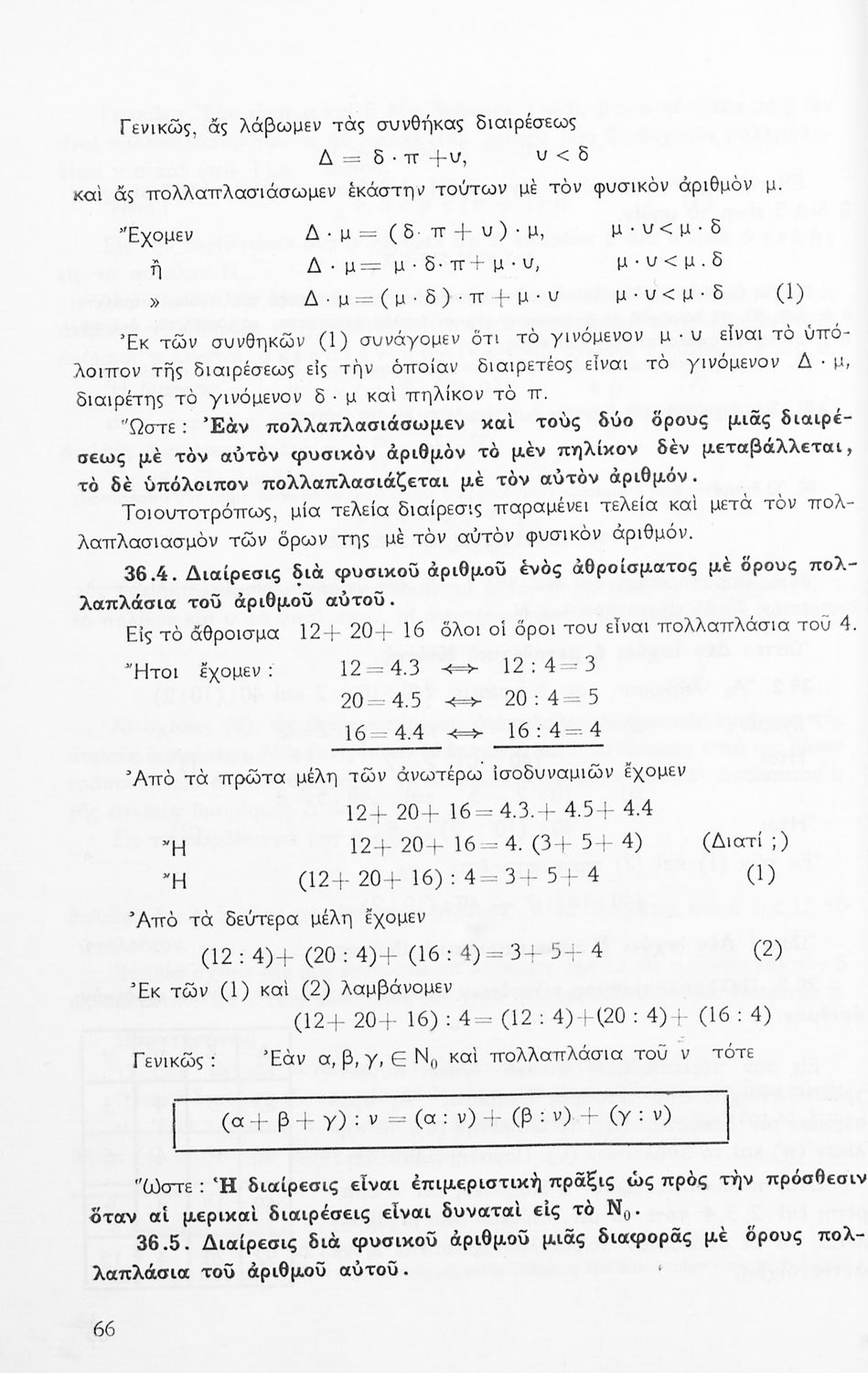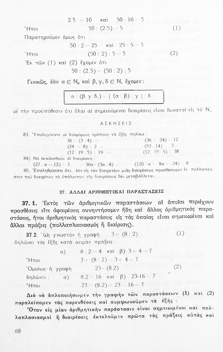 Σχολικό εγχειρίδιο Μαθηματικών Α' Γυμνασίου που περιέχει άλγεβρα με έμφαση στις αριθμητικές πράξεις με ακέραιους, δεκαδικούς και κλάσματα, και γεωμετρία με έμφαση στην επιπεδομετρία. Περιέχει και εισαγωγή στη θεωρία των συνόλων. Φέρει το σύμβολο της δικτατορίας.