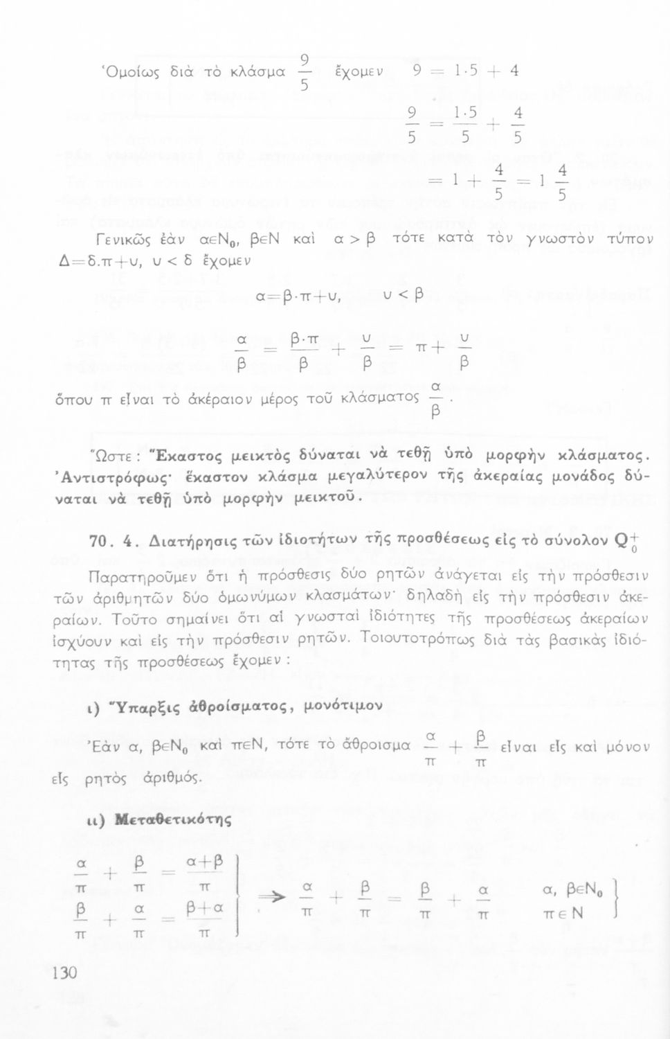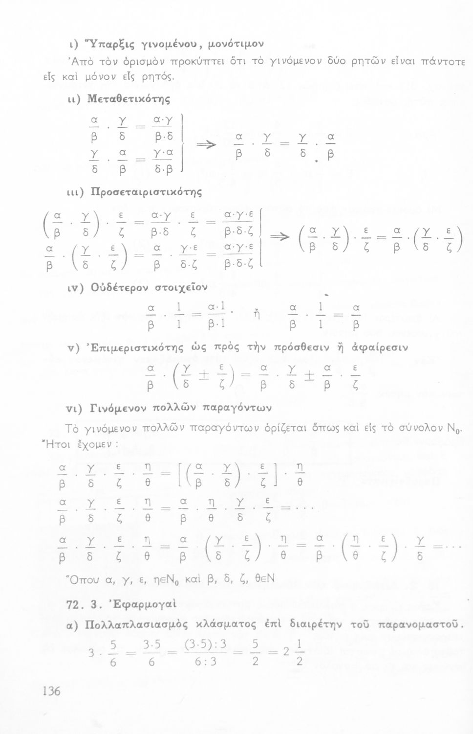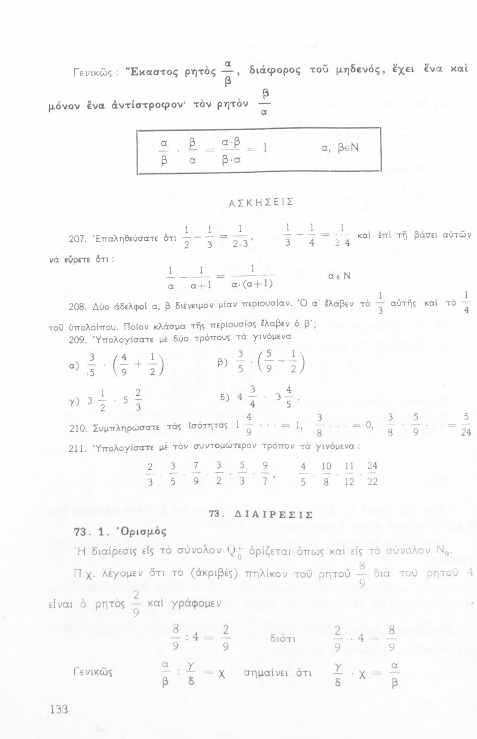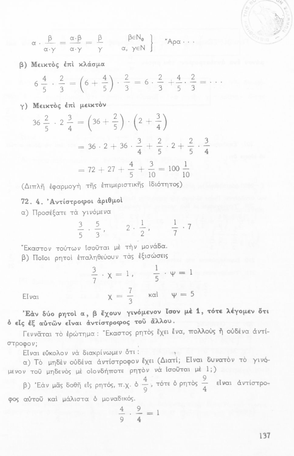 Σχολικό εγχειρίδιο Μαθηματικών Α' Γυμνασίου που περιέχει άλγεβρα με έμφαση στις αριθμητικές πράξεις με ακέραιους, δεκαδικούς και κλάσματα, και γεωμετρία με έμφαση στην επιπεδομετρία. Περιέχει και εισαγωγή στη θεωρία των συνόλων. Φέρει το σύμβολο της δικτατορίας.