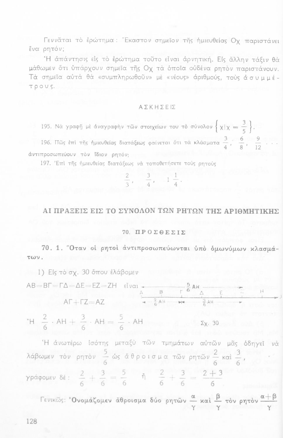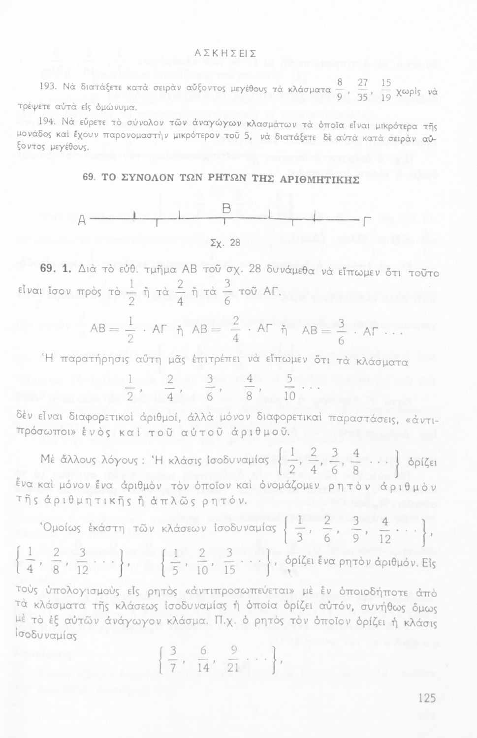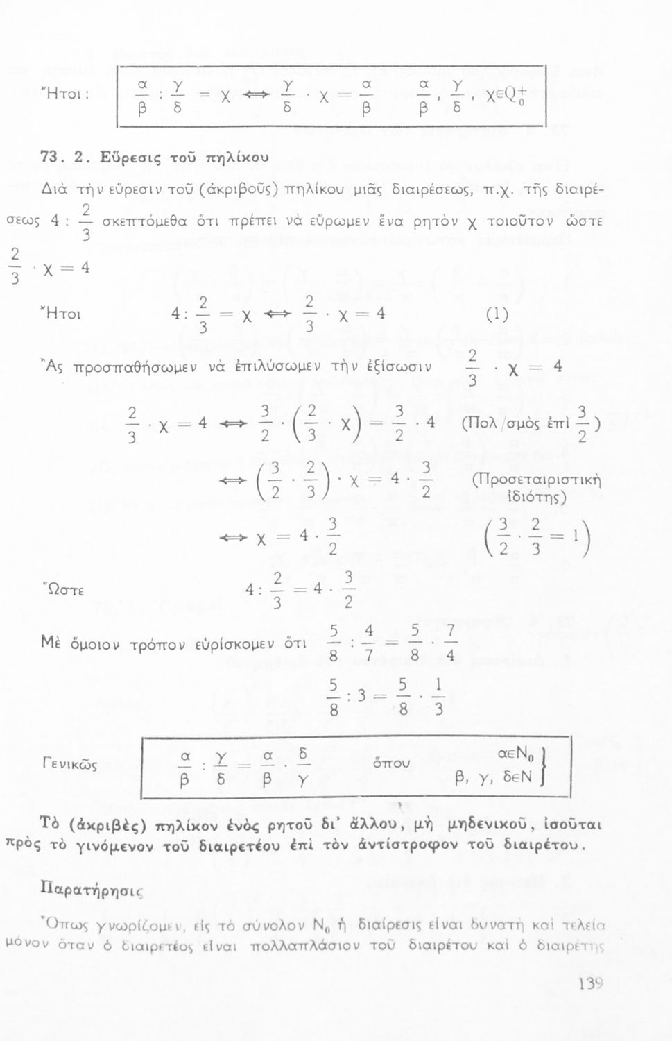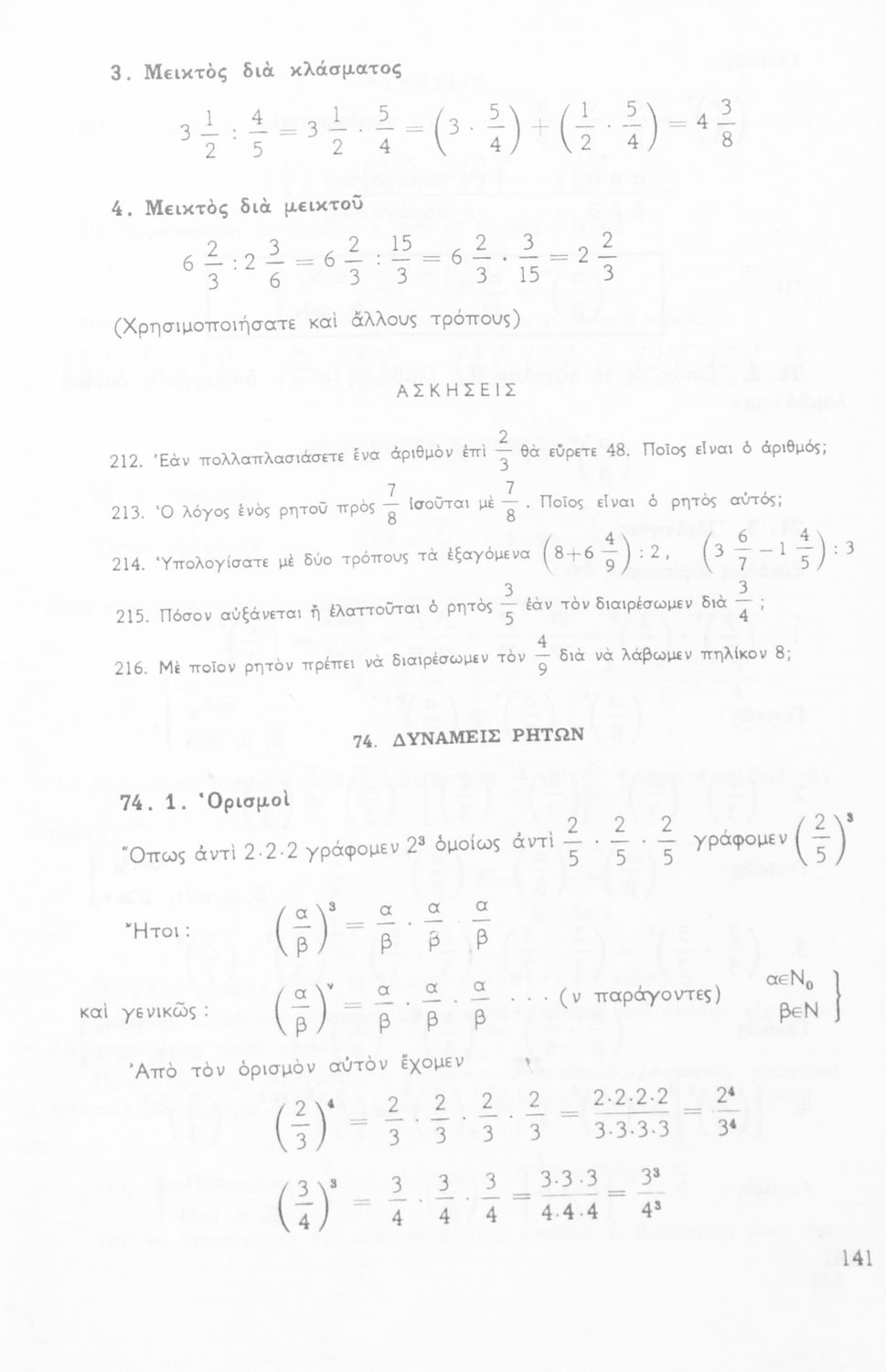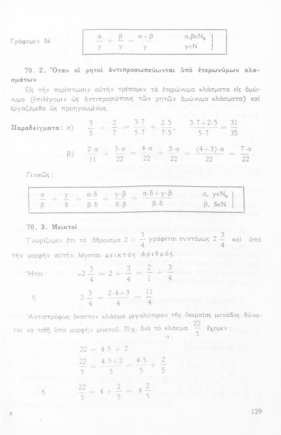 Σχολικό εγχειρίδιο Μαθηματικών Α' Γυμνασίου που περιέχει άλγεβρα με έμφαση στις αριθμητικές πράξεις με ακέραιους, δεκαδικούς και κλάσματα, και γεωμετρία με έμφαση στην επιπεδομετρία. Περιέχει και εισαγωγή στη θεωρία των συνόλων. Φέρει το σύμβολο της δικτατορίας.