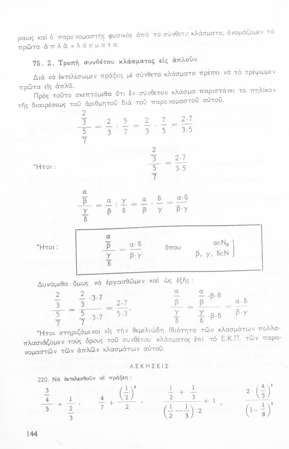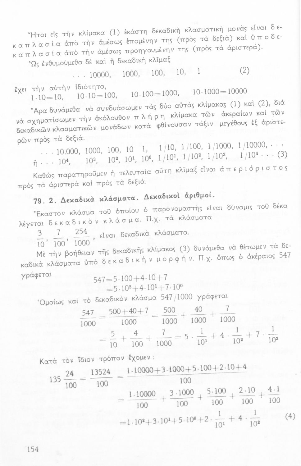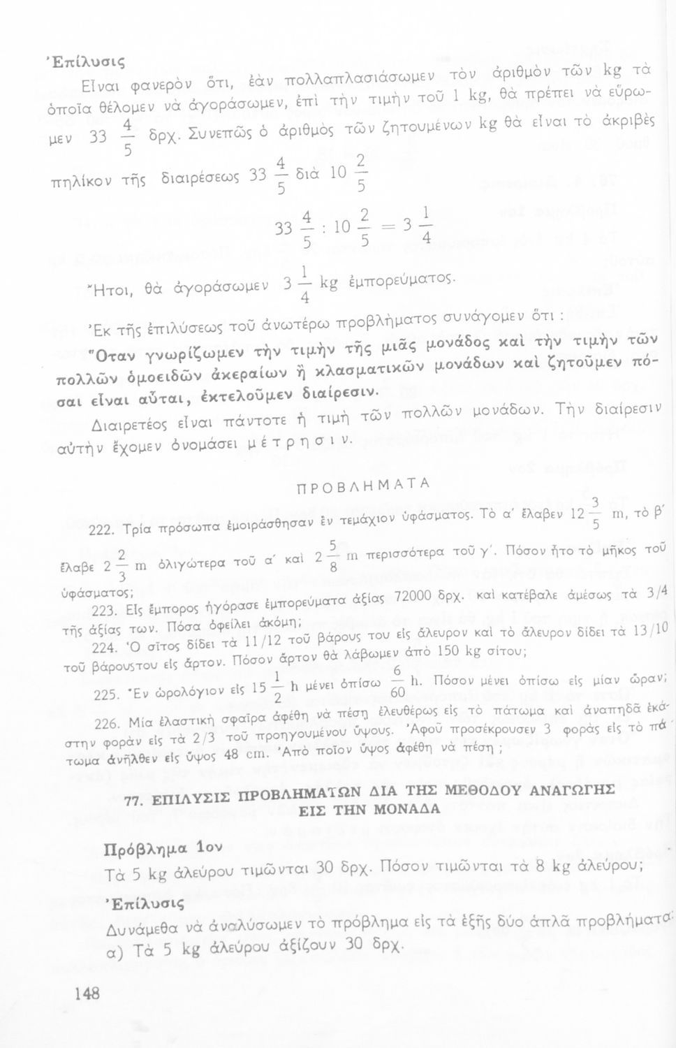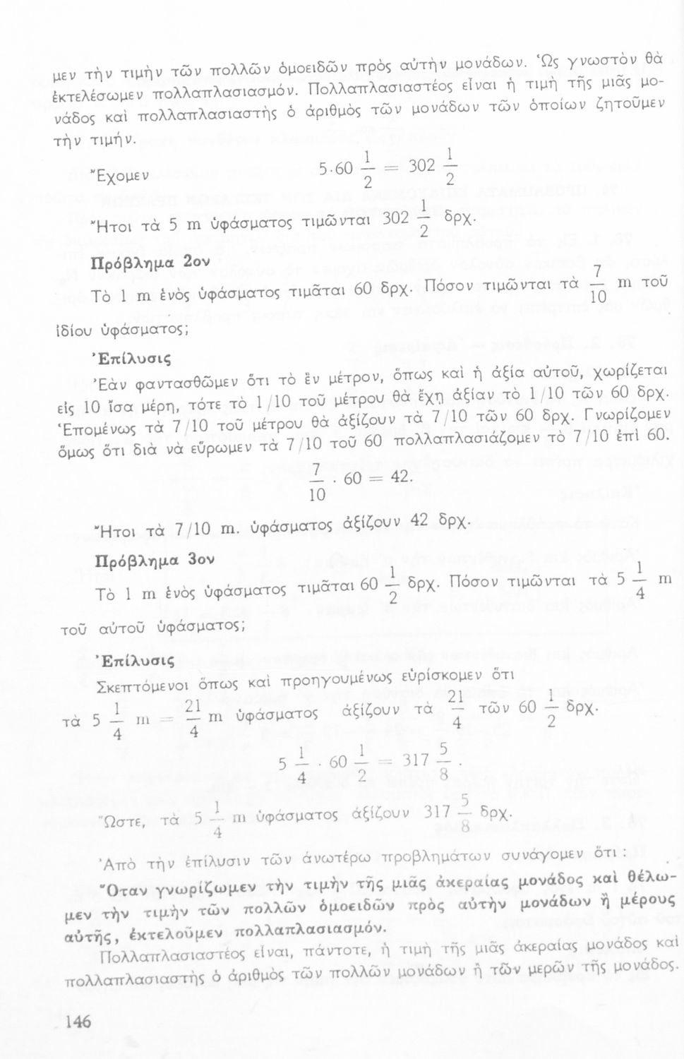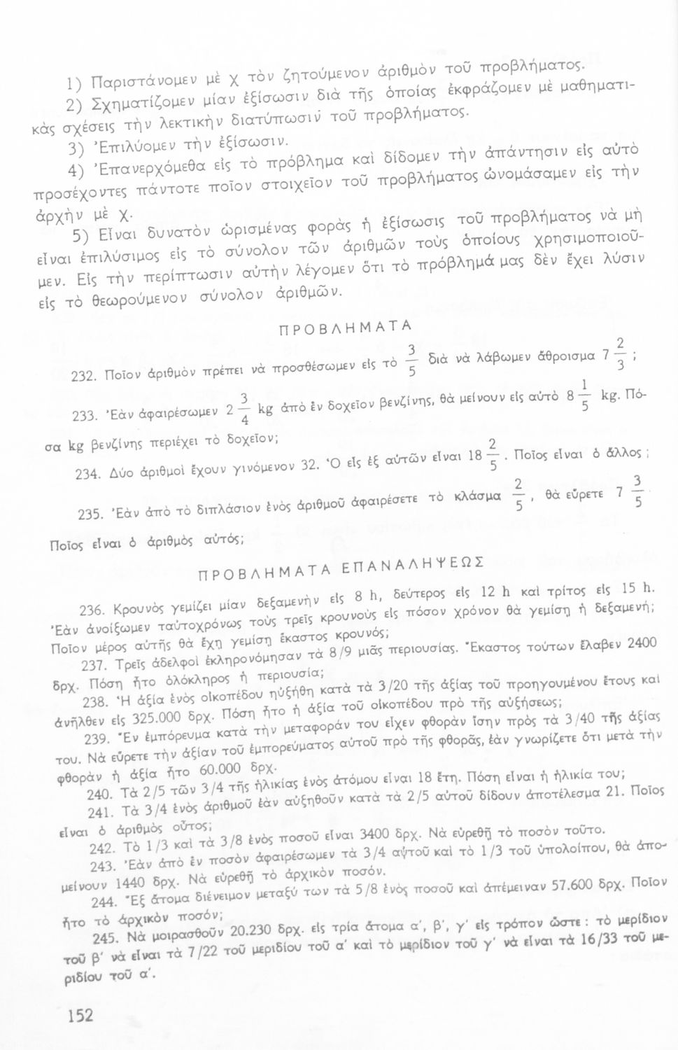 Σχολικό εγχειρίδιο Μαθηματικών Α' Γυμνασίου που περιέχει άλγεβρα με έμφαση στις αριθμητικές πράξεις με ακέραιους, δεκαδικούς και κλάσματα, και γεωμετρία με έμφαση στην επιπεδομετρία. Περιέχει και εισαγωγή στη θεωρία των συνόλων. Φέρει το σύμβολο της δικτατορίας.