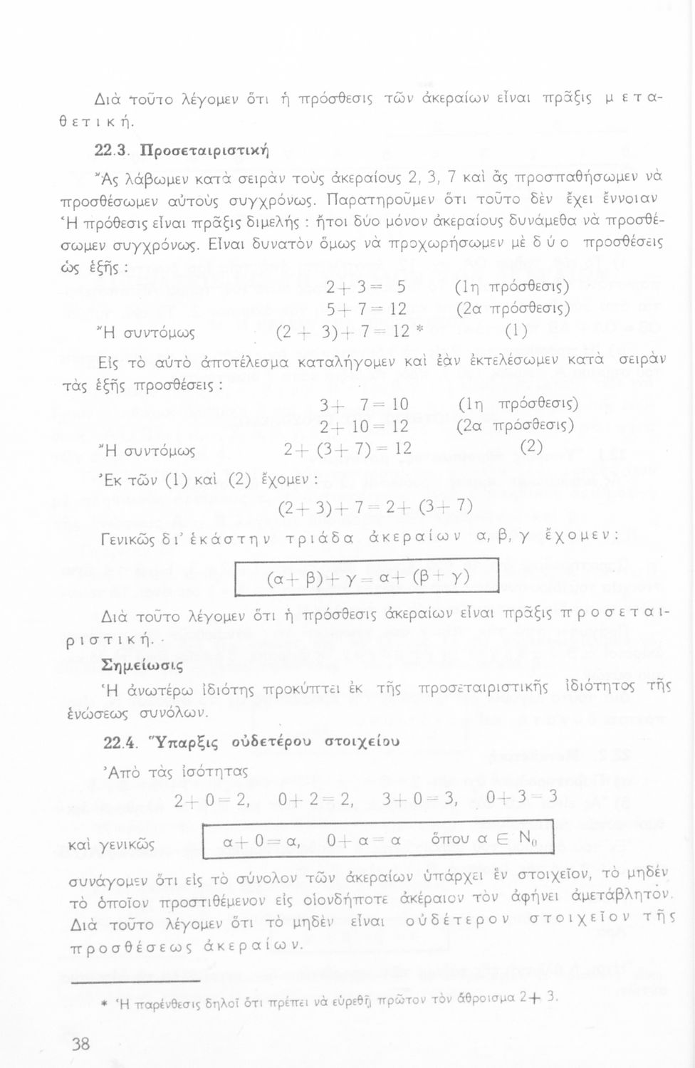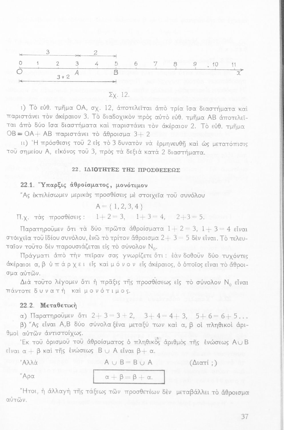 Σχολικό εγχειρίδιο Μαθηματικών Α' Γυμνασίου που περιέχει άλγεβρα με έμφαση στις αριθμητικές πράξεις με ακέραιους, δεκαδικούς και κλάσματα, και γεωμετρία με έμφαση στην επιπεδομετρία. Περιέχει και εισαγωγή στη θεωρία των συνόλων. Φέρει το σύμβολο της δικτατορίας.