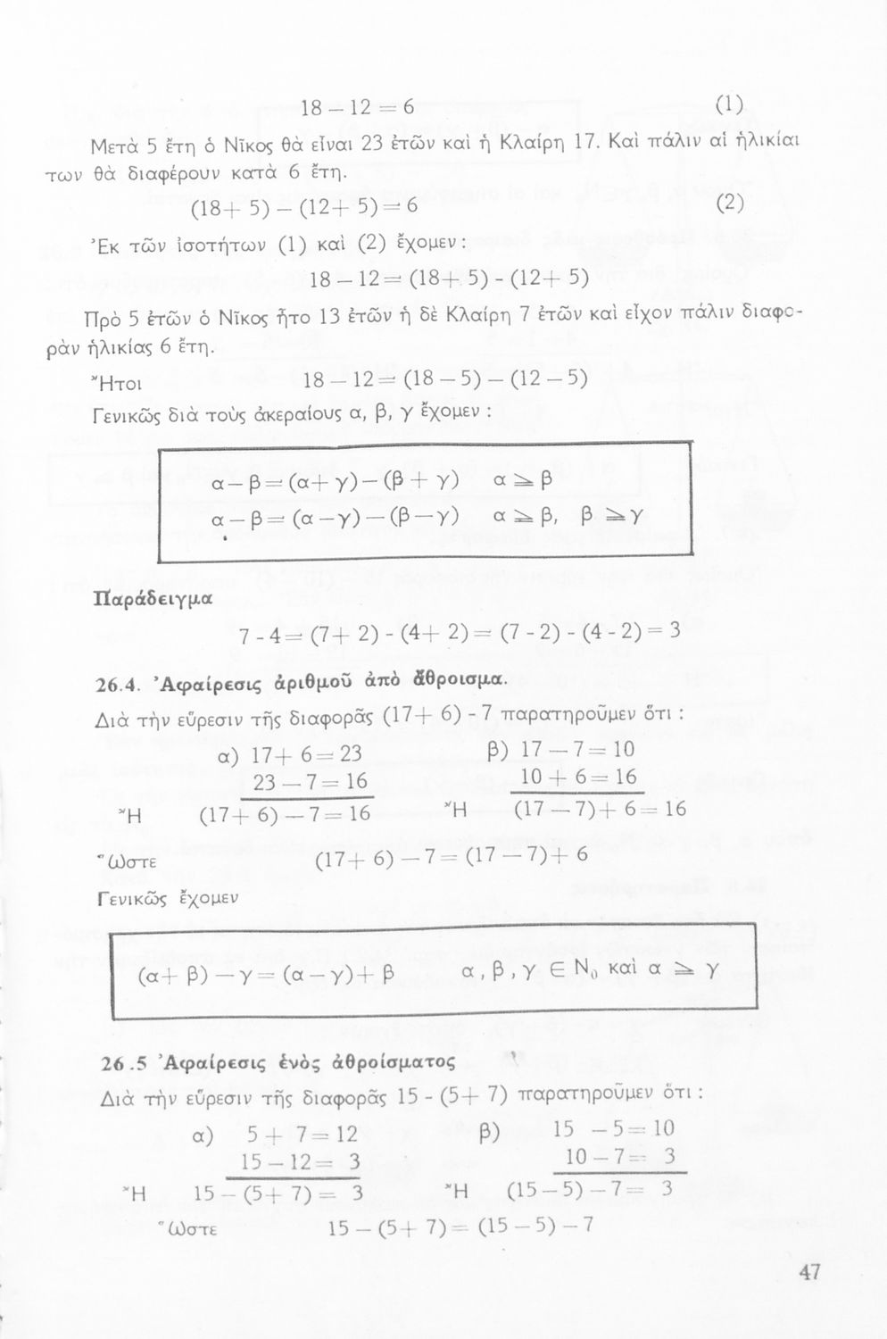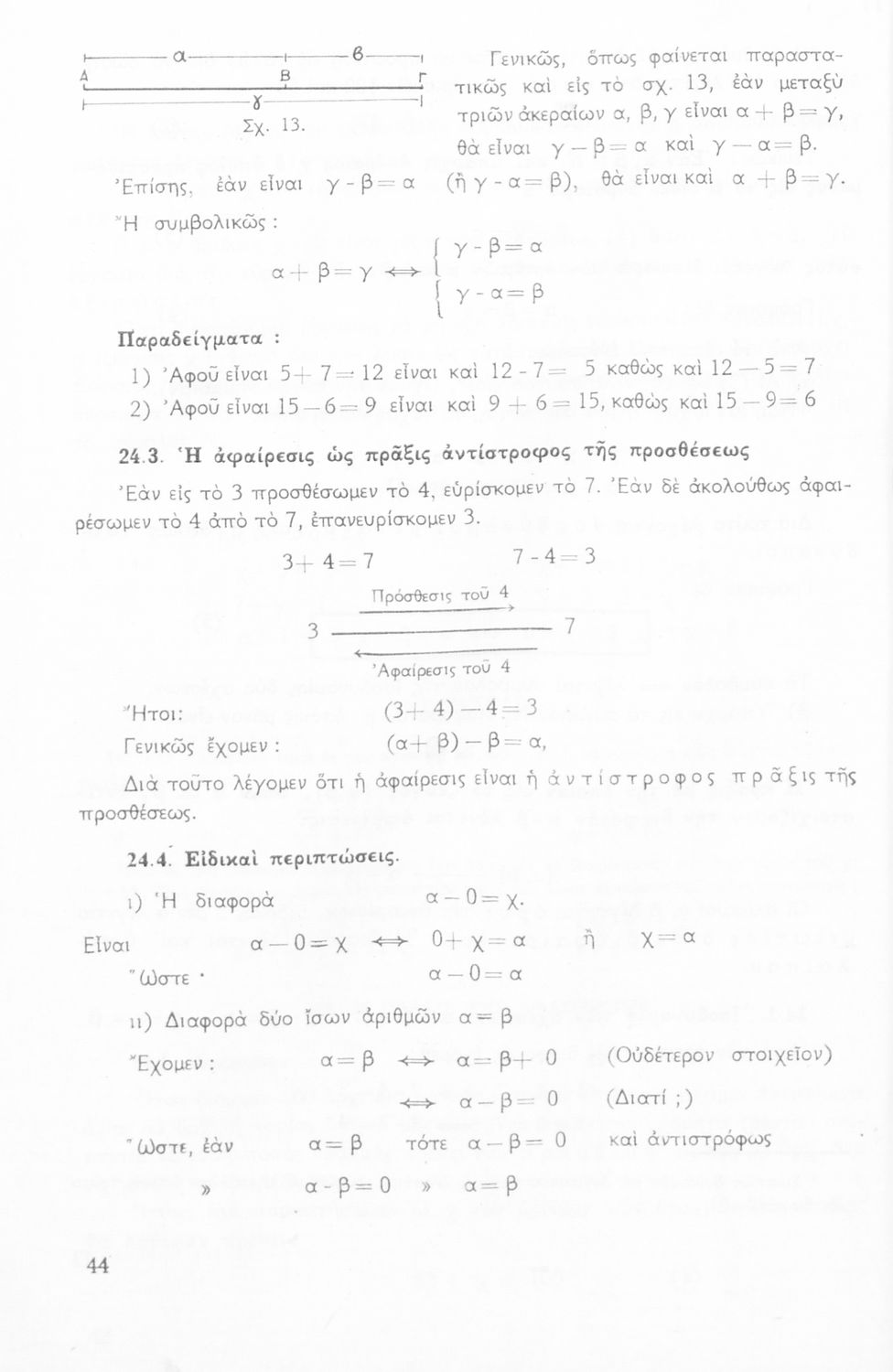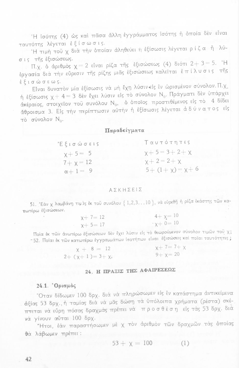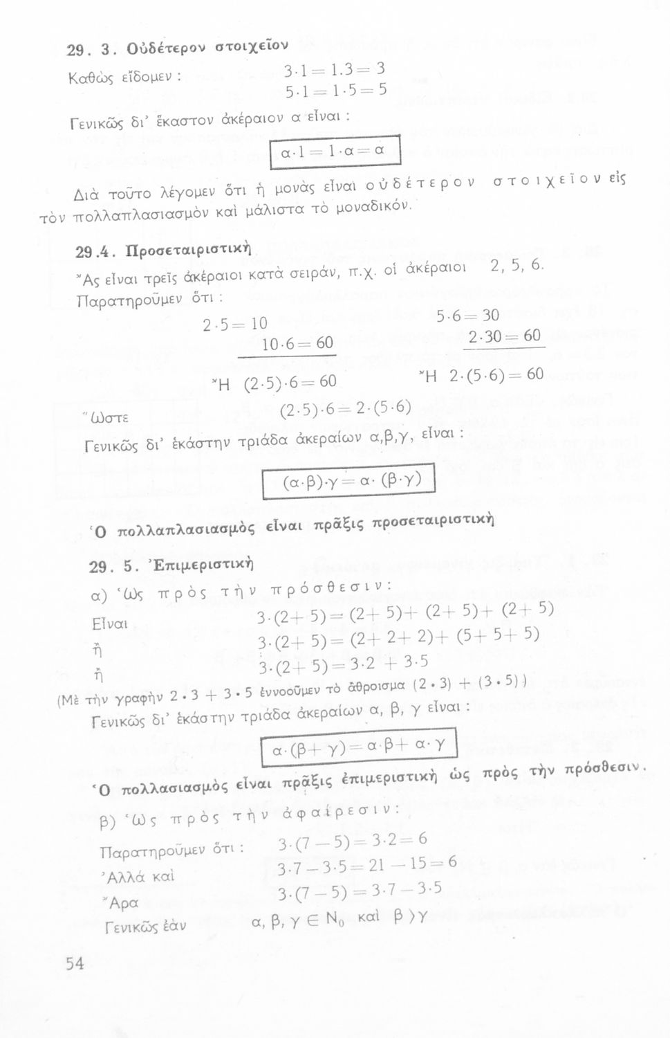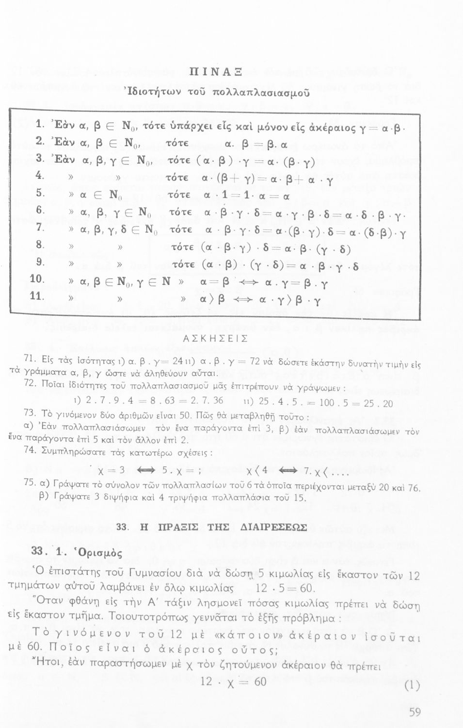 Σχολικό εγχειρίδιο Μαθηματικών Α' Γυμνασίου που περιέχει άλγεβρα με έμφαση στις αριθμητικές πράξεις με ακέραιους, δεκαδικούς και κλάσματα, και γεωμετρία με έμφαση στην επιπεδομετρία. Περιέχει και εισαγωγή στη θεωρία των συνόλων. Φέρει το σύμβολο της δικτατορίας.