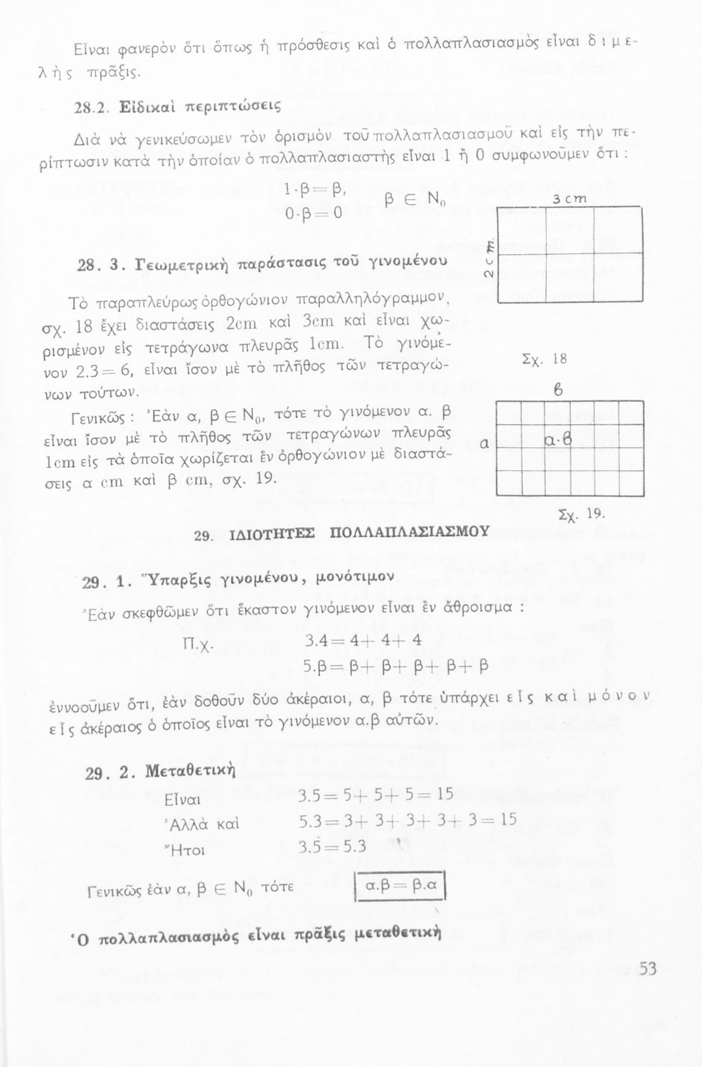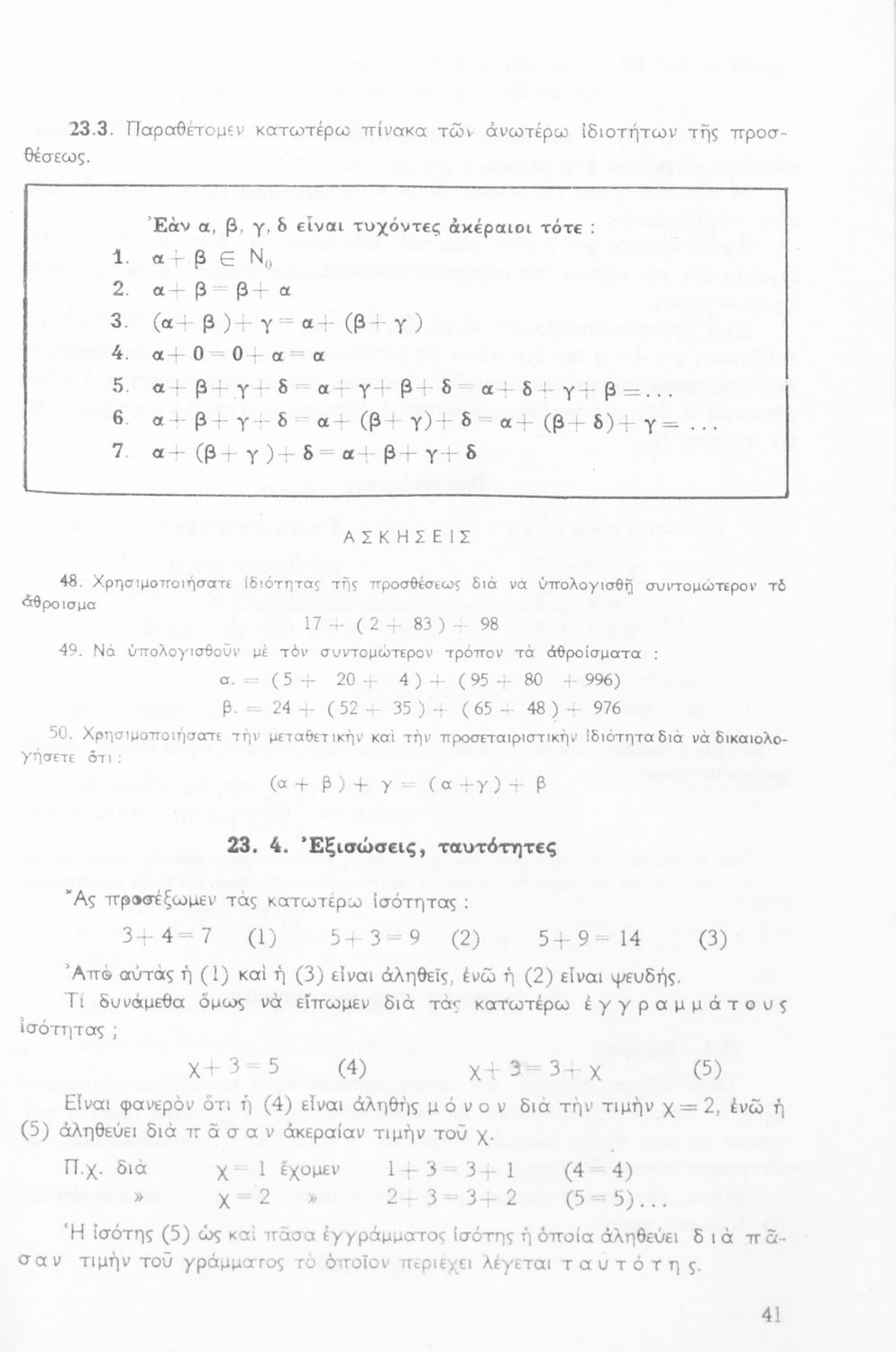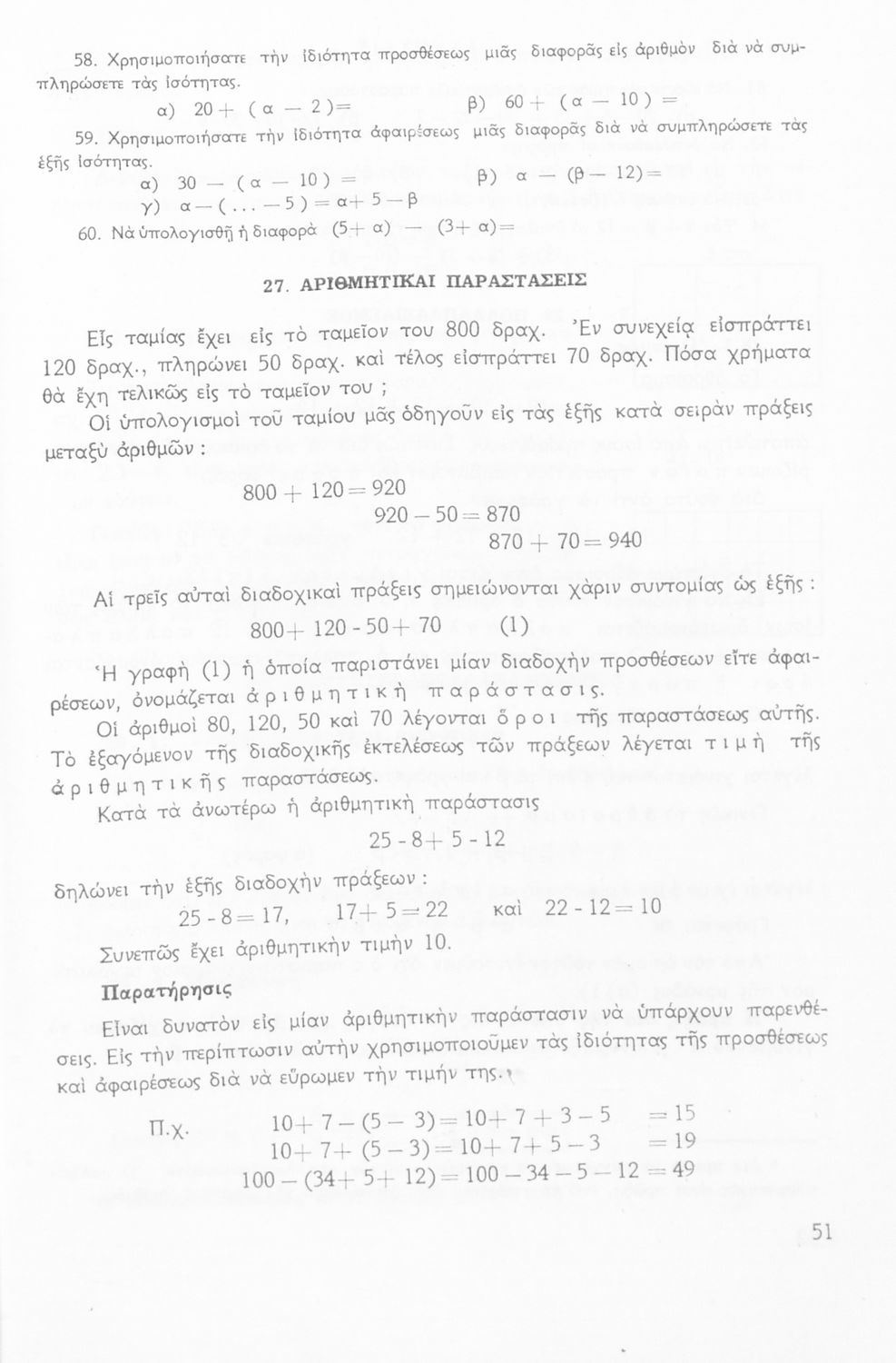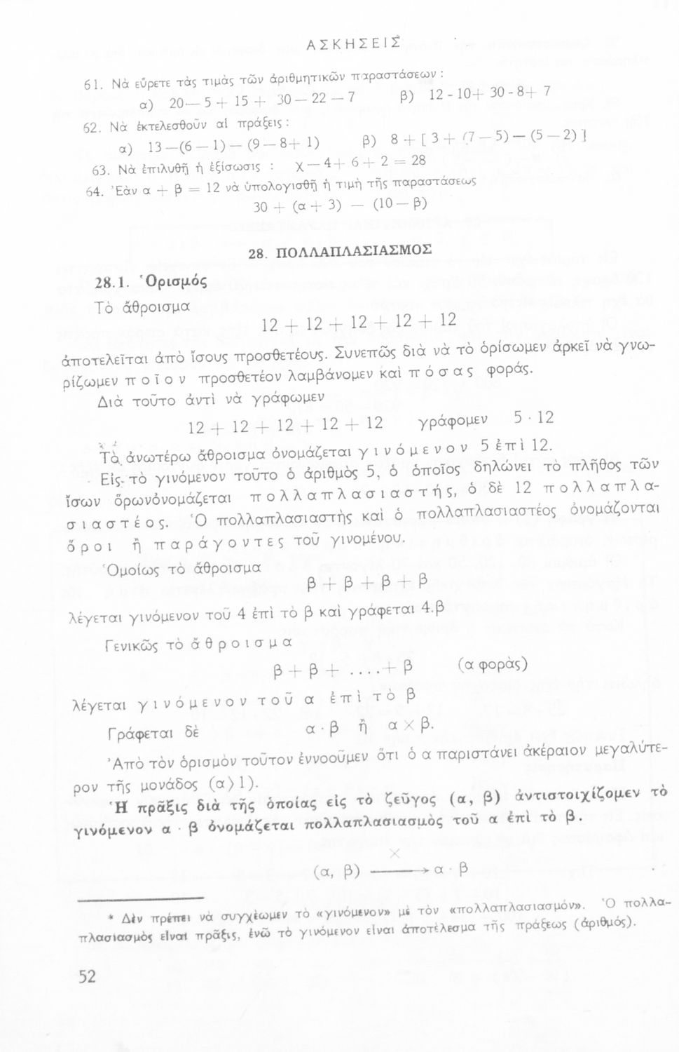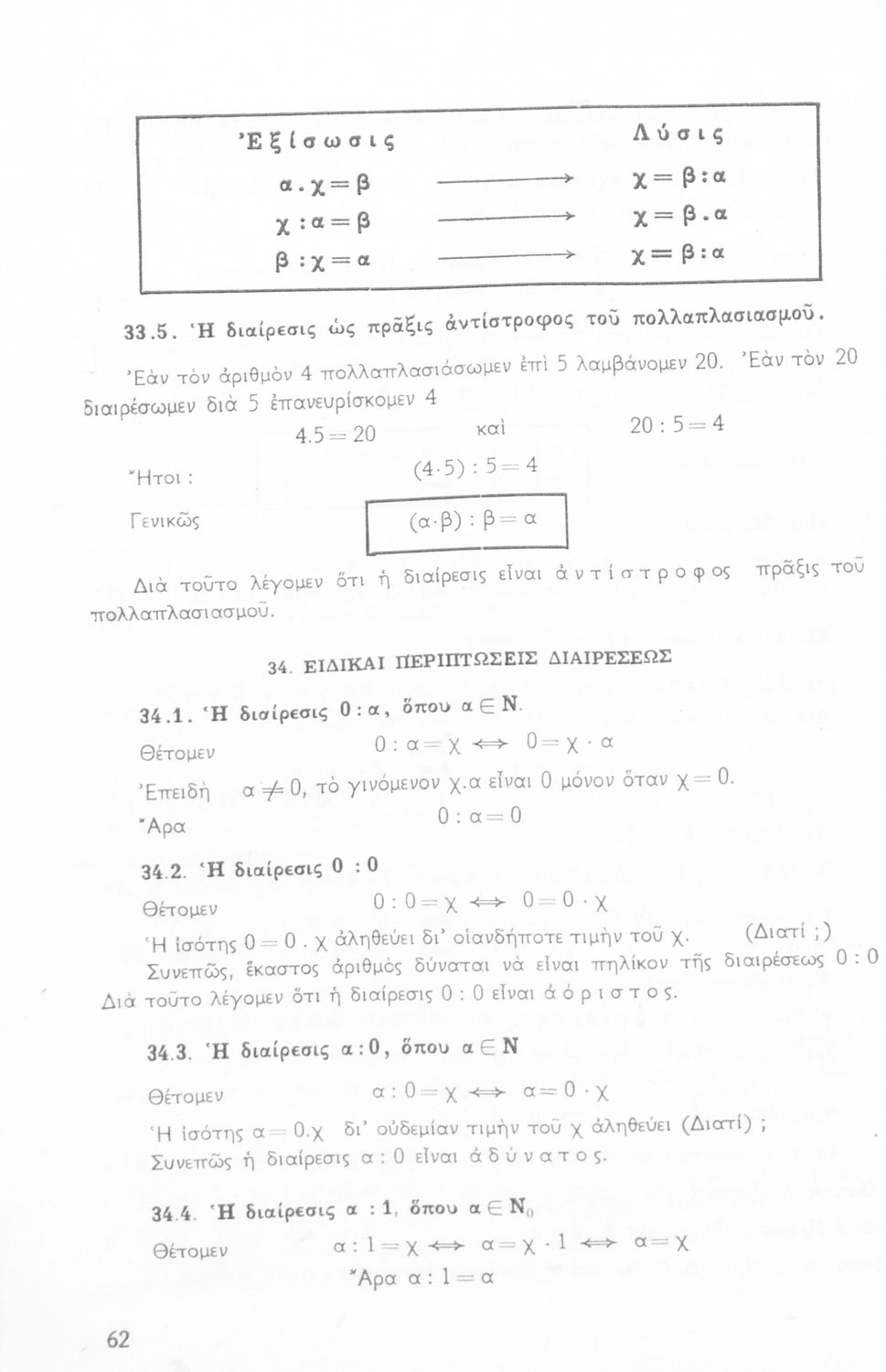 Σχολικό εγχειρίδιο Μαθηματικών Α' Γυμνασίου που περιέχει άλγεβρα με έμφαση στις αριθμητικές πράξεις με ακέραιους, δεκαδικούς και κλάσματα, και γεωμετρία με έμφαση στην επιπεδομετρία. Περιέχει και εισαγωγή στη θεωρία των συνόλων. Φέρει το σύμβολο της δικτατορίας.